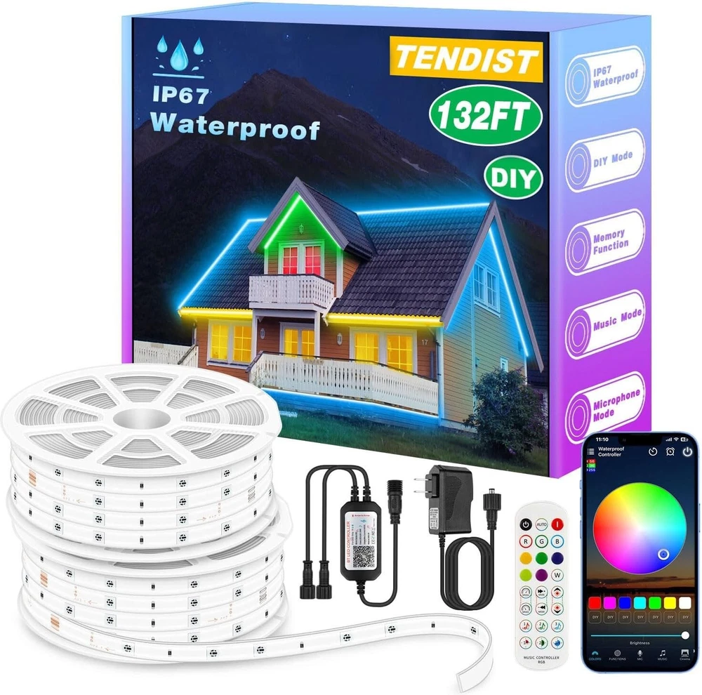 Free eBay listing template designed by dewiso.com 132ft Outdoor Led Strip Lights, IP67 Waterproof LED Light for Outside App Remote Control, RGB Music Sync Exterior Rope Light Strip for Pool, Patio, Deck, Christmas Lighting IP67 Waterproof Long Strip: The outdoor led has its light strip tubed in flat case and its controller upgraded to be waterproof, so light set is totally weatherproof and heavy duty. There are 66ft (1 roll), 132ft and 165ft (2 roll) for your choices. 2.4G Remote & App Control: The included remote supports 360° through-wall control and pairable with controller in app. You can also use Zengge app to control your outside led lights with more features such as group control, customizable dynamic modes, etc. Music Sync & Smart Timer: Use the music mode to sync your smart color changing exterior led lights with beats for holidays and parties. Set up timers to have the outdoor led strip lights turned on and off as scheduled. Versatile 24V Waterproof Strip: 24v low voltage is very safe for house landscape lighting, also brighter compared with 12V led strip. The light strip for outside is cuttable on the brown marks, perfect for patio, pool, pergola lighting and occasions like Christmas, Halloween, parties, etc. Easy Installation & Reliable Service: The water proof led lights is self-adhesive and the package includes extra accessories for reinforcement. The rope light strip comes with 24 month warranty. If any problem, please feel free to contact us. Waterproof light strip Waterproof controller with remote 24V Adapter Securing clips, zip-ties, user manual Waterproof light strip Waterproof controller with remote 24V Adapter Securing clips, zip-ties, user manual Special Feature Last setting memory, dimmable, auto on/off, Customizable dynamic modes, candle mode, IP67 waterproof strip and controller, Music sync, color pickingSpecial Feature Last setting memory, dimmable, auto on/off, Customizable dynamic modes, candle mode, IP67 waterproof strip and controller, Music sync, color picking