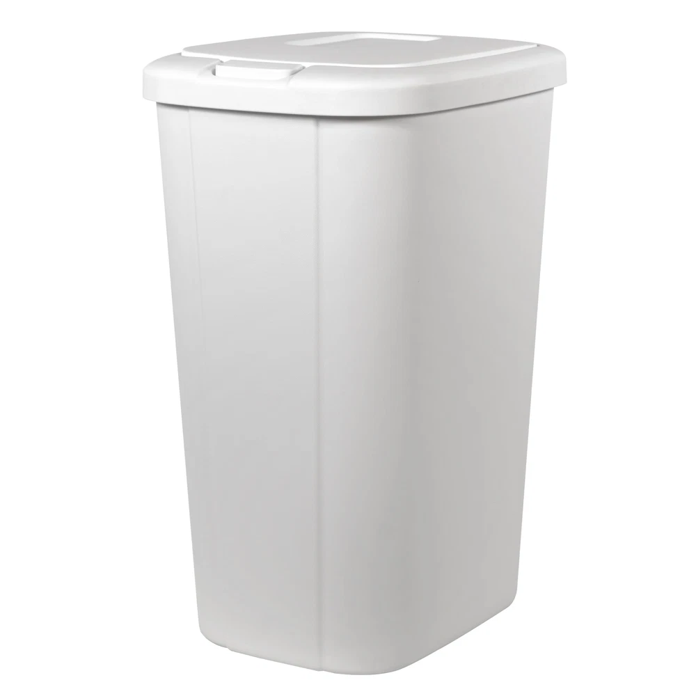 The touch lid plastic kitchen trash can in matte white has everything you need and nothing you don’t. The slim profile allows you to neatly tuck the bin away while still offering a large 13.3-gallon capacity. The spring loaded lid pops open with the simple touch of a button and clicks securely closed, helping to reduce odor. Plus, the trash bin is made of durable plastic to withstand daily use and can be easily wiped down when needed. This trash can will look great in your kitchen for years to come. The best part is, it fits a standard 13-gallon trash bag perfectly! Premium touch top button that opens spring-loaded lid Slim profile makes the most of your space Durable material to withstand daily use 12.8-in W x 15.8-in L x 23.1-in H