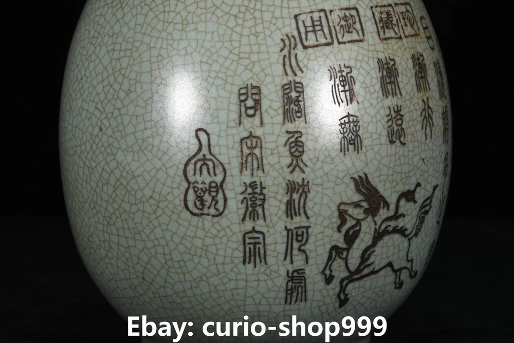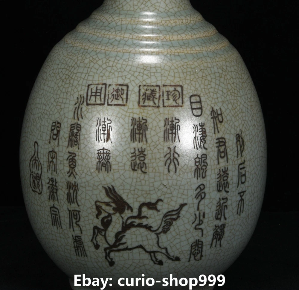 **** Welcome to our antique & Collectable Shop : Porcelain**** Description: Here is 13.4" Rare Song Dynasty Ru Kiln Porcelain Inscription Animal Pattern Bottle Vase.It is in good condition, and was created by skilled craftsmen in traditional style with fine handcrafts.This is a great piece of valuable collection, a valuable personal alter or a very good present. the handwork is very fine with incredible detailling. Don't miss out this chance to get it.Wish you good luck! Material : Ru Kiln Porcelain Size : Heigh t 13.4 Long 6.3 breadth (inch) Condition Perfect Condition. Perfect, with no scratc hes, flaws or repairs. Weight: 1.0 KG----included the weight of packing materials Shipping cost to all over the world countries in Free Honored Customers: We are selling the collectibles products and crafts in Beijing ,China since 1993 and collected them all over the world all the time . In our shop the bronze sculpture, animal, vase, urn, flowerpot,Incense Burner.Table chair sets. Militaria goods. buddha statues, Bodhisattva Statues, Buddhist Ritual Items etc is our speciality .Many of the items we sell come from our own personal collection and have been in our family for a very long time .My great-grandfather was the first in this family to start collecting art & antiques when he still lived in San Xi and Tibet around 1922 ,some of the paintings he once collected can now be seen in museums around the globe.We won't make money from t he shipping cost, if you dislike the item when you receive it,we can refund all of your money to you within thirty days. Please confidence for bidding . We recommend the combine shipping and offer you an big price discount if you order more items together ! 2023.09.02 四 号