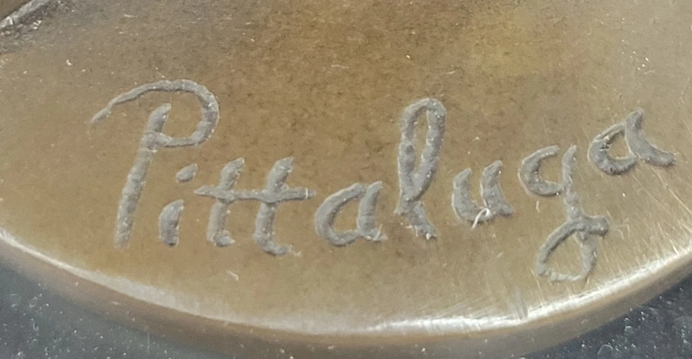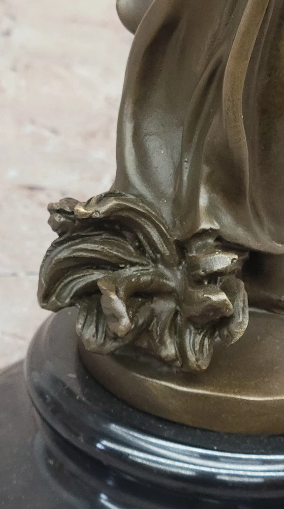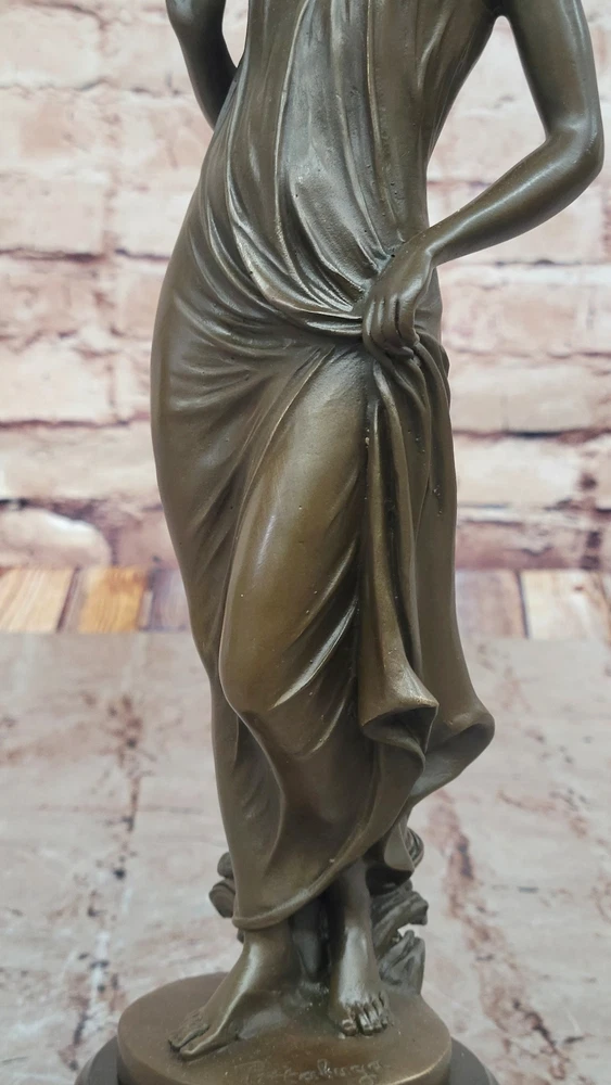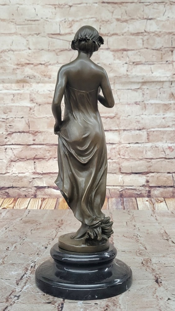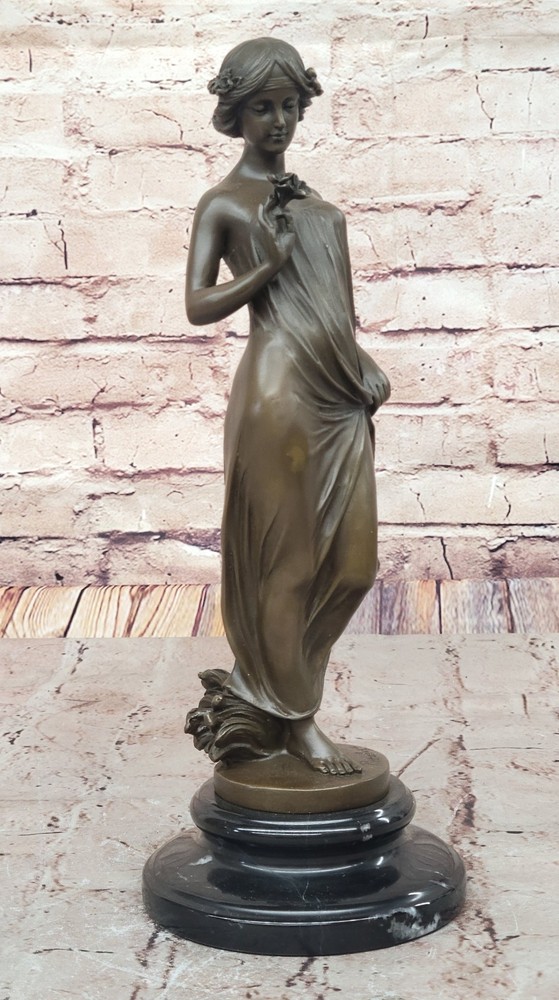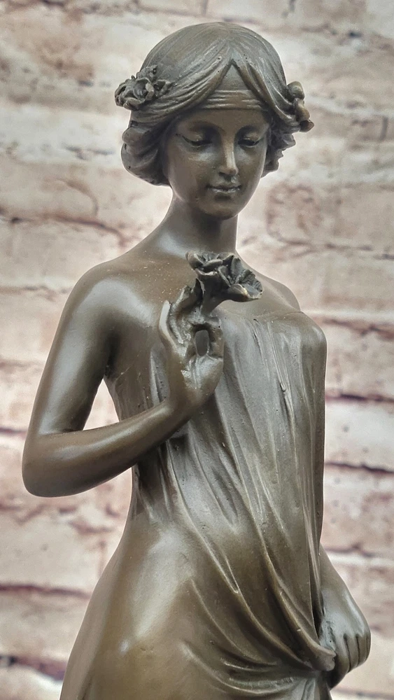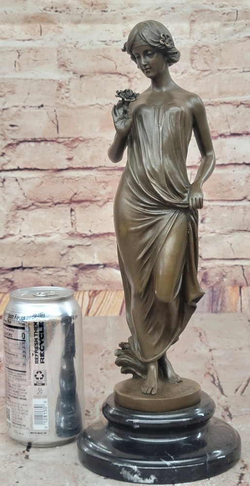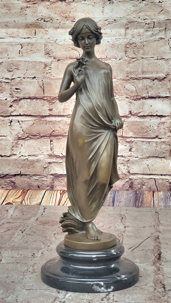 Condition : This sculpture is in perfect condition. Bronze Dimensions with Marble Base: Height 13.5" X Width 5" Marble Dimensions: Diameter 5" Height without base:12" Weight:7 LBS Inventory:23EP8965332 In this enchanting bronze sculpture, we are transported into a moment of quiet contemplation and gentle allure. The young lady depicted in this artwork stands poised, her gaze fixed lovingly upon a delicate flower held delicately in her hand. There's a sense of anticipation and quiet joy in her expression, hinting at the possibility of a cherished gift from an admirer. Her attire, an elegant and figure-hugging gown, adds to the overall sense of sophistication and grace. Crafted with meticulous attention to detail using the lost wax method, this sculpture is a testament to the artist's skill and dedication. The lost wax technique allows for the precise rendering of intricate features, from the gentle folds of the lady's gown to the subtle nuances of her expression. The sculpture is mounted gracefully on a sleek black marble base, adding an element of timelessness and refinement to the piece. The artist, Pittalage, has left their signature on this masterpiece, signifying its quality and artistic merit. This sculpture captures a timeless moment of beauty, elegance, and contemplation, making it an exceptional addition to any art collection. Whether you're an art enthusiast or simply appreciate the finer things in life, this bronze artwork invites you to immerse yourself in a world of grace and charm. Signed Artwork Girl Flower Bronze Sculpture Art Deco Marble Base Figurine Decor Video will open in a new window Using the eBay App? Paste link into a browser window: [isdntekvideo]