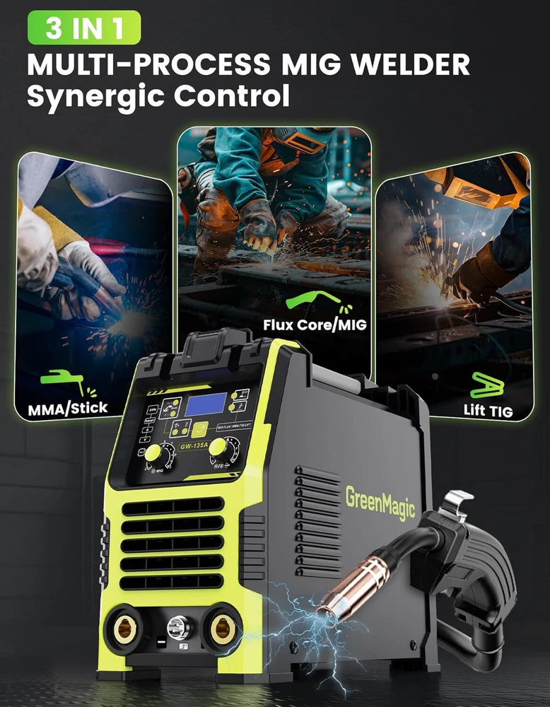 Powerful MIG Welding Machine: The versatile welder offers Three Modes, Flux Core Gasless MIG, Lift TIG, and MMA, suitable for various welding tasks. It provides a maximum output of 135 amps, supports gas-less flux-cored MIG wire, and handles wire sizes of 0.030", 0.035", and 0.040". With adjustable current and a 10-speed variable feed control, it ensures precise welding on carbon steel, stainless steel, and thicker materials. Synergic Control: The 3-in-1 MIG Welder employs advanced IGBT technology to automatically calibrate the recommended current and wire feed speed based on the selected welding wire diameter. This automatic adjustment simplifies the welding process, ideal for beginners and performing small repairs at home. Additionally, it can be fine-tune the voltage within a ±3 V range using the adjustment knob, ensuring that the MIG welder is versatile for both novices and experienced welders. Safe&Intelligent Design: Featuring overheat and overload protection, the 110V MIG welder automatically shuts down when it becomes too hot. A built-in fan continues to cool the unit for 1-2 minutes after shutdown, minimizes energy loss, ensuring efficient operation. Digital Screen Display: This 135A MIG Welding machine integrates advanced technology with an LED digital screen that displays voltage, current, and other parameters. This allows you to monitor and adjust settings in real-time without removing your helmet, enhancing efficiency and precision. Portable and Compact: The flux core welder combines high performance with a multi-application design in a compact 14 x 11 x 6 inch frame, weighing only 12 lbs, is highly portable, featuring a handle or shoulder strap for easy transportation. Wide Application: The Greenmagic wire welder is versatile, suitable for machinery manufacturing, sheet metal processing, automotive maintenance, iron processing, hardware work, and home DIY projects. It effectively welds mild steel, iron, stainless steel, and other metal materials.