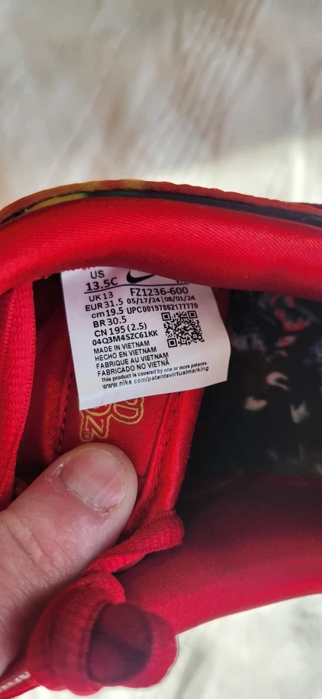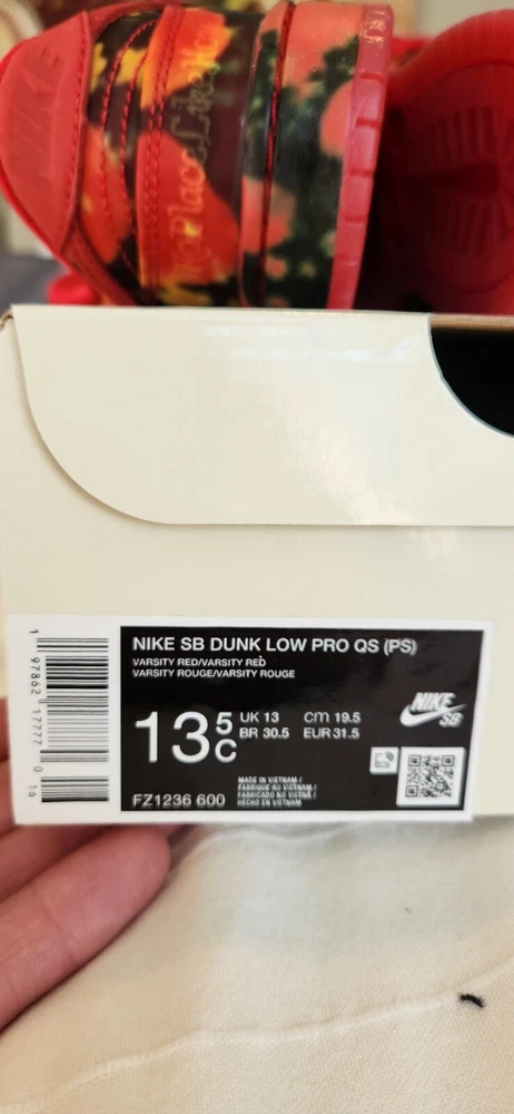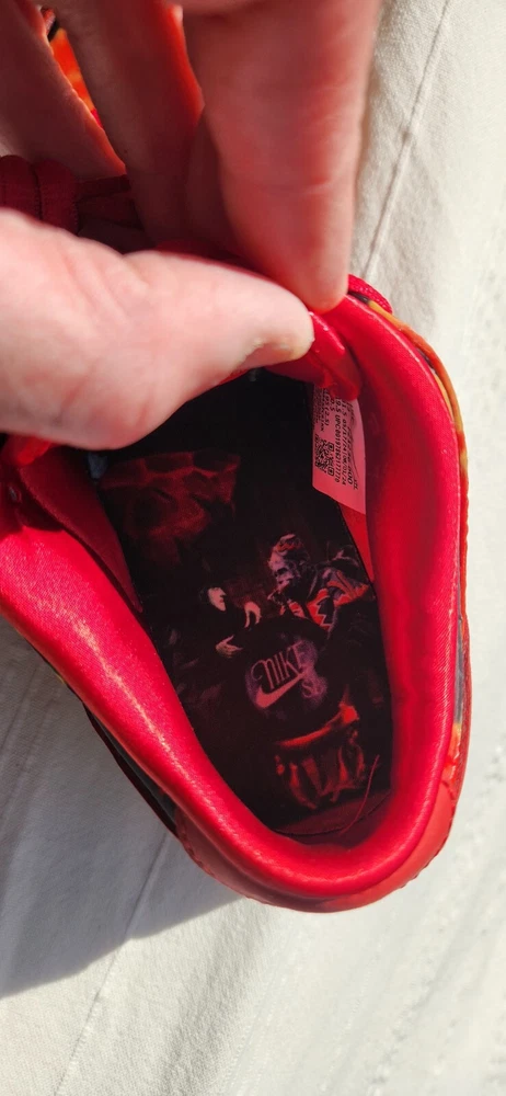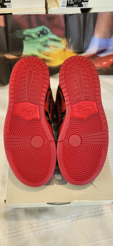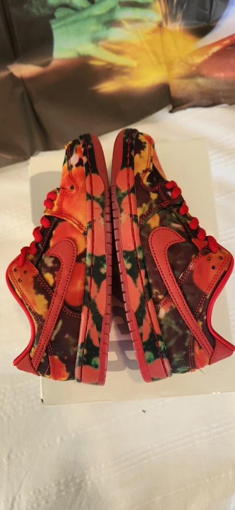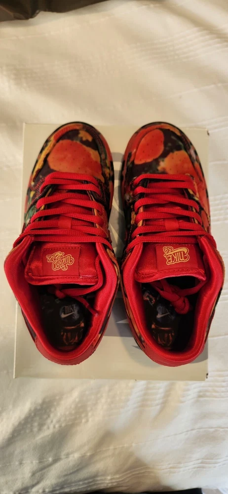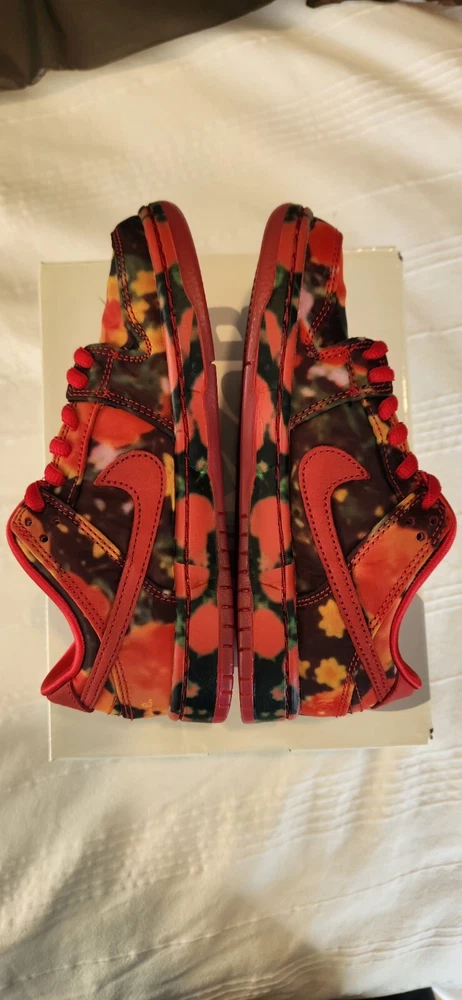 This Nike SB Dunk Low shoe is a must-have for any fan of the Wizard of Oz. The shoe features a red and floral pattern with a closed toe and lace-up closure. The shoe is made of leather/syn blended fabric with a foam insole and cushioned lining for comfortable wear. With a moderate cushioning level and arch support, this shoe is perfect for any occasion, whether it's for travel, activewear, wedding, party, casual, formal, christening, workwear, or business. The shoe is also great for sports such as motorcycle, boxing, typing, driving, basketball, bodybuilding, running & jogging, gym & training, track & field, walking, weightlifting, school, skateboarding, or racing. This limited edition Nike SB Dunk Low Pro shoe is available in a size 13.5c with fast shipping.