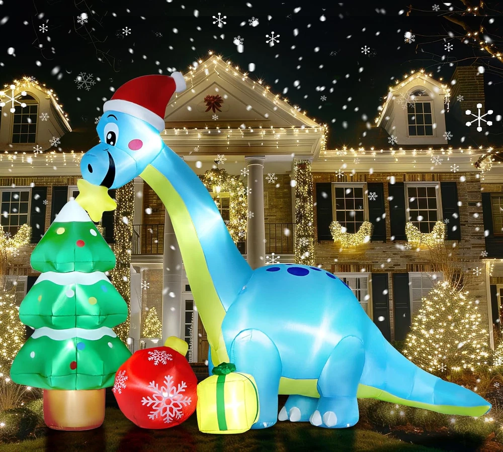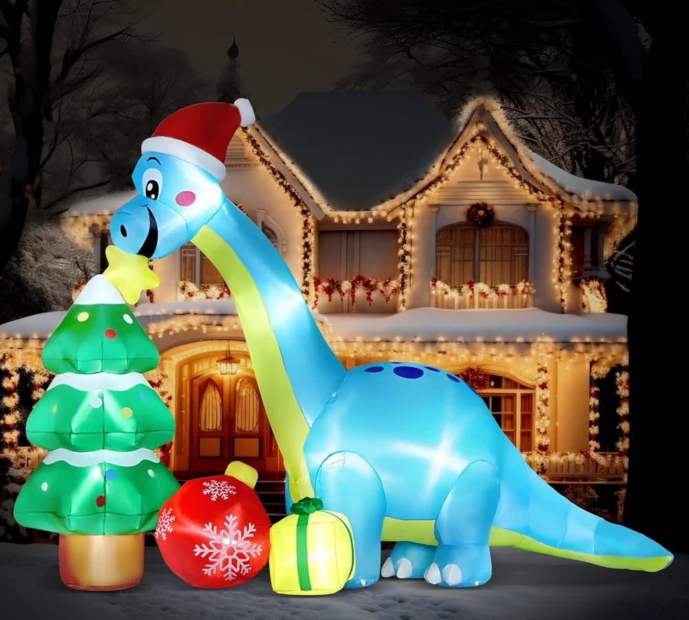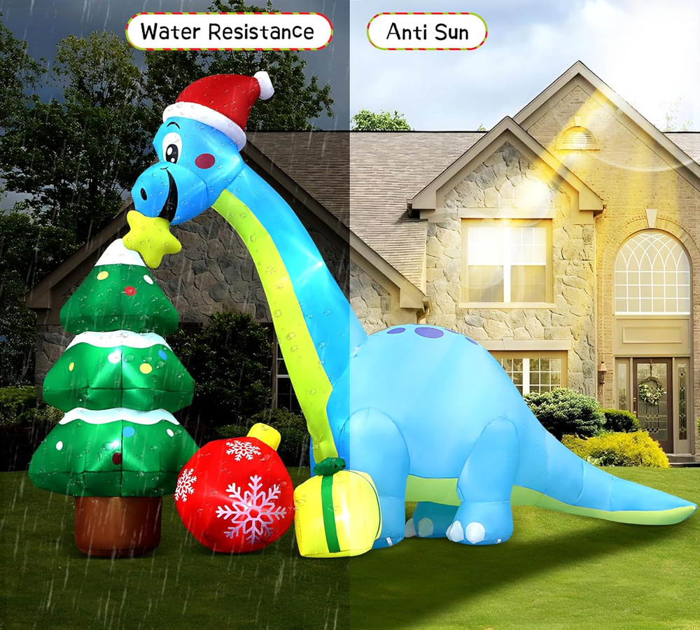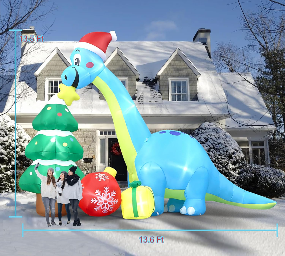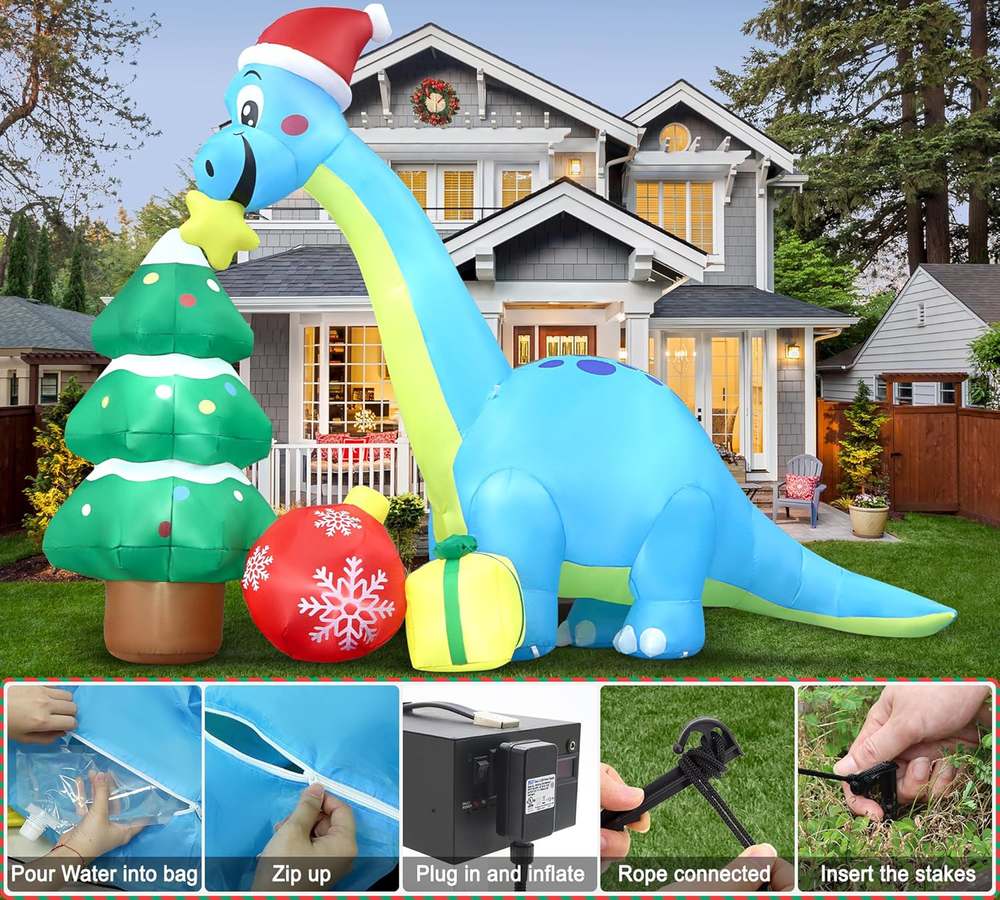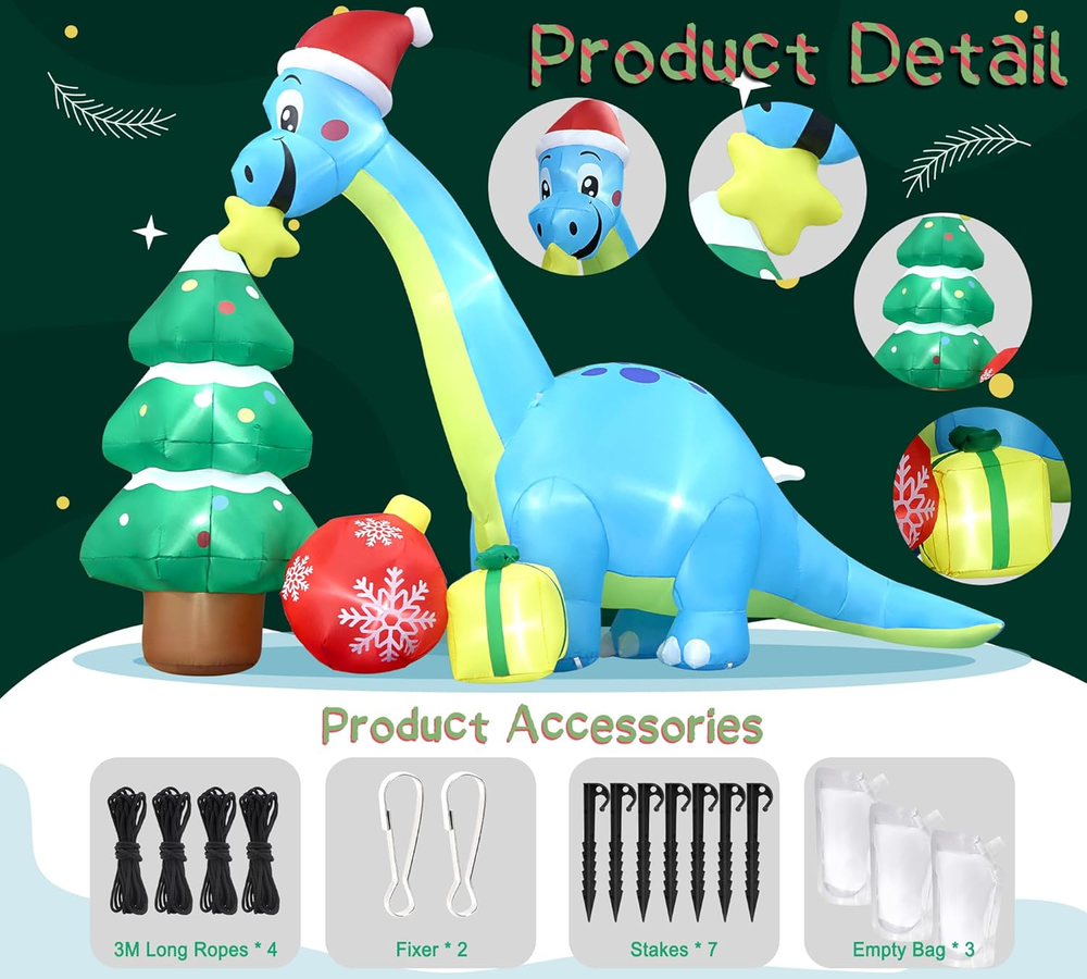 UNIQUE INFLATABLE DINOSAUR DESIGN: The cute Christmas inflatable is designed with a huge blue dinosaur that holds a Christmas star in his mouth with the huge Christmas tree and receives the gifts. Expressing that everyone can receive their favorite gifts at Christmas. PACKAGE CONTENTS& DIMENSION: The package includes 7 pcs stakes, 4ps fixed ropes in 3M long, 3 pcs empty bags, and built-in Led lights. The length is 13.6 Ft and the height is 13.5 Ft. GIANT&EYE-CATCHING: Built-in bright LED lights, lit up the yard festively in a Christmas atmosphere . The vivid color inflatable dinosaur-r makes your yard a big hit around neighbors and attracts the kids. The kids & passerby will be attracted by this huge inflatable decors. EASY TO USE: Put this inflatable in an empty place, get it in charge, and pour water into the water bags, and use them to make the Christmas inflatables dragon stand well. Just plug in a few seconds to inflate, it will blow up and full soon Easy to secure the inflatable decors with ropes and ground stakes. MATERIAL: Made of water resistance and windproof polyester fabric, no need to worry that this inflatable will fly away with the wind because it has attached stakes & ropes & water bag to fix it. Product description 13.6 Ft Long Giant Christmas Dragon Inflatable Decorations Great to Decorate in Day or Night Eye-catching to Decorate in front of Your Home 13.5 Ft Tall & 13.6 Ft Long & Accessories to Help Stand Perfectly Originally Design by Angela&Alex/ Built-in Powerful Fan/ Bright Lights Giant 13.6Ft Christmas Dragon Inflatable With Christmas Tree & Christmas Gifts Very suitable for you to decorate Christmas