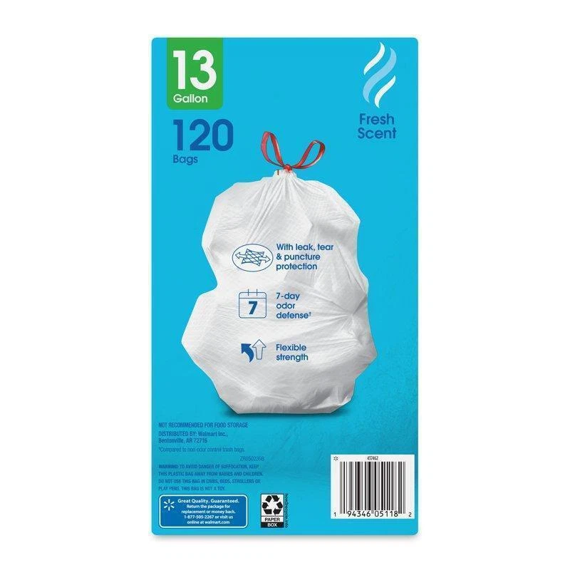 You may also like StepOn Wastebasket 11.9Gal Plastic Space Efficient Kitchen Bathroom Indoor Use 27.45 USD 28.89 USD Free shipping 5% off Plastic Step Trash Can 13 Gallon Touchless Lid Kitchen Office Waste Bin New 49.11 USD 51.69 USD Free shipping 5% off Motion Sensor Trash Can 13 Gallon Touchless Operation Soft Close Durable Plastic 42.66 USD 44.91 USD Free shipping 5% off Portable Trash Bag Holder Collapsible Garbage Bin Camping Parties 13 Gallon New 24.04 USD 25.31 USD Free shipping 5% off 3 Pack Slim Plastic Trash Can 2.6 Gallon Soft Close Waste Basket Indoor Outdoor 31.34 USD 32.99 USD Free shipping 5% off Stainless Steel Trash Can W/ Sturdy Foot Pedal Kitchen 20 Gal Anti Slip Base Hot 96.9 USD 102.0 USD Free shipping 5% off Touch Top Trash Can 13.3 Gallon Slim Kitchen Waste Bin Durable Plastic 2 Pack US 39.87 USD 41.97 USD Free shipping 5% off Hands-Free Step-On Trash Can Slim Oval Wastebasket Easy Clean Indoor Utility New 17.64 USD 18.57 USD Free shipping 5% off 10.25 Gallon Plastic Trash Can Wastebasket Space Efficient Easy Clean Indoor Use 18.37 USD 19.34 USD Free shipping 5% off 10.5 Gallon Slim Kitchen Step Trash Can Soft Close Hands Free Disposal New 56.97 USD 59.97 USD Free shipping 5% off Soft Touch Ribbed Plastic Wastebasket 1.98 Gallon Indoor Trash Bin Black New 19.1 USD 20.1 USD Free shipping 5% off Plastic Step-On Trash Cans Receptacle Anti Slip Base Wastebaskets Garage 17 Gal 101.02 USD 106.34 USD Free shipping 5% off Take your trash out with ease with these Great Value Strong Flex 13-Gallon Tall Kitchen Drawstring Bags with Fresh Scent. These Great Value kitchen bags are made with strong flex material designed to resist rips and tears even with maximum loads. These white bags feature a convenient drawstring closure that makes them easy to lift, carry and toss away. Simply pull up on the drawstring to close the trash bag and then knot the drawstring for extra security. The bags feature a fresh cotton scent to help mask the smell of stinky garbage and the 13-gallon size is perfect for all of your kitchen needs. They are sold in a 40-count box so it's easy to stock up for continued use. Take out the trash with Great Value Strong Flex Tall Kitchen Drawstring Bags with Fresh Cotton Scent. Great Value products provide families with affordable, high-quallity grocery and household consumable options. Wtih our wide range of product categories spanning grocery and household consumables, we offer you a variety of products for your family's needs. Great Value, 13-Gallon, 120 Bags Convenient drawstring closure makes them easy to lift, carry, and toss away Dual action odor control blocks and neutralizes odors Leak, tear, and puncture protection Perfect size for all your trash needs You may also like 21" Hardside Carry On Luggage Suitcases Expandable Spinner Lightweight Gray New 112.58 USD 118.5 USD Free shipping 5% off 25QT Ice Chest Cooler W/ Bail Handle Bottle Opener Comfort Sturdy Outdoors Green 98.33 USD 103.5 USD Free shipping 5% off Woven Storage Baskets W/ Round Handles Extra Large Natural Water Hyacinth Boat 34.16 USD 35.96 USD Free shipping 5% off Side Table Over The Bed Non-Tilt Overbed Table Adjustable Lightweight Bedroom US 79.0 USD 83.16 USD Free shipping 5% off Precision Digital Pet Bathroom Scale Small Animal Dog Cat Weight LCD Display New 56.34 USD 59.31 USD Free shipping 5% off Organic Whole Rye Grain Dried Wheat Berries Flavorful Nutritional Bag 25 Lbs New 72.58 USD 76.4 USD Free shipping 5% off 2 Pack 16 Qt Square Milk Crate Storage Organize Heavy Duty Kitchen Plastic Black 41.07 USD 43.23 USD Free shipping 5% off 4 Tier Fabric Shoe Cubby 16 Compartment Closet Organize Stackable Entryway Black 37.04 USD 38.99 USD Free shipping 5% off 8 Panel Play Yard Baby Playpen Durable Free Standing Indoor Outdoor Plastic New 132.51 USD 139.48 USD Free shipping 5% off Mobile Tool Storage Stack System Tool Box W/ Dividers Organizer Durable Plastic 39.81 USD 41.91 USD Free shipping 5% off Soft Microsuede Adult Saucer Chair Foldable Steel Frame Comfortable Lounge New 64.09 USD 67.46 USD Free shipping 5% off 65 In TV Stand W/ Storage Cabinets & Shelves Entertainment Center Console Cherry 181.25 USD 190.79 USD Free shipping 5% off