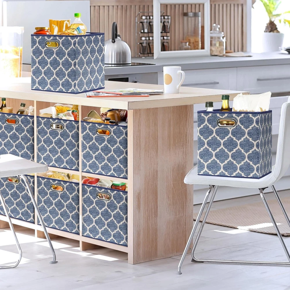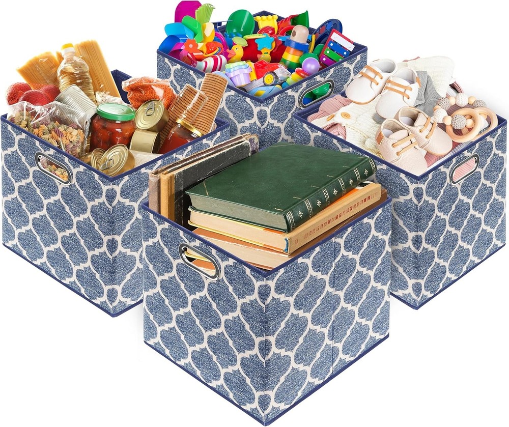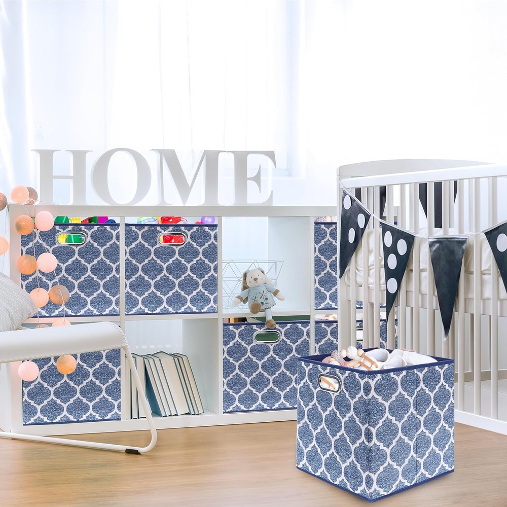 Space-Saving Design: Collapsible fabric bins with a stylish print; foldable for compact storage when not in use Durable Structure: Reinforced with 5 heavy-duty cardboards, including the bottom, for sturdy support on all sides Lightweight & Sturdy: Designed for easy organization; perfect for storing clothes, toys, books, and household items Metal Grommet Handle: 2-side grommet handles for a sleek look and easy access; seamlessly fits into most cube storage organizers Perfect Size: Measures 13" L x 13" W x 13" H; ideal for closets, shelves, and cube storage units
