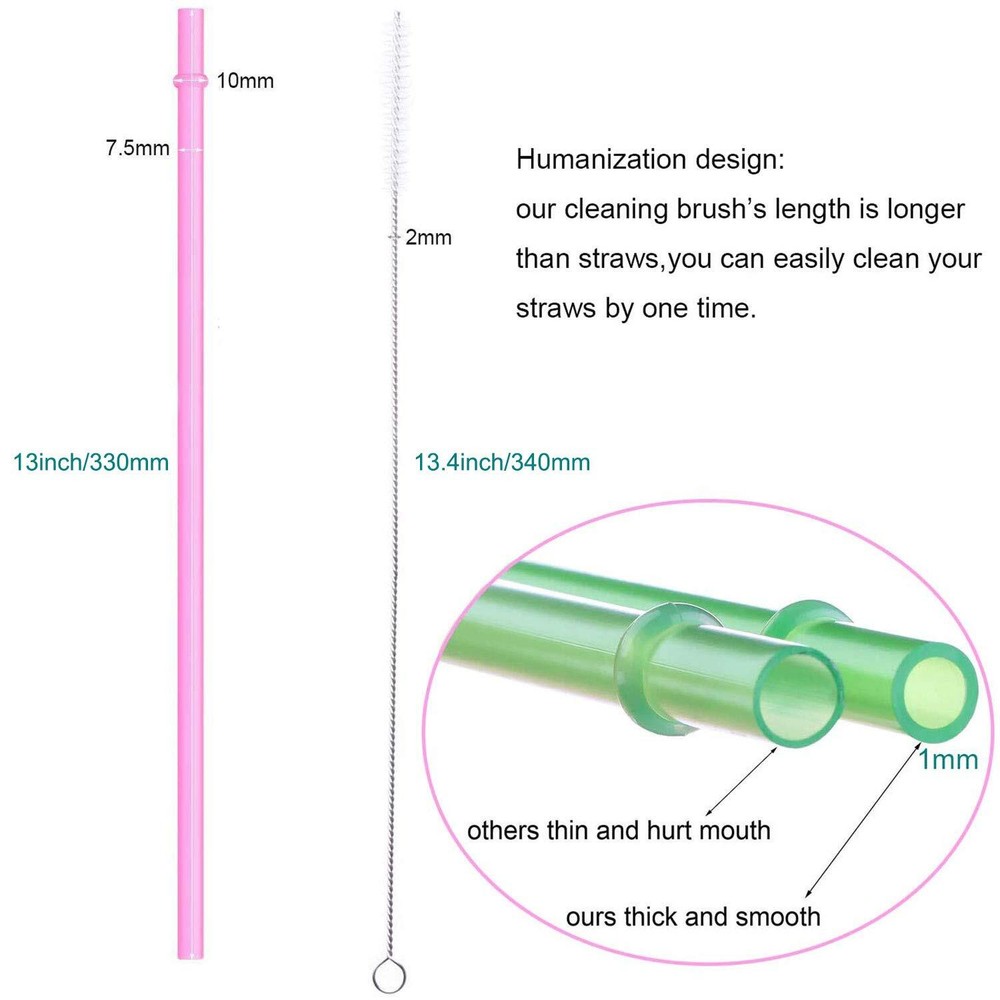 Why Choose Reusable Drinking Straws? BPA-Free insist that all the straws material is BPA-Free.Some research has shown that exposure to BPA, an industrial chemical, is a concern due to possible health effects on the brain, behavior, and the prostate gland of fetuses, infants, and children. More Thicker all straws thickness is 1mm,we open the mold by ourselves,we can made more thicker and durable straws than others ,you can find that the conventional thickness of straws on the market is only 0.5mm,It cant use for a long time. Humanization design all straws cleaning brush is longer than straws,you can easy clean your straws by one time.others use short size cleaning brush than straws,hard to clean your straws. More focused focus on the production and sales of drinking straws since 2013. So far, we have produced more than 100 kinds of straws, enter store, there are various colors and (5-15inch) size straws for you to choose. Size13” long, 0.3” outside and 0.23 inside diameter ,Package Includes 12 reusable straws,plus one free cleaning brush Extral long length for big mason jar, Tervis, Signature, Yeti, Rtic, S’well, Starbucks,40 oz 46 oz Tumblers mug Made of food grade hard thick PP plastic material, BPA free,Dishwasher safe Reusable Plastic Drinking Straw Bar Straw Various Colors for Wedding and Party Please wash before first use ! better for environment than disposable straws