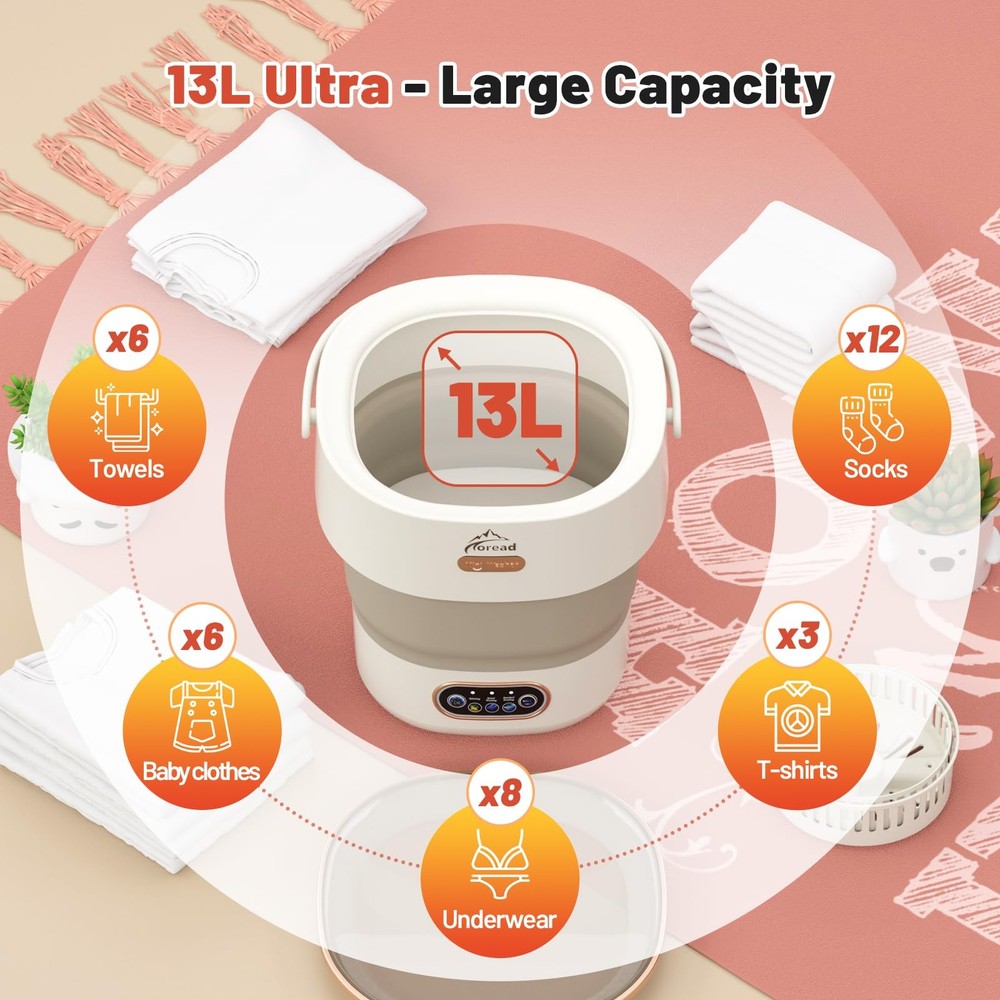 Portable Washing Machine, With a one-button start and an easy-drain hose, it’s designed for convenience. This mini washer features a 13L capacity and 3 wash settings: Quick Wash (5 min), Slow Wash (10 min), and Spin Dry (3 min), Made from durable TPE and PP materials, With compact dimensions of 12.95" x 12.60" x 13.19" and a lightweight design at 5.29 lbs, it’s perfect for small bathroom and travel carry. Ideal for washing underwear, socks, baby clothes, shoes, children's toys, and women's makeup items, this portable washing machine eliminates the need for hand washing, making life easier and more convenient! 【Designed for Cleaning Small Items】 This mini portable washing machine is perfect for energy-efficient and cost-saving laundry. Ideal for washing underwear, socks, baby clothes, shoes, children’s toys, makeup tools, pet supplies, and more, it offers a convenient and hygienic solution for your small laundry needs. Say goodbye to hand-washing socks and enjoy cleaner, healthier laundry with ease. 【13L Large Capacity】 Compact yet spacious, the washer measures 12.95" x 12.60" x 13.19" when opened and holds up to 8 underwear, 12 socks, 6 towels, 6 baby clothes, or 3 T-shirts per load. Weighing just 5.29 lbs, it’s made from durable TPE and PP materials with an electroplated coating. The foldable design resists wear and can withstand up to 10,000 folds without deforming. 【3 Washing Modes】 Choose from Speed Wash (5 min), Standard Wash (10 min), or Spin Dry (3 min) with a single button for all-in-one operation. For heavily soiled items, repeat the wash cycle as needed. Tested to effectively remove stubborn stains, this washer adapts to your laundry demands with ease. 【Powerful Cleaning Performance】 Equipped with a high-quality generator and dual-directional turbo vortex technology, the machine ensures deep cleaning without pulling or damaging your garments. For best results, pre-soak clothes for 20 minutes before washing. 【Flexible Drainage Hose】 The extendable drainage hose at the bottom eliminates the hassle of manual wastewater disposal. Perfect for use in the bathroom while you shower, this washer is also travel-friendly. Fold it up and pack it in your suitcase to avoid public laundromats on trips, ensuring clean and private laundry care anywhere you go.