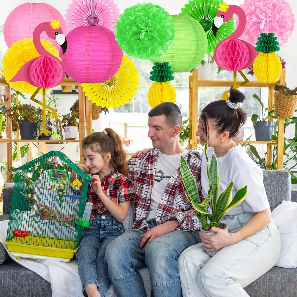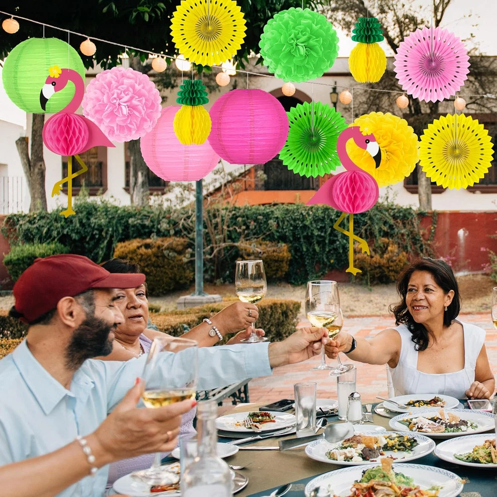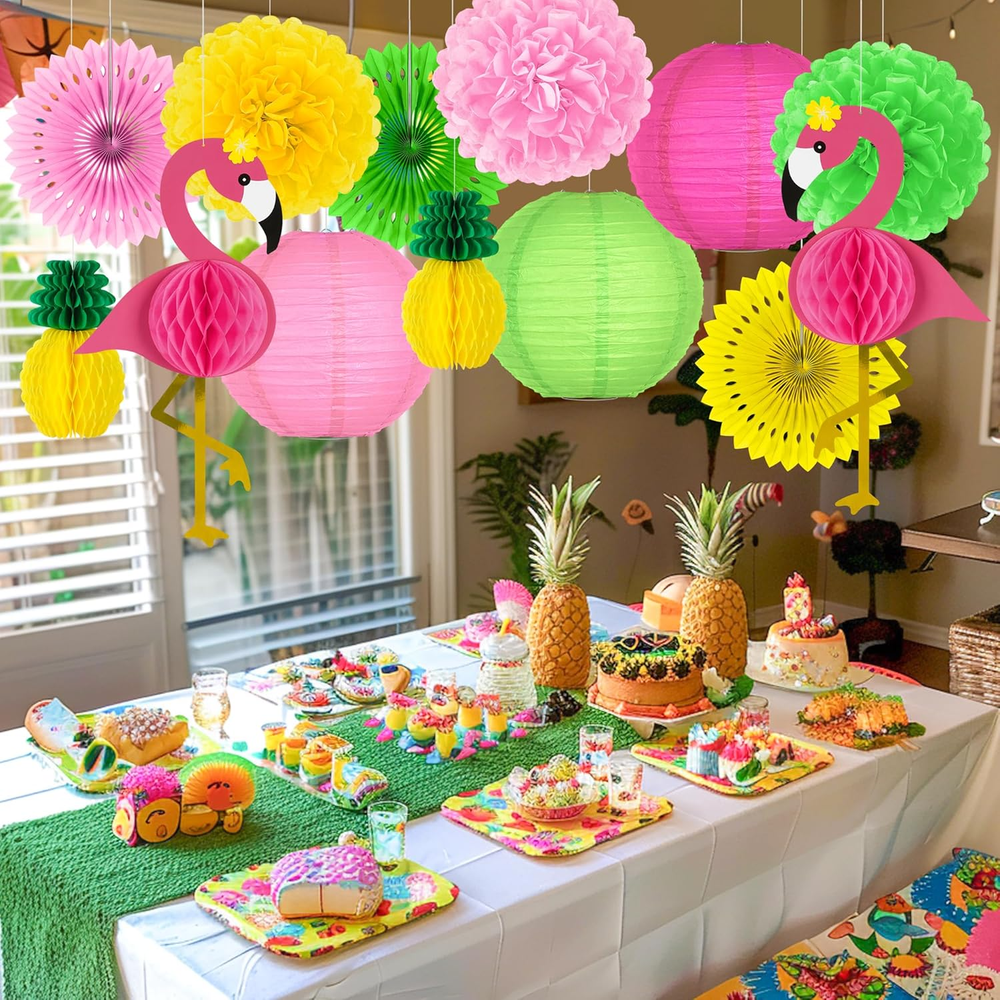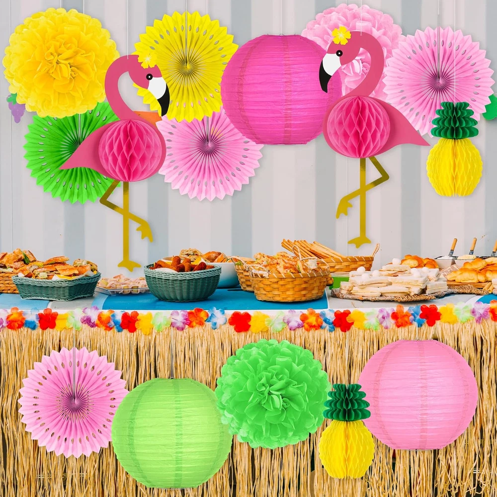Package Includes: The Hawaiian party decorations have 2 pcs hanging flamingo honeycomb, 2 pcs pineapple honeycomb, 3 pcs paper flowers, 3 pcs paper fans and 3pcs ball lanterns in green, pink and red colors. Easy to Use: You can learn how easy it is to use luau party decorations in the pictures, the instructions inside the package and in our video. There are strings on top of each summer decor, very convenient. High Quality: Made of high quality cardboard, pulp paper, our flamingo party decorations are sturdy, easy to assemble, easy to store, lightweight and reusable. Color Blend: Each tropical decorations‘ hue adds a romantic and cozy ambiance to your Hawaiian party. Rich and vibrant, they offer a dazzling visual experience, while the exquisite craftsmanship ensures a charming design that will captivate all. Widely Occasions:Our Hawaiian themed party decorations create the perfect atmosphere for any occasion. Perfect for a variety of summer events, such as tropical birthday parties, luau-themed decorations, baby showers, and summer beach gatherings. Product description Easy to Hang Each Flamnigo Party Decorations comes with a string for you to hang it anywhere! Bright Colors There are 3 styles colors in paper fans and lanterns to decorate your party. 3D Design ALL hawaiian party favors are 3d, which look just like the real thing. Easy to Use Simply peel off the sticker at the connection or use a paper clip to get a summer decor.
