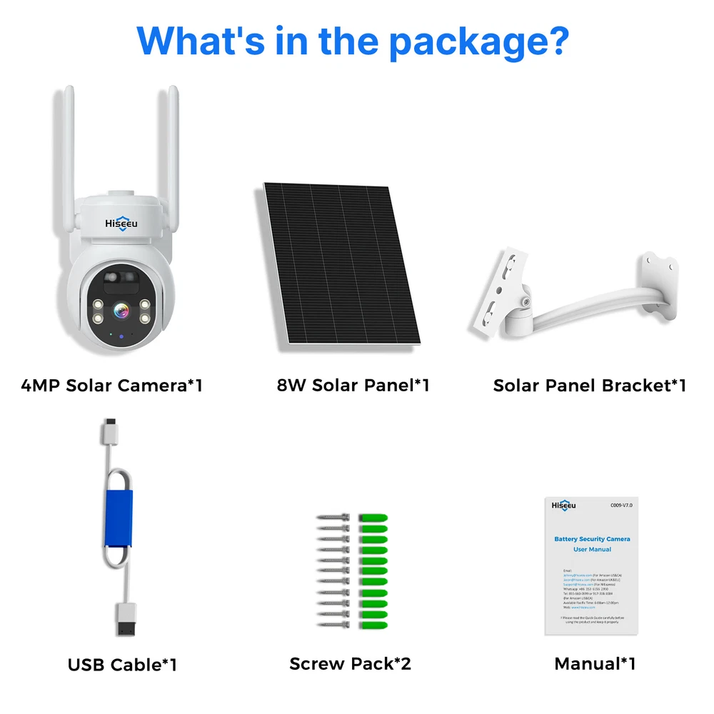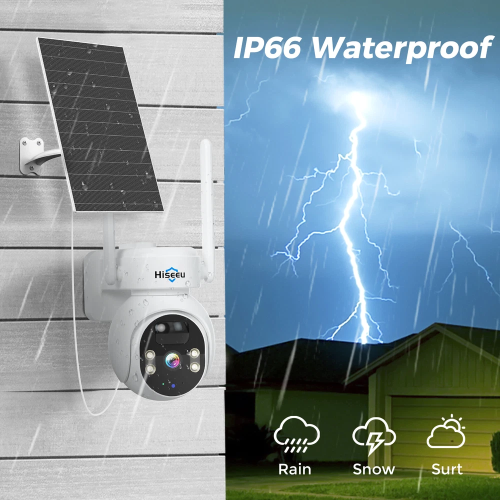 【 24/7 Recording & Quickly Charge 】 The solar camera comes with two 8W solar panels, can be fully charged within 3-5 hours. Three 6000mA battery support 24/7 recording, it won't be in a dormant mode. Please note, if battery level below 30%, it will switch to events recording. 【 100% Wire-Free & Easy to Install 】 The 24/7 Recording camera is powered by solar panel, it is 100% wireless, no need power cable, no need socket. 【 Real Time View & Smart Playback 】 Add this home security camera to APP, you can view everything around your house no matter where you are. The camera supports 128B SD card(SD card not include) max, can store video for at least one month. 【 PIR Detection & 360° View 】 Don't worry about receiving false positives caused by flying insects etc, it will push an alarm notification to you when detect humans' movement. 120-degree field of view and PTZ feature provide you with no blind spot surveillance. 【 Color Night Vision & Two-Way Talk 】 You won't miss any event around your house with CMOS image sensor, two modes of night vision system lets you see all the details within 65 feet clearly even at night. And you can chat with Neighbors or visitors, also can scare off unwelcome people through light alarm and sound alarm. 【 Compatible with "Hiseeu" NVR & Multi-user Sharing 】 The wireless security camera can work with Hiseeu NVR system, share the camera to you family through "Eseecloud" APP. All images are encrypted, no one can access the information without your consent.