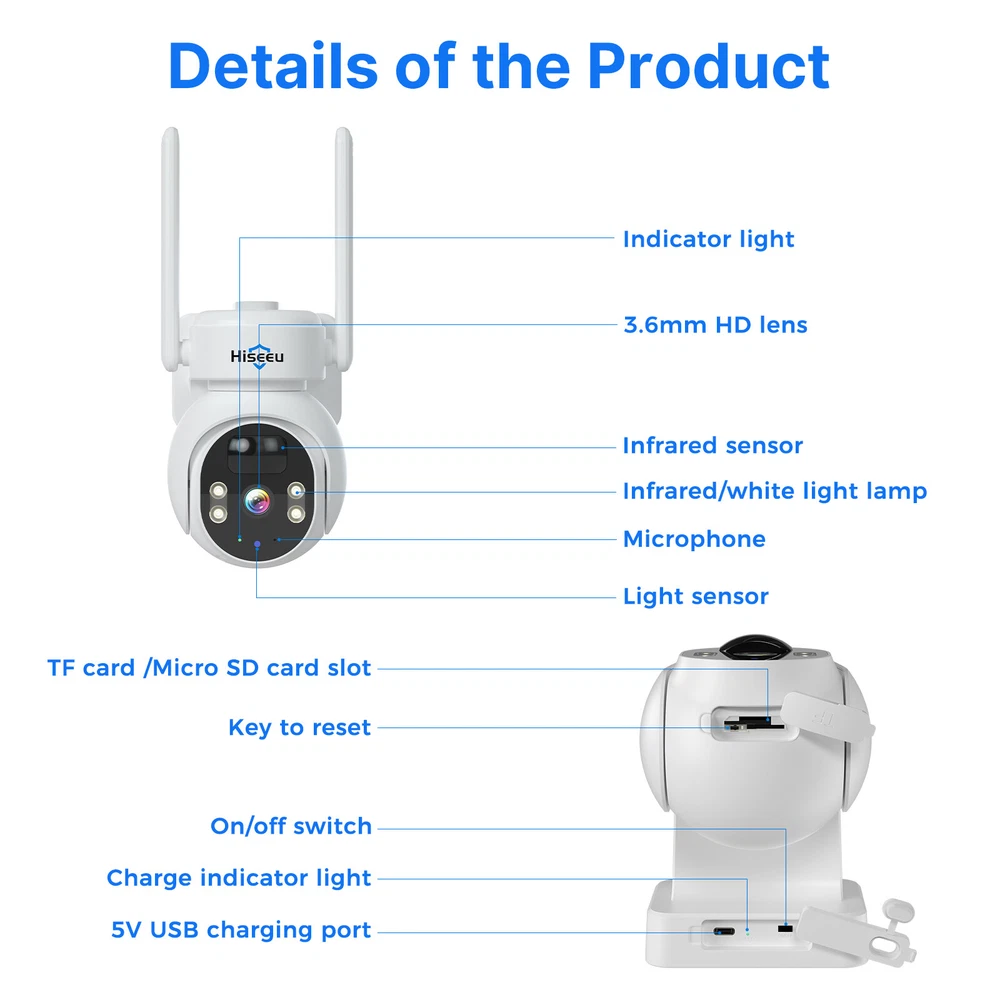 System: Lite OS SNR: ≥52dB Imaging Sensor: 1/2.9”Full HD CMOS Manufacturer Warranty: 1 Year Features: Outdoor/Weatherproof, Battery, Solar Panel, PIR Detection, 100% Wire-Free, Two-Way Audio, Color Night Vision, Rechargeable, Wi-Fi Item Weight: 3.17 lbs Battery: 3 *lithium batteries Solar Panel: 8W Color: White Country/Region of Manufacture: China Brand: Hiseeu Location: Outdoor & Indoor Night Vision Range: 65 Feet(infrared) Connectivity: Wireless Product Dimensions: 7.5 x 5.5 x 9.5 inches PIR Detection Range: 0~10m Lens: 3.6mm Wireless Network: IEEE802.11b/g/n 2.4G App: EseeCloud Model: SmartCam Storage Capacity: Support up to 128GB Maximum Resolution: 2560*1440 Voltage: 5 Volts (DC) Operating Temperature: -10℃ ~+50℃ Color Mode: Color Day&Night Vision Operating Humidity: ≤80%RH Type: Surveillance Camera Year Manufactured: 2024 Power Source: Solar panel + built-in lithium battery power supply Storage Type: Micro SD card/cloud storage