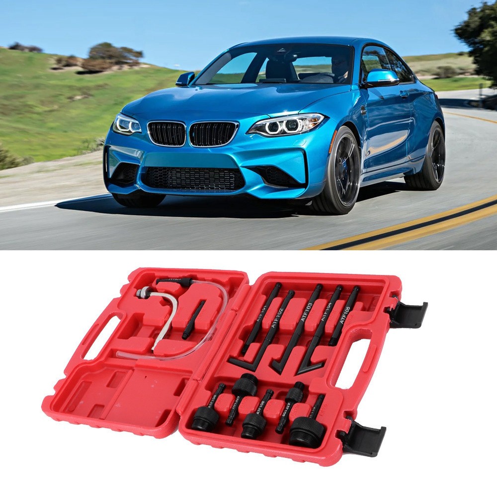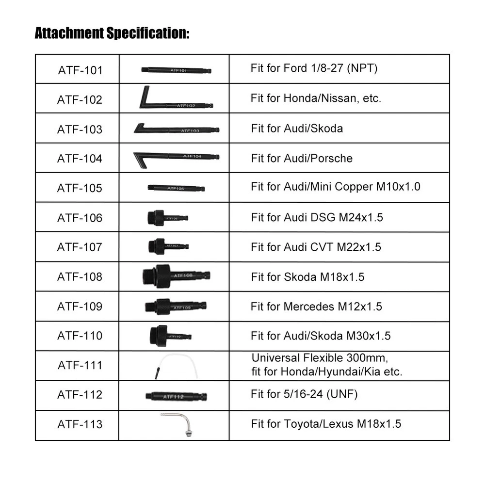 Feature: 1. 13pcs transmission fluid oil fill adapter kit with high quality 2. Produced from premium carbon steel material, anti-rust and durable 3. High strength, high hardness, not easy to deform and reliable to use 4. Comes with a storage case, which is convenient for storage and transportation 5. It includes a variety of adapters to meet your needs, convenient and practical to use Specification: Features: 13pcs transmission fluid oil fill adapter kit with high quality. Produced from premium carbon steel material, anti-rust and durable. High strength, high hardness, not easy to deform and reliable to use. Comes with a storage case, which is convenient for storage and transportation. It includes a variety of adapters to meet your needs, convenient and practical to use. Specification: Condition: 100% Brand New Item Type: Oil Fill Adapter Material: Carbon Steel Attachment Specification: ATF-101: Fit for Ford 1/8-27 (NPT) ATF-102: Fit for Nissan, etc. ATF-103 ATF-104 ATF-105: Fit for Mini Copper M10x1.0 ATF-106: Fit for DSG M24x1.5 ATF-107: Fit for CVT M22x1.5 ATF-108: Fit for M18x1.5 ATF-109: Fit for Mercedes M12x1.5 ATF-110: Fit for M30x1.5 ATF-111: Universal Flexible 300mm, fit for Hyundai/ Kia etc. ATF-112: Fit for 5/16-24 (UNF) ATF-113: Fit for M18x1.5 Package List: 1 Set x 13pcs Oil Fill Adapter(Box color red or blue random)