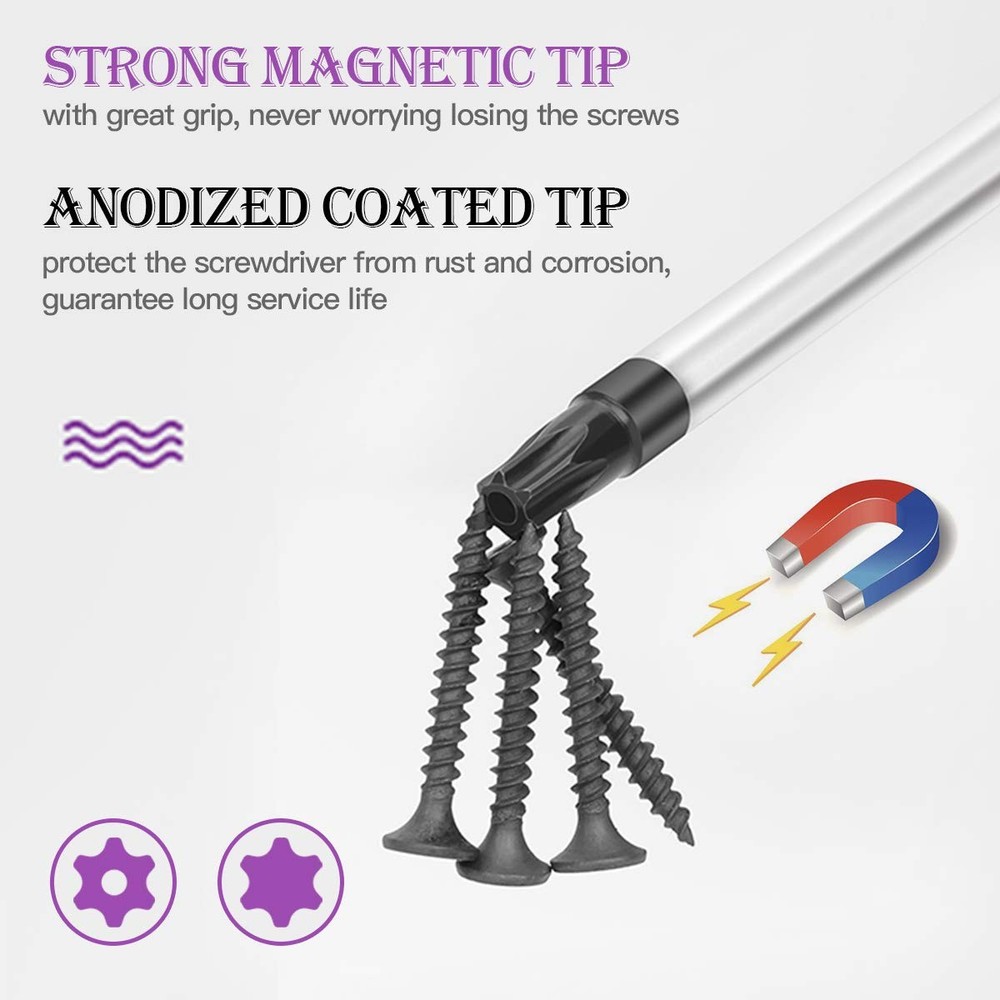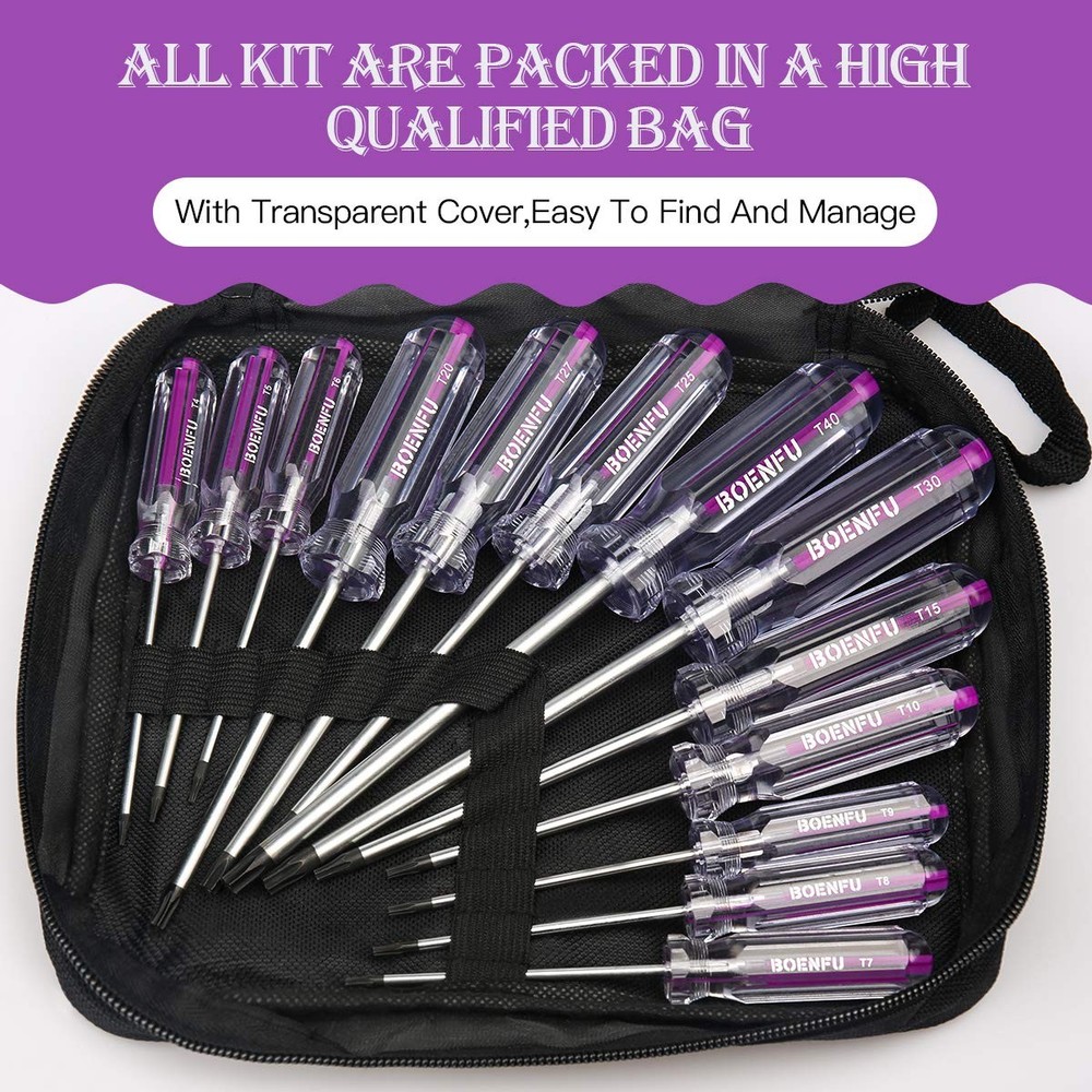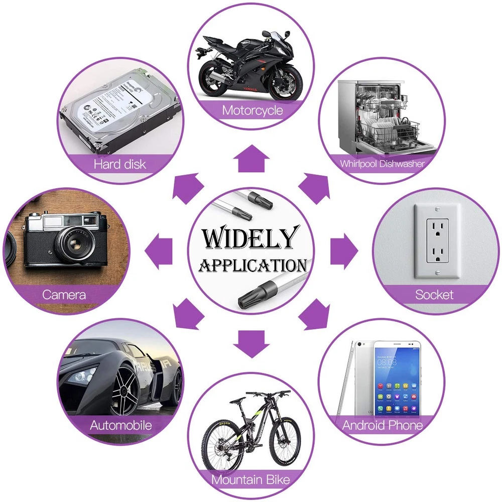 Torx screw drive is characterized by a 6-point star-shaped pattern, developed in 1967. A popular generic name for the drive is star, as in star screwdriver or star bits. Torx screws are commonly found on automobiles, motorcycles, bicycle brake systems (disc brakes), hard disk drives, computer systems, and consumer electronics. Initially, they were sometimes used in applications requiring tamper resistance, since the drive systems and screwdrivers were not widely available. Torx head screws resist cam-out better than Phillips head or slot head screws. Torx head sizes are described using the capital letter "T" followed by a number ranging from T1 to T100. A smaller number corresponds to a smaller point-to-point dimension of the screw head (diameter of circle circumscribed on the cross-section of the tip of the screw driver). Common sizes include T10, T15, and T25. Only the proper driver can drive a specific head size without risk of damaging the driver or screw. DURABLE MATERIAL: Torx / star screwdrivers, made of chrome vanadium steel for strength and durability. Industrial grade high hardness, high frequency heat treatment process, not easy to deform, strong and durable STRONG MAGNETIC TIP: All these torx / star screwdrivers with strong magnetic tips help you hold tiny screws in case of missing or dropping FULL-SIZE: Set Includes: T10/ T15/ T25/ T4/ T5/ T6/ T7/ T8/ T9/ T20/ T27/ T30/ T40 MULTI-PURPOSE USE: Torx screwdriver set with various sizes could be frequently-used screwdrivers for different types of repair. Widely used for domestic appliances, cameras, hard disks, DeWalt chainsaws, motorcycles, bikes, automobiles, computers, laptops, smartphones, dishwashers, they are capable of meeting your various needs ZIPPER BAG: All Torx screwdrivers are packed in a strong and compact zipper bag for storage and portability