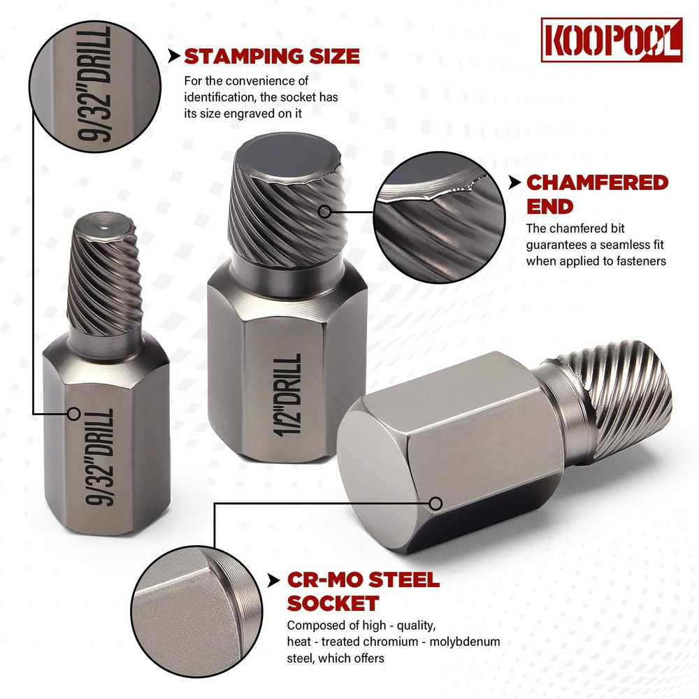 This screw extractor set is a lifesaver for stripped or broken bolts! The chrome molybdenum steel construction makes it super durable, and the range of sizes covers almost any job. Whether you're a pro or a DIYer, these extractors grip stubborn fasteners effortlessly. Perfect for rusted or damaged screws—definitely worth adding to your toolkit!