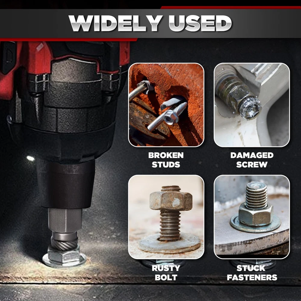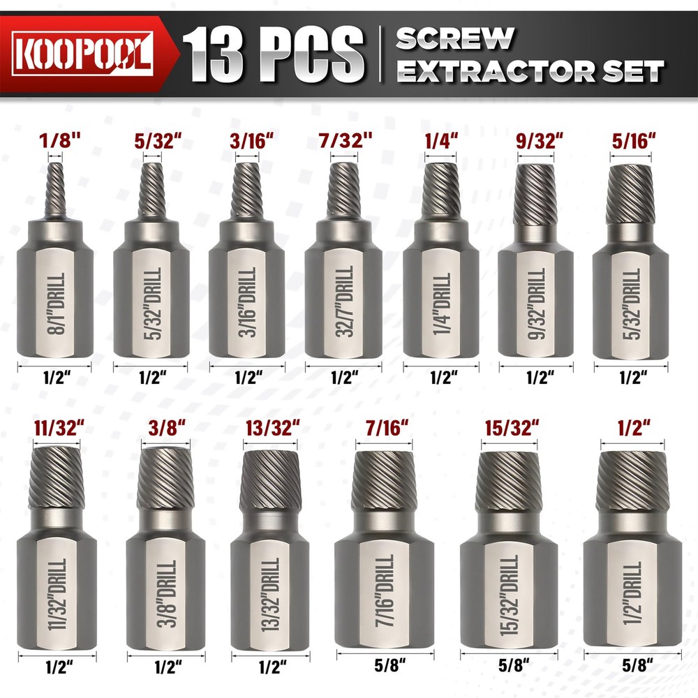 13-Piece Screw Extractor Set, Multi-Spline Easy-Out Bolt Extractor Kit, Chrome Molybdenum Steel Tool for Stripped, Rusted & Broken Bolts, Screws & Nuts Removal 【Versatile Sizes for Various Applications】 This 13-piece extractor set includes a range of sizes (1/8" to 5/8") to tackle broken screws, bolts, nuts, studs, fittings, and threaded pipes with ease. Designed for both DIYers and professionals, this set is a must-have for any toolbox. 【Heavy-Duty CR-MO Steel for Maximum Durability】 Crafted from heat-treated chrome molybdenum steel (CR-MO), this set delivers superior strength, wear resistance, and longevity. Built to withstand high torque applications, ensuring reliable performance in tough jobs. 【Easy to Use with Power & Hand Tools】 Compatible with impact wrenches, drills, and hand tools, the high-density spiral design provides maximum grip for fast and effortless removal of stubborn fasteners. 【Laser-Etched Markings for Quick Identification】 Each extractor features high-visibility laser-etched size markings for easy selection. The precision-fit storage case keeps the tools organized and prevents loss. 【Trusted Quality & Lifetime Warranty】 Tested for top-tier performance and durability, this extractor set is built to last. We stand behind our product with a lifetime limited warranty—if you have any issues, contact us for support!