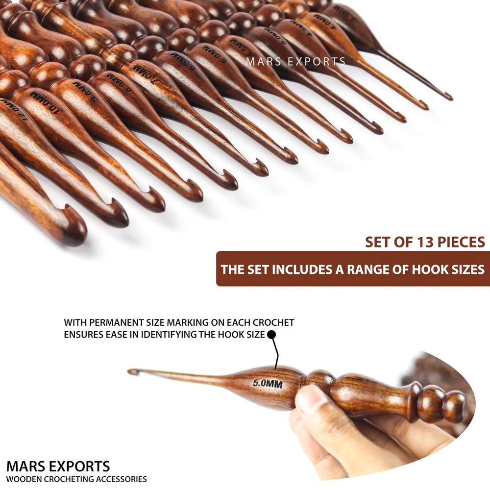 Elevate your crochet projects with our 13 Pieces Premium Wooden Crochet Hooks Set, expertly crafted from exquisite Rosewood knitting needles. This set offers versatility with a range of sizes from 3.5 MM to 16.0 MM, ensuring you have the perfect tool for various yarn weights and creative endeavors. Key Features: Premium Rosewood Craftsmanship: Each crochet hook is meticulously crafted from high-quality Rosewood, known for its natural warmth and smooth texture. The premium material enhances the overall quality of your crochet experience. Set of 13 Sizes: This comprehensive set includes 13 crochet hooks in sizes ranging from 3.5 MM to 16.0 MM. Whether you're working on delicate lace projects or cozy blankets, this set covers all your creative needs. Versatile Crocheting: Designed for both knitting and crocheting, this set accommodates various yarn types and thicknesses. The smooth finish ensures a snag-free experience, allowing you to delve into intricate patterns with ease. Premium Ergonomics: Each crochet hook is ergonomically designed for comfortable handling, reducing hand fatigue during extended crafting sessions. Enjoy a smooth and pleasant crocheting experience with these thoughtfully crafted hooks. Functional and Stylish: Beyond functionality, the Rosewood construction adds a touch of style to your crafting tools. Display these premium crochet hooks proudly in your crafting space. Practical Storage: The set comes with a convenient storage case, keeping your crochet hooks organized and easily accessible. The compact, portable case is perfect for both on-the-go crafting and tidy storage at home. Perfect Gift: Whether for yourself or a fellow crafting enthusiast, this Premium Wooden Crochet Hooks Set makes for an excellent gift. Share the joy of elevated crocheting with these beautifully crafted hooks. Experience the beauty and functionality of our 13 Pieces Premium Wooden Crochet Hooks Set in Rosewood. Elevate your crochet projects with the warmth and sophistication of these meticulously crafted hooks. Order now and add a touch of luxury to your creative journey. MATERIAL : Crafted from high-quality rosewood, known for its durability, strength, and attractive grain patterns SET SIZE : Consists of a complete set of 13 crochet hooks, catering to various project requirements and yarn weights SIZES : 3.5mm, 4.0mm, 4.5mm, 5.0mm, 5.5mm, 6.0mm, 6.5mm, 7.0mm, 8.0mm, 9.0mm, 10.0mm, 12mm, 16mm. Lenght of each crochet is 7 inches. SMOOTH FINISH : Each hook features a meticulously smooth finish, preventing snagging or splitting of yarn and ensuring a seamless crocheting experience ERGONOMIC DESIGN : Designed with an ergonomic handle for comfortable grip and reduced hand fatigue during extended crocheting sessions. Size Markings Clear and engraved size markings on each hook for easy identification, allowing you to quickly select the appropriate size for your project. VERSATILITY : Suitable for a wide range of crochet projects, from delicate lacework to bulkier yarn projects, thanks to the variety of included hook sizes. NATURAL BEAUTY : Rosewood's natural aesthetic adds a touch of elegance to the crochet hooks, making them visually appealing tools for your crafting endeavors. BALANCED WEIGHT : The hooks are designed with balanced weight distribution, providing a comfortable and controlled feel while working on different types of projects. IDEAL GIFT : This set makes for an excellent gift for crochet enthusiasts, showcasing both practicality and aesthetic appeal