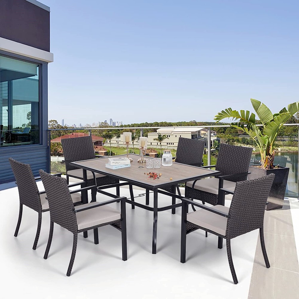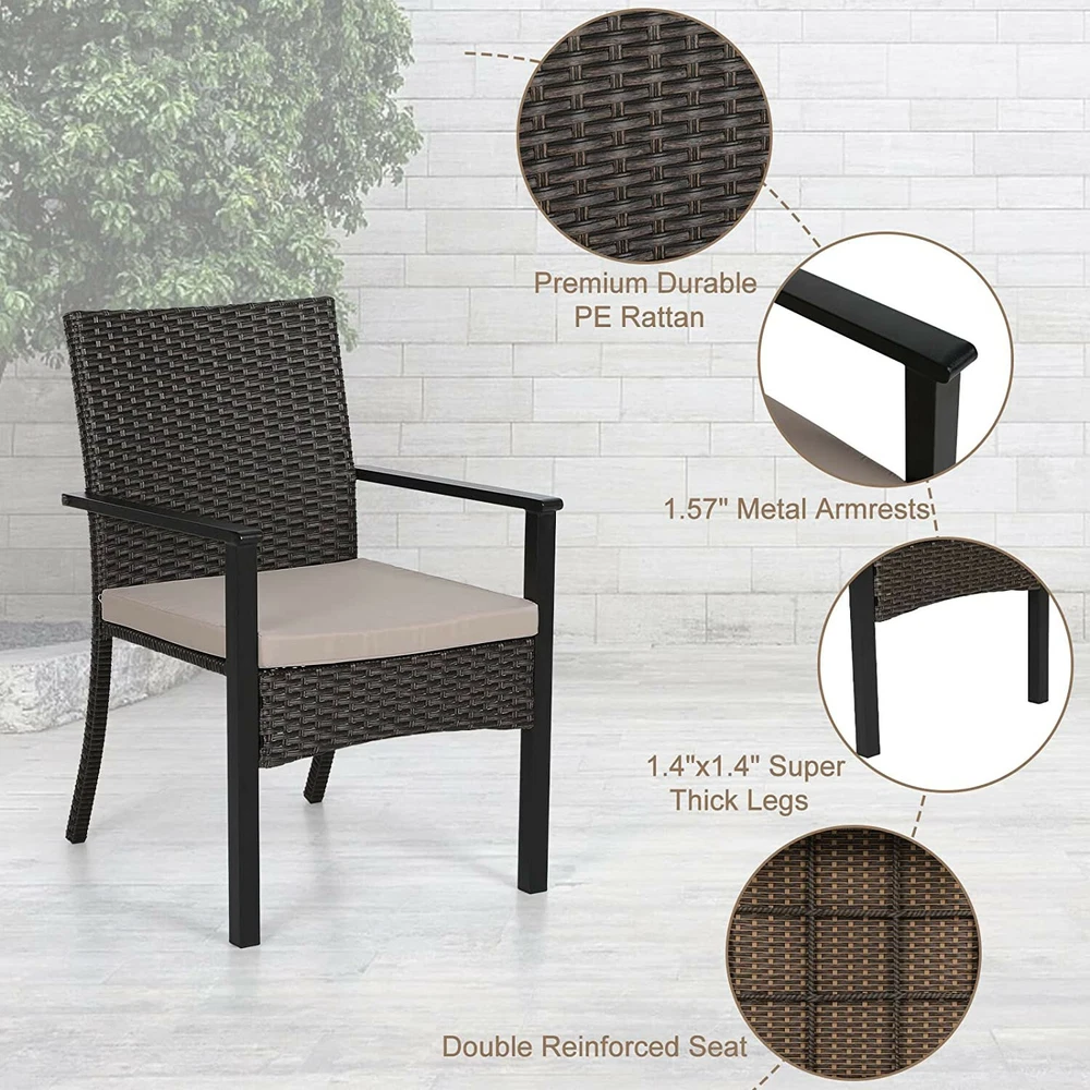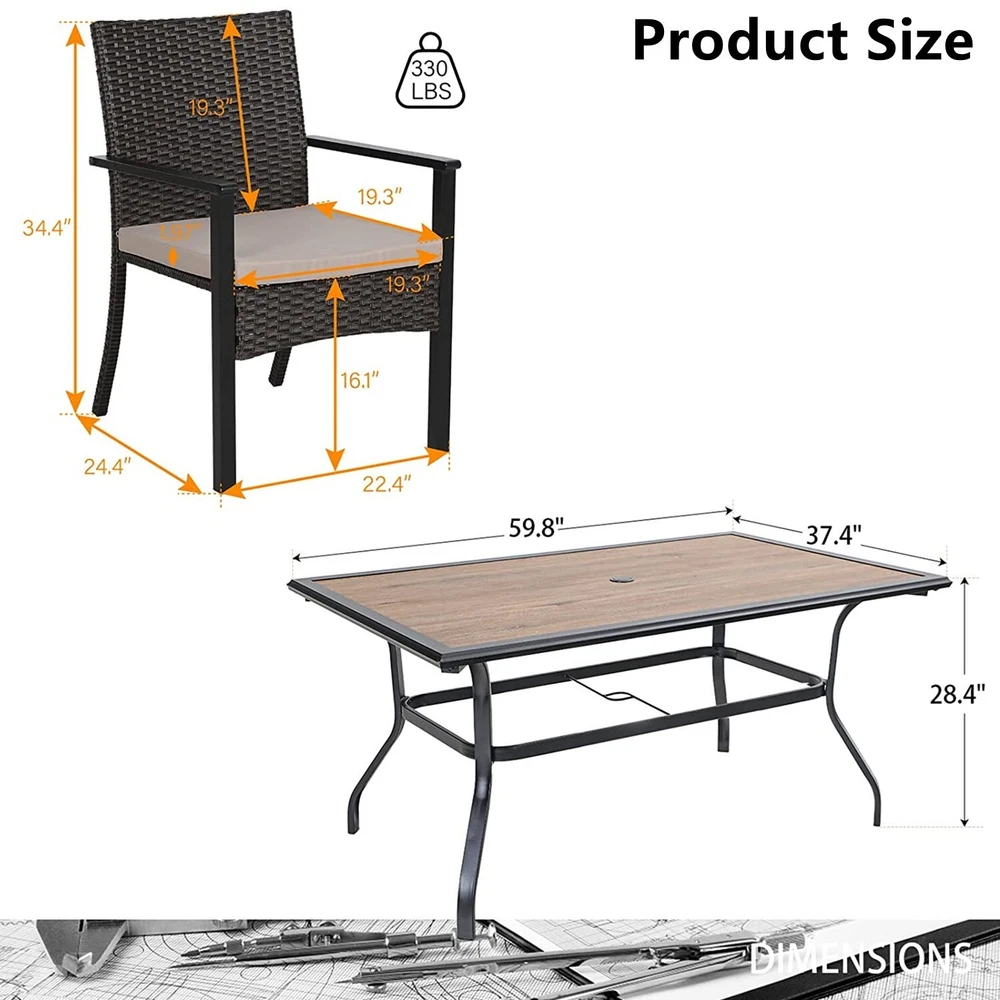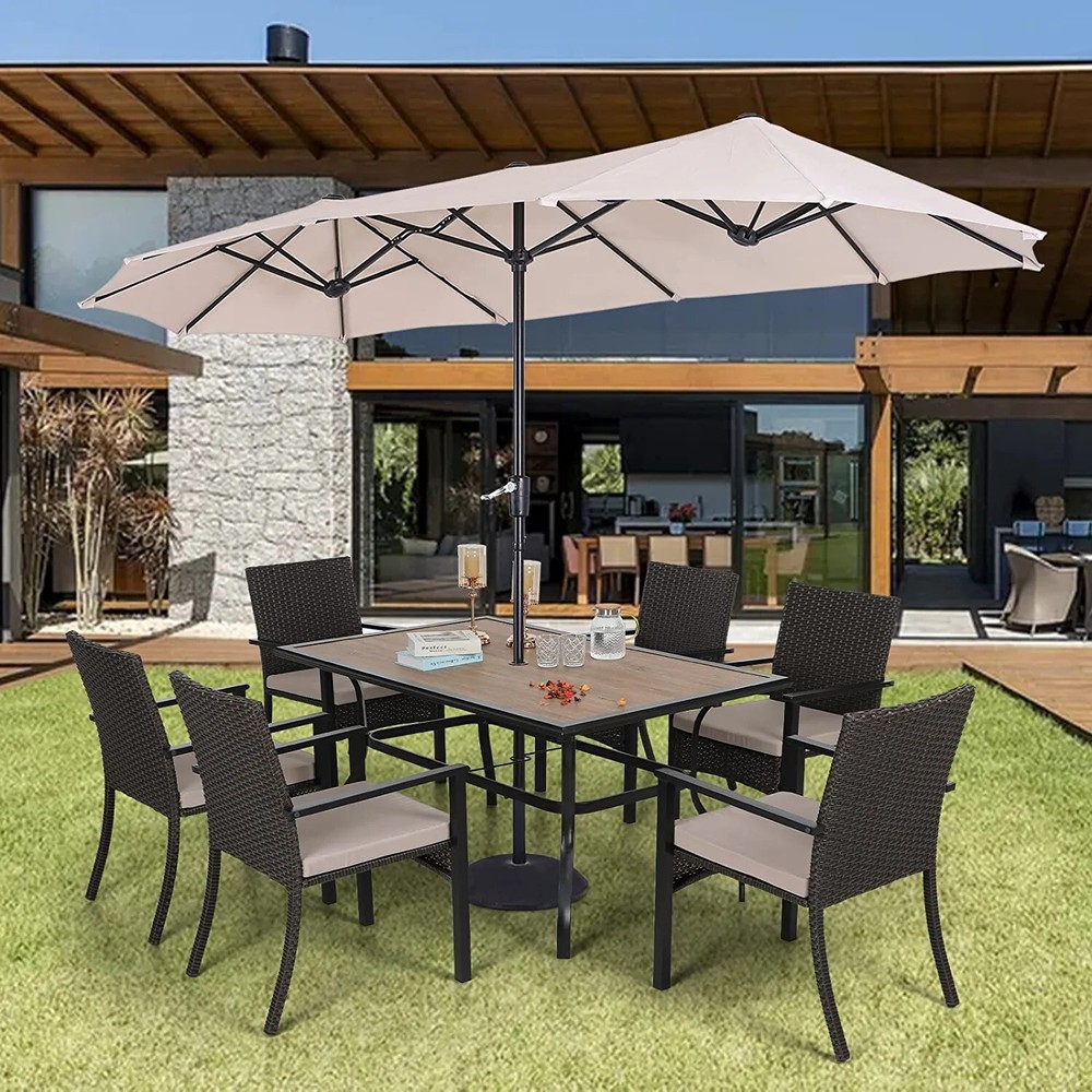Patio Chair Patio Table Set of 2 Set of 3 Set of 5 Set of 6 Set of 7 Set of 8 Set of 9 Auction Other MENU Store Support Set of 2 Set of 3 Set of 5 Set of 6 Set of 7 Set of 8 Set of 9 Auction Other ▌ PRODUCT DETAILS: 【Color】:Chairs: Dark Brown Rattan + Beige Cushion Table: Brown Umbrella: Beige 【Size】:Chairs: 34.4'' H x 24.4'' L x 22.4''W; Seat Height: 16''; Backrest: 19.3'' Table: 60'' L x 37''W x 28''H 【Material】:Rattan + Metal 【Ship-way】:Ship by FedEx or UPS 【Feature】: E-coating / with umbrella hole / with Cushion 【Capacity Weight】: 330 lbs 【Warranty】: 2 Year 【Package including】:Six Chair + One Table + One Umbrella + Accessories More Items About Us Welcome to our eBay store. We sale products about Home Garden,Home Organization,and Office Products. We are committed to your good buying experience from us. If you meet some problems or further questions,even some dissatisfaction with us,please give us a chance to solve the problem and offer you the best service,before leaving us a negative feedback. Meanwhile if you are satisfied with our products and service,please leave positive feedback with Four 5-Stars. Payment 1. We accept payment methods : PayPal, Payoneer, Visa, Master Card, American Express , Discover and Credit Card, etc. 2. We appreciate prompt payment and look forward to your business in the future. 3. Unpaid item will be filed without receiving payment in 7 days from listing ended. 4. If for some reason there is any issue with the purchase,please contact us prior to leaving feedback,and we will be glad to work with you to have it resolved. Shipping 1. We take great care packaging every item to ensure safe quality shipping. 2. We ship UPS/USPS/FedEx depending on your location and the shipping method you have chosen. 3. Most shipments are sent out within 1-3 business day after payment is confirmed or cleared,unless stated on otherwise in the listing. 4. Packages are not shipped on Saturday and Sunday. Transit time varies and depends on the carrier,we cannot be held responsible for delays caused by carriers. 5. Please make sure to provide the correct shipping address when placing your order,orders will be shipped out to the shipping address provided by eBay. 6. Shipping time by eBay is estimated and not guaranteed and is subject to change especially during peak periods. 7. Orders shipping to Hawaii,Puerto Rico,Guam or Alaska may not select the Free shipping option for this item,if free shipping is selected for one of these destinations we reserve the right to cancel your order. Returns 1. We offer a 30 day return policy on all items.(Unless stated otherwise in the listing). 2. All returns must be in original condition and must include the original packaging and content intact. 3. Returns should be packed in proper packaging to avoid damage to the item or it original packaging. 4. For any return request please contact our Customer Support by eBay Messages and you will be assigned an RMA number and instructions on how to proceed with your return. 5. Please allow 3-5 business days after we receive your package to process your return. 6. Any returns that violate this return policy will not be accepted and will be sent back at customers’ expense. Contact Us 1. If you have any questions or concerns about the product or the auction,please contact our customer service department via email or send us message on eBay my messages. We will give you a response in 24 hours. 2. All emails will be responded to within 12-24hours.