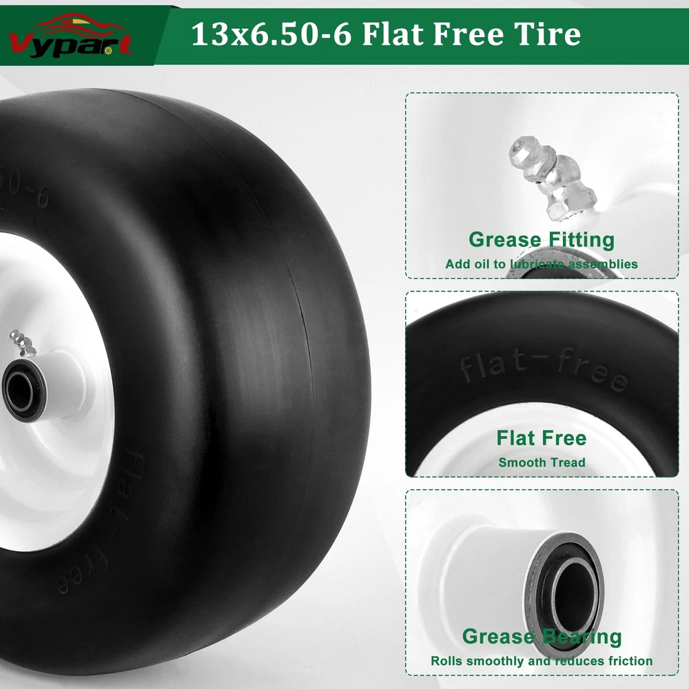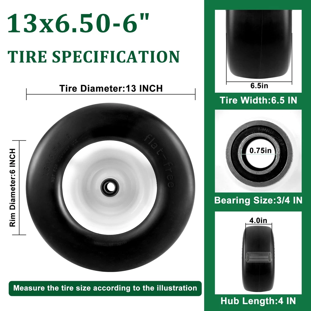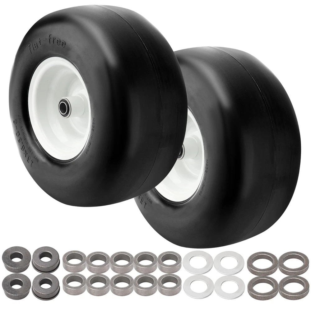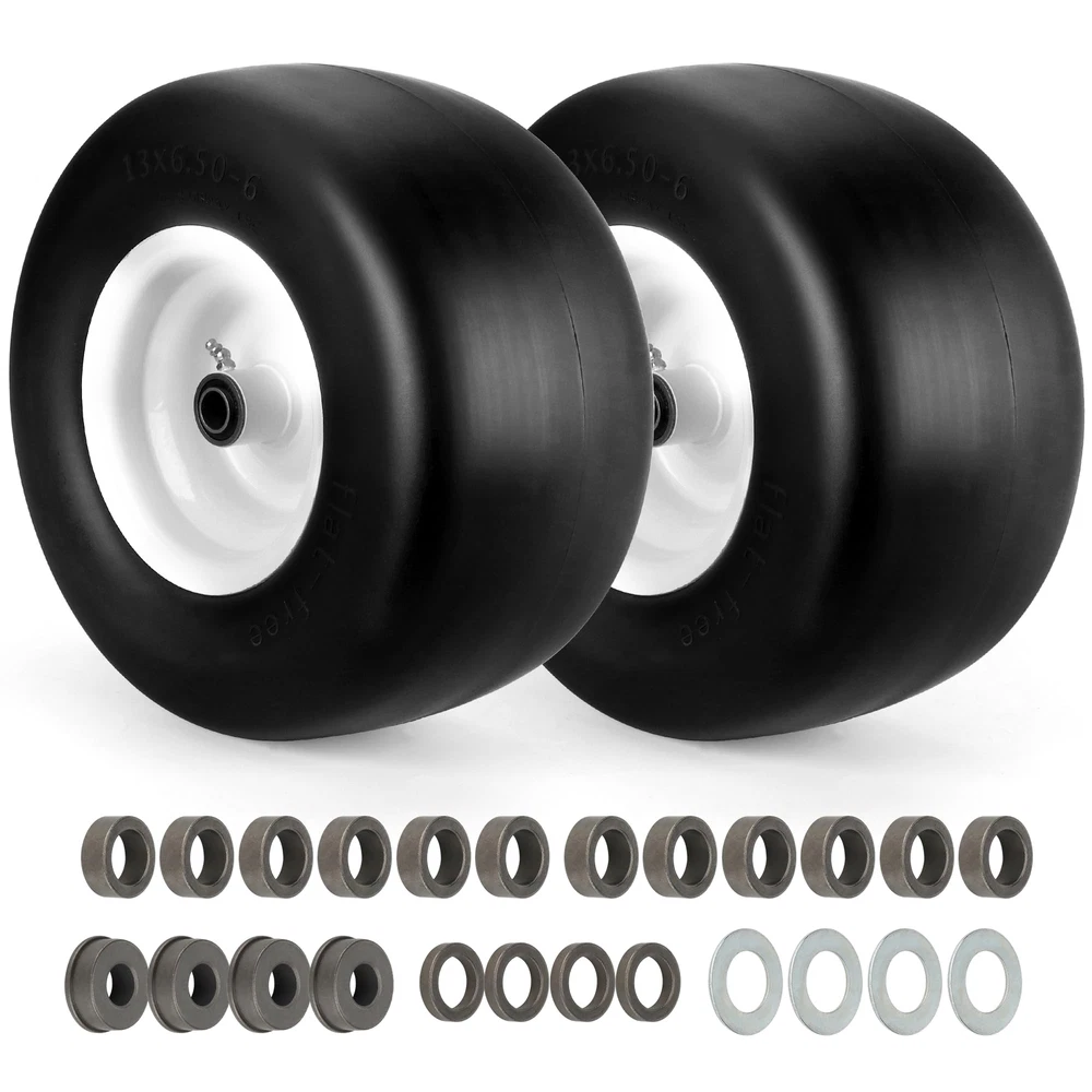2 PCS 13x6.50-6 Flat Free Lawn Mower Smooth Tire Wheel with 0.76in & 0.65in Grease Bushings What's in the package? Package includes 2 Pack 13x6.50-6 flat free lawn mower tires,4 Pack 0.65in metal bushings,12 Pack 0.44in metal washers,4 Pack 0.22in wide wheel metal gaskets,4 Pack 0.85in galvanized hole gaskets.13x6.50-6 have a universal 0.76in axle bore hole.To match different mower wheel sizes and axle sizes,13x6.50-6 tire and wheels are equipped with 0.65 in metal bushings,0.44 in metal washers,0.22in wide wheel metal gaskets help to expand center hub length range 4.5-5.5inch. Specifications of 13x6.50-6 tire and wheel assembly,the diameter of the tire is 13.3 in,the width of tire is 6.02 in,the diameter of rim is 7.09 in,the grease bushing size is 0.76in and 0.65in,the centered hub length is 4 in.To avoid choosing the wrong lawn mower tire,carefully measure dimension of old 13x6.50-6 tire and wheel. 13x6.50-6 tire wheel upgraded with high-quality PU.13x6.50-6 flat free tire made of premium polyurethane foam ensure tire tread will not be bad to environment,13x6.50-6 tire wheel had been tested strictly by factory. Compare with other brand 13x6.50-6 flat free lawn mower tire wheels give a superior performance in tire wear resistance.Flat free tire with good flexibility,light weight polyurethane foam with smooth surface tire thread has a low resistance to reduce energy consumption. 13x6.50-6 tire and rim tire has a maximum load capacity of 450 pounds.13x6.50-6 flat free tire and wheel is widely used in zero-turn lawn mowers and garden tractor tire.Tire and wheel with right size, will suitable for some outdoor power equipment 4 wheelers, wheelbarrows,garden cars,manual trucks, generators, air compressors. 13x6.50-6 tires and wheels is easy to install. Protect yourself by wearing work gloves before installing tires. NOT FOR HIGHWAY(NHS).Lawn mower tires 13x6.50-6 flat free for farm,off-road,lawn garden.Using NHS tires in highway will result in tire failure cause a bad accident 13x6.50-6 Flat Free Lawn Mower Tire -- Our 13x6.50-6 flat free tire wheel stands as the perfect fit for your current 13x6.50-6 lawn mower or zero turn front tires. Featuring a 13" diameter and 6.50" width, fits snugly on a 6.0" wheel. Tailored for 3/4" & 5/8" bushing/borehole sizes along with a 4" centered hub length. Verify the replacement fit by checking your tire sidewall. Universal Adjustable Spacers Kits -- 13x6.50-6 lawn mower tires offers a universal 3/4 inch axle bore hole. To ensure precise fit, we provide 4* 5/8" bushings,12*0.44" washers,4* 0.22" gaskets,4* metal spacers,expanding its applicability. Ideal Tires Replacement -- Crafted from solid polyurethane foam, our 13x6.50-6 flat free lawn mower tires ensure tire smooth tread,maintenance-free and puncture-proof, saving time, no need to worry about air pressure and inflation. The seamless tread design safeguards your lawn,replicate pneumatic tires in load characteristics, delivering bounce without puncture risks. Widely Applicable -- 13x6.5-6 lawn mower tire is compatible with most Cub Cadet, Toro zero turn lawn mowers and other wheeled lawn mowers,Using adjustable spacers, 13x6.5-6 lawn mower tire adapt to various lawn mowers with a centered hub, as well as outdoor power equipment like wheelbarrows, garden carts, generators, and air compressors. NOT FOR HIGHWAY USE AND STATIC LOAD-BEARING. Inflat-Free & Puncture-Proof -- Bid farewell to punctures and inflation headaches with our puncture-proof and inflate-free 13x6.50-6 lawn mower tire and wheel. Ideal for zero turn mowers, these tires boast high strength and wear resistance, ensuring worry-free performance. Note: Lubricating oil the bushing with grease before use. After Sales Service -- If you have any questions about 13x6.5-6 flat-free tire, let us know and we will try our best to solve the problems. You can contact us at any time through Amazon.