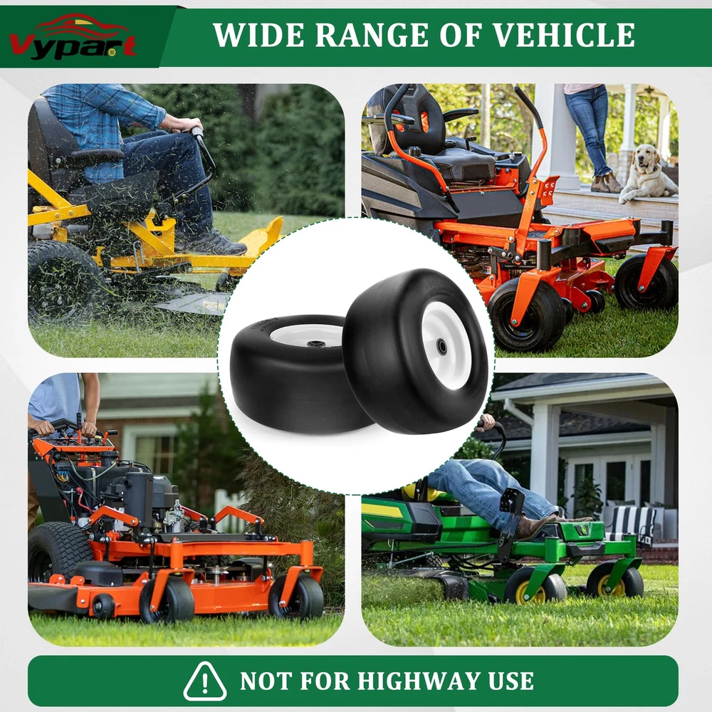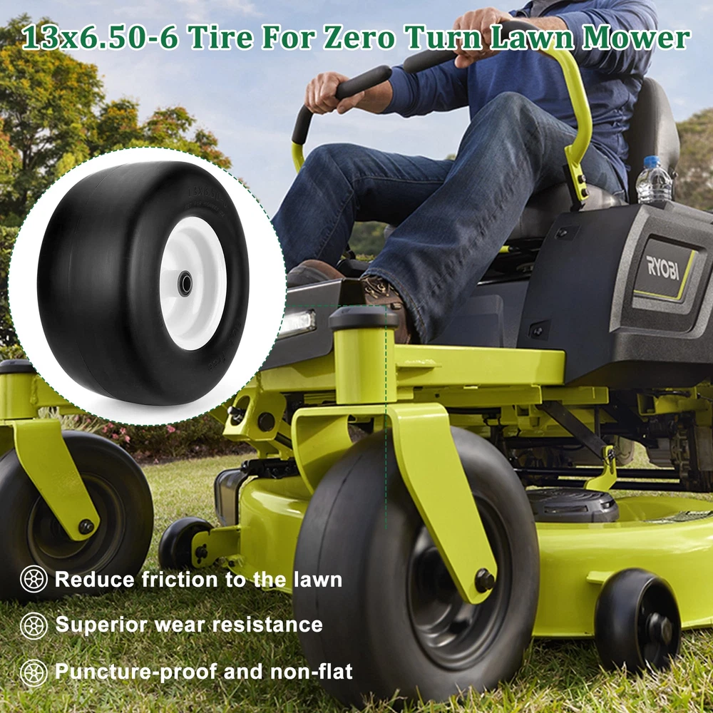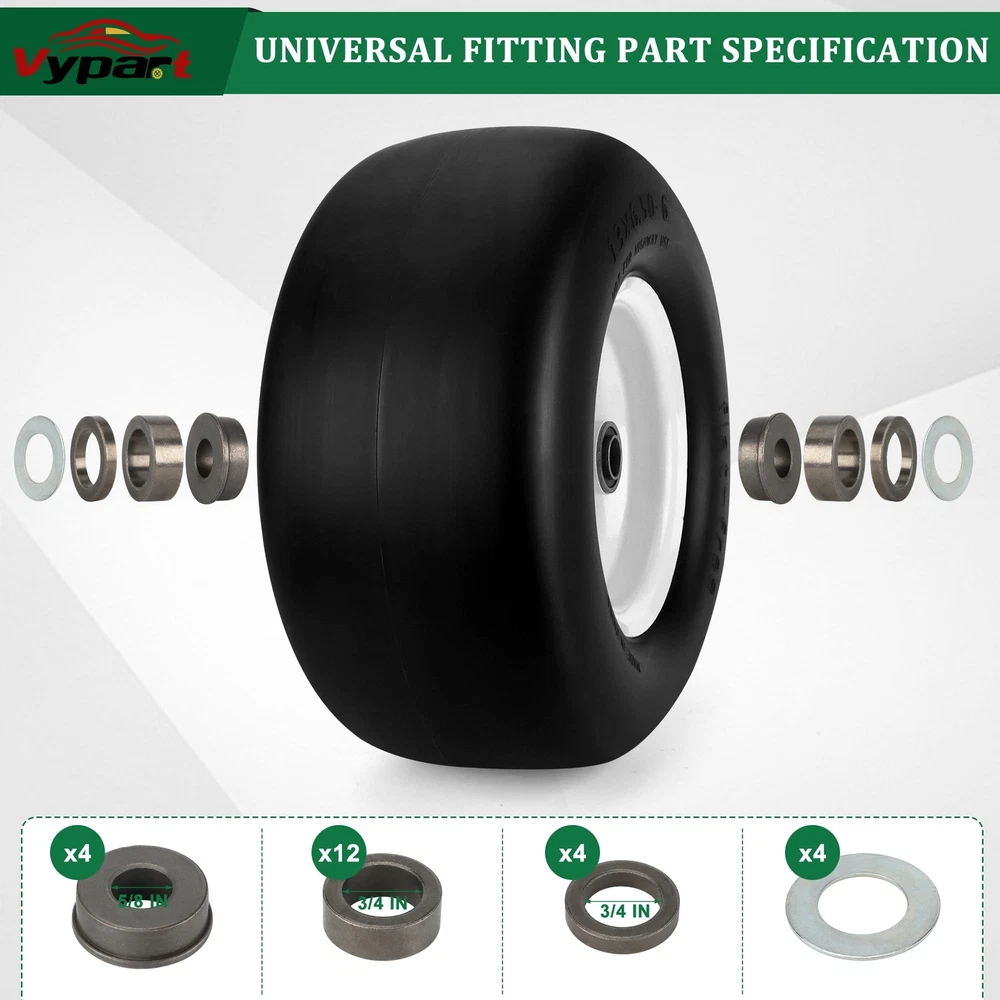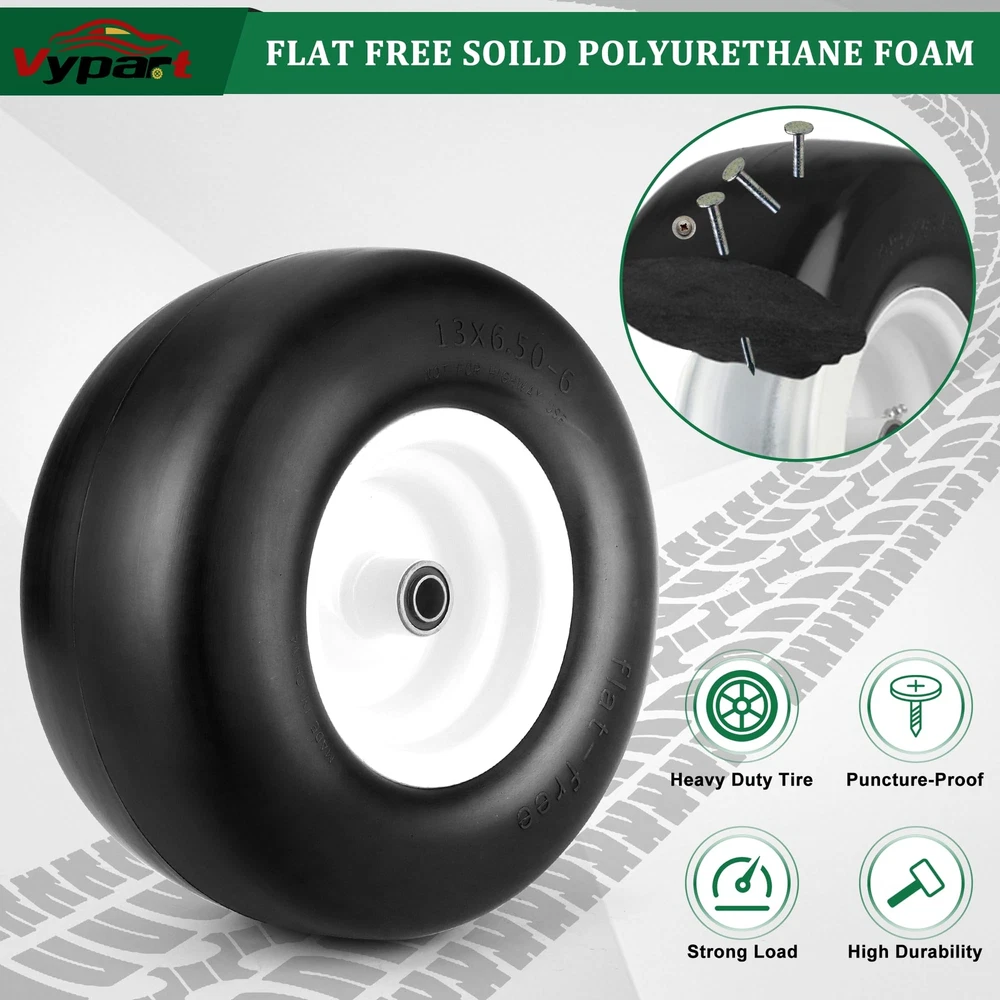 2 PCS 13x6.50-6 Flat Free Lawn Mower Smooth Tire Wheel with 0.76in & 0.65in Grease Bushings What's in the package? Package includes 2 Pack 13x6.50-6 flat free lawn mower tires,4 Pack 0.65in metal bushings,12 Pack 0.44in metal washers,4 Pack 0.22in wide wheel metal gaskets,4 Pack 0.85in galvanized hole gaskets.13x6.50-6 have a universal 0.76in axle bore hole.To match different mower wheel sizes and axle sizes,13x6.50-6 tire and wheels are equipped with 0.65 in metal bushings,0.44 in metal washers,0.22in wide wheel metal gaskets help to expand center hub length range 4.5-5.5inch. Specifications of 13x6.50-6 tire and wheel assembly,the diameter of the tire is 13.3 in,the width of tire is 6.02 in,the diameter of rim is 7.09 in,the grease bushing size is 0.76in and 0.65in,the centered hub length is 4 in.To avoid choosing the wrong lawn mower tire,carefully measure dimension of old 13x6.50-6 tire and wheel. 13x6.50-6 tire wheel upgraded with high-quality PU.13x6.50-6 flat free tire made of premium polyurethane foam ensure tire tread will not be bad to environment,13x6.50-6 tire wheel had been tested strictly by factory. Compare with other brand 13x6.50-6 flat free lawn mower tire wheels give a superior performance in tire wear resistance.Flat free tire with good flexibility,light weight polyurethane foam with smooth surface tire thread has a low resistance to reduce energy consumption. 13x6.50-6 tire and rim tire has a maximum load capacity of 450 pounds.13x6.50-6 flat free tire and wheel is widely used in zero-turn lawn mowers and garden tractor tire.Tire and wheel with right size, will suitable for some outdoor power equipment 4 wheelers, wheelbarrows,garden cars,manual trucks, generators, air compressors. 13x6.50-6 tires and wheels is easy to install. Protect yourself by wearing work gloves before installing tires. NOT FOR HIGHWAY(NHS).Lawn mower tires 13x6.50-6 flat free for farm,off-road,lawn garden.Using NHS tires in highway will result in tire failure cause a bad accident 13x6.50-6 Flat Free Lawn Mower Tire -- Our 13x6.50-6 flat free tire wheel stands as the perfect fit for your current 13x6.50-6 lawn mower or zero turn front tires. Featuring a 13" diameter and 6.50" width, fits snugly on a 6.0" wheel. Tailored for 3/4" & 5/8" bushing/borehole sizes along with a 4" centered hub length. Verify the replacement fit by checking your tire sidewall. Universal Adjustable Spacers Kits -- 13x6.50-6 lawn mower tires offers a universal 3/4 inch axle bore hole. To ensure precise fit, we provide 4* 5/8" bushings,12*0.44" washers,4* 0.22" gaskets,4* metal spacers,expanding its applicability. Ideal Tires Replacement -- Crafted from solid polyurethane foam, our 13x6.50-6 flat free lawn mower tires ensure tire smooth tread,maintenance-free and puncture-proof, saving time, no need to worry about air pressure and inflation. The seamless tread design safeguards your lawn,replicate pneumatic tires in load characteristics, delivering bounce without puncture risks. Widely Applicable -- 13x6.5-6 lawn mower tire is compatible with most Cub Cadet, Toro zero turn lawn mowers and other wheeled lawn mowers,Using adjustable spacers, 13x6.5-6 lawn mower tire adapt to various lawn mowers with a centered hub, as well as outdoor power equipment like wheelbarrows, garden carts, generators, and air compressors. NOT FOR HIGHWAY USE AND STATIC LOAD-BEARING. Inflat-Free & Puncture-Proof -- Bid farewell to punctures and inflation headaches with our puncture-proof and inflate-free 13x6.50-6 lawn mower tire and wheel. Ideal for zero turn mowers, these tires boast high strength and wear resistance, ensuring worry-free performance. Note: Lubricating oil the bushing with grease before use. After Sales Service -- If you have any questions about 13x6.5-6 flat-free tire, let us know and we will try our best to solve the problems. You can contact us at any time through Amazon.