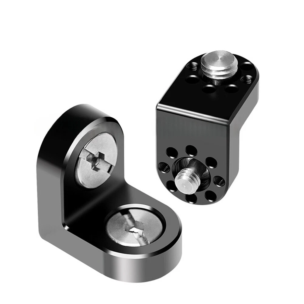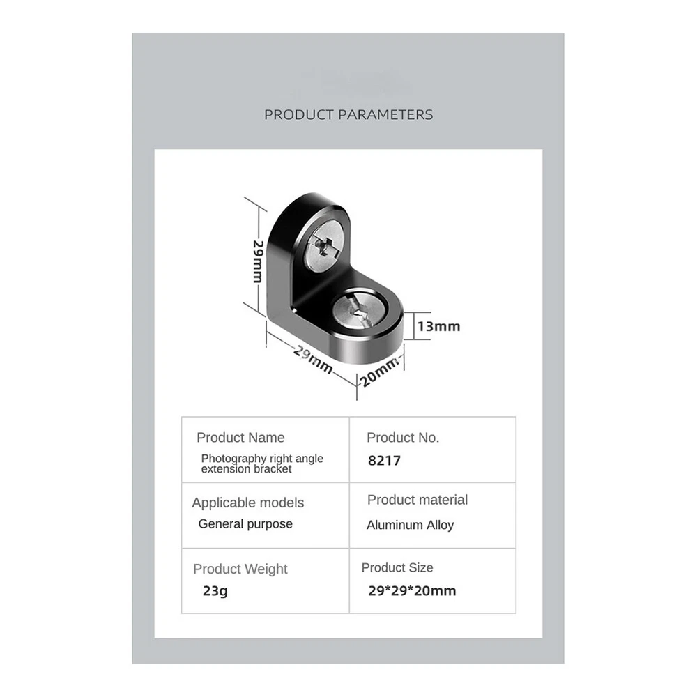 1/4 3/8 Screw Extension 90° Right Angle Mount Adapter for Tripod Monitor9419 Photography right angle extension bracket. Made of aluminum alloy, 1/4 and 3/8 screw extension. Right angle design with 90° perpendicular angle at both ends. The extension function is powerful, 1/4 and 3/8 screw extension, locating holes. Product Name:Camera Right Angle Extension Bracket Applicable models:universal Product weight:23g Colour:Black Material:Aluminum alloy Size:29x29x20mm Package Contents: 1 * Mount Adapter
