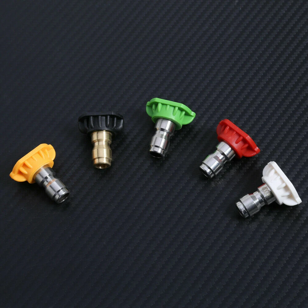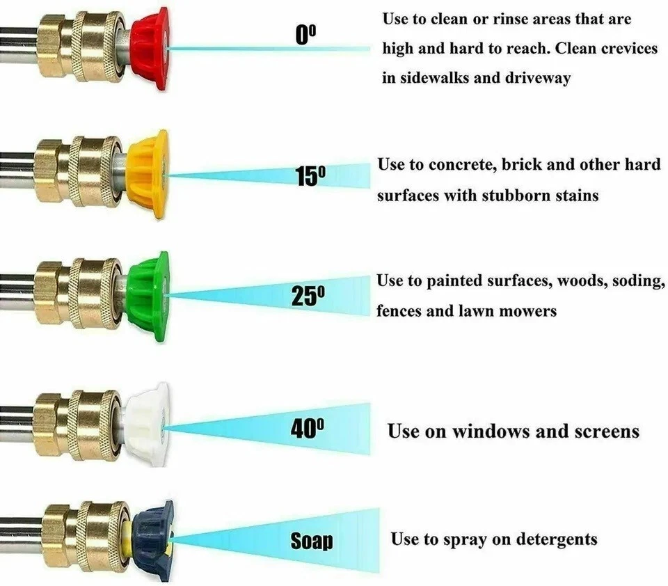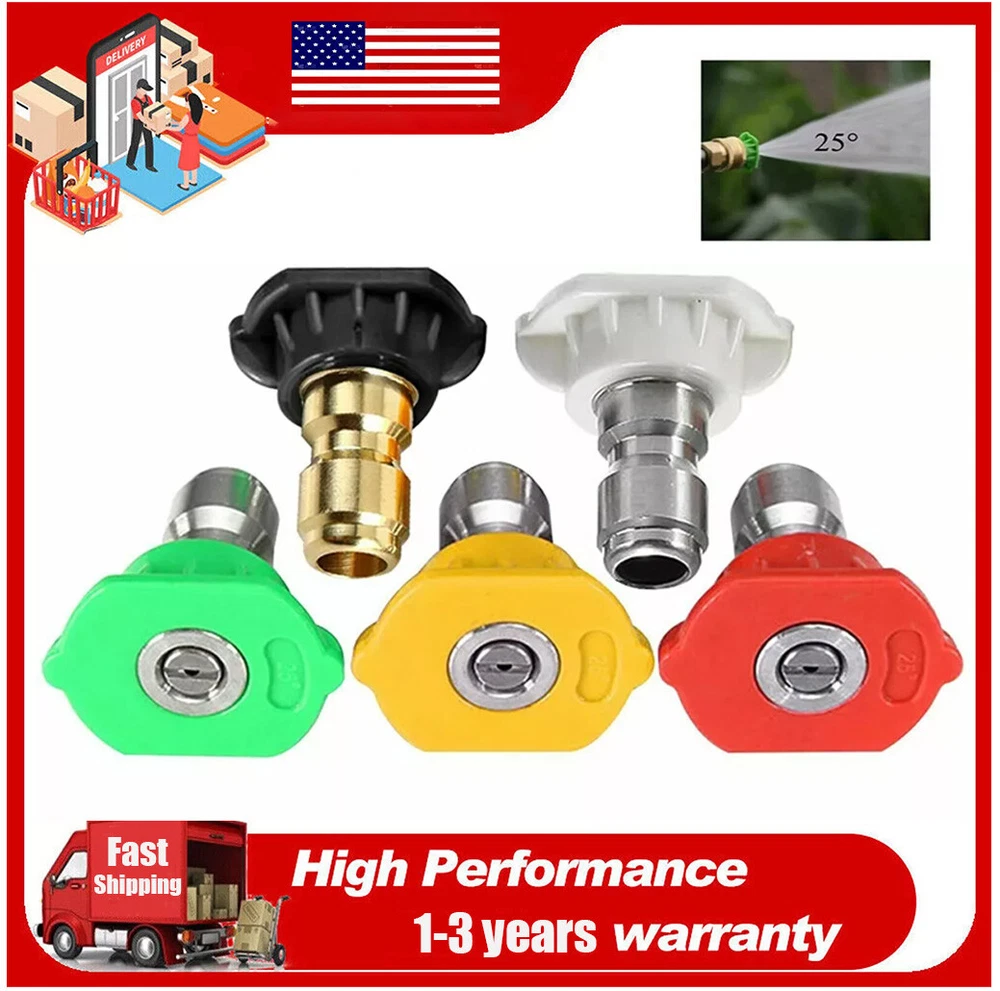 product Shipping Payment Warranty and Guarantee Other Policies Item Description Please note: Communication is the best way to solve problems. If you have any problems with the product you received, please contact us before contacting eBay or leaving a review. We will provide a satisfactory solution for you. *Please CHECK OEM Part Number before order* *Installing Template is NOT Included, Professional Installation Is Highly Recommended* Features: Condition: 100% Brand New Material: Plastic + Stainless steel, Plastic + Brass Color: Red, Yellow, Green, White, Black Angle: 0 degree, 15 degree, 25 degree, 40 degree, 60 degree Pressure Washer High Pressure (2) 5 Pack Color Coded Nozzles with 1/4" Quick Connect attachment Max 4000 PSI Use to Replace Damaged Nozzles or to Upgrade to a Complete Set. 0 Degree (Red, Stainless Steel, Concentrated Pencil Jet) High Pressure Nozzle 15 Degree (Yellow, Stainless Steel, High Performance) High Pressure Dirt Removal 25 Degree (Green, Stainless Steel, Multi-Purpose) Lower Pressure Brick Cleaning etc 40 degree (White, Stainless Steel, Sensitive Surfaces) Common use Such As Car Cleaning etc Black Soap Soaker Tip Size:1/4" Nozzle Sets Package included: 1 x Red Tip, 0 Degree 1 x Yellow Tip,15 Degree 1 x Green Tip, 25 Degree 1 x White Tip, 40 Degree 1 x Black Tip, for soap Item Pictures More Shipping 1.We ship to worldwide,except Hong Kong,Taiwan,Macao,China,Guemsey and we do not ship to APO/FPO, etc. 2.Item will be shipped within 3 business day on payment received. 3.Items are shipped from China using Airmail,reach most of countries within 10-20 business days. 4.sDelivery time depends on destination and other factors,it may takes up to 20 business days. Payment 1.We accept Paypal only. 2.All major credit cards are accepted through secure payment processor PayPal. 3.Payment must be received with 7 days of auction closing 4.If you have bought multiple items from us,you can send us one payment for all the items instead of paying for them individually. When you click the Pay Now button,eBay will automatically determine if there are other items you have won of purchased from us and will combine them for your review. Warranty and Guarantee 1.One year warranty!30 days money back!Buy with confidence! 2.If you are not satisfied when you receive your item,please return it within 30 days for a replacement or money back.Please contact us before you return the item. 3.If item is defective in 3 months,we will send you a replacement without extra charger,or offer refund after we receive the defective item. 4.If item is defective after 3 months,you can still send it back to us.We will send you a new one after after receiving the defective item,but you have to pay the extra shipping fee. Other Policies 1.We are not responsible for any custom duty or import tax. 2.We will leave Positive Feedback after receiving the payment.Please contact us if you are not satisfied with the item after receiving it. 3.All emails will be answered within 1 business day.If you do not receive our reply,please kindly re-sent your email and we will reply you as soon as possible. 4.Serious Buyer Only!Please place bid only if you agree with all the terms.