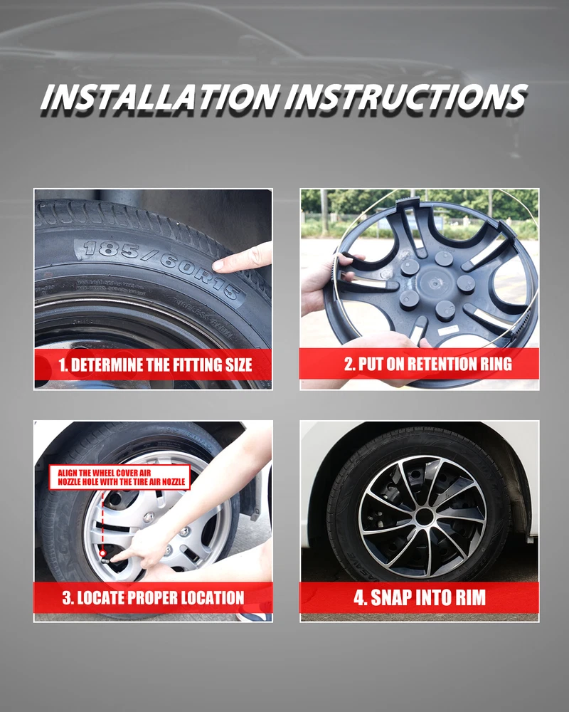 Store Categories Other Car Refrigerator Front Bumper Rear Bumper Fender Flares Inner Fenders Side Steps Running Board A-Pillar Light Mount Brackets Headlights Taillights Fog Lights LED Headlights LED Taillights LED Fog Lights Jeep Chevrolet Ford Toyota Dodge GMC Product Features ✴ PERFECT FIT: This wheel hub cap is specifically designed to perfectly fit for 14-inch wheels, ensuring a seamless match and enhanced aesthetics. It complements the overall design of the vehicle, elevating its visual appeal. ✴ HIGH-QUALITY MATERIAL: Constructed from high-quality materials, this wheel hub cap guarantees durability and longevity. It withstands various road conditions and environmental factors encountered during daily driving, maintaining its pristine condition. ✴ EASY INSTALLATION: Installing this wheel hub cap is a breeze and requires no specialized tools or modifications. It comes with a user-friendly system, allowing for a hassle-free installation process by following the provided instructions. ✴ PROTECTIVE FUNCTION: Besides its aesthetic appeal, this wheel hub cap serves as a protective barrier for the wheels. It prevents scratches and potential damage caused by stones, debris, or other objects, safeguarding the wheel's surface. ✴ AFTER-SALES SERVICE: If There Is a Loss of Product Parts, or Any Parts of The Problem, We Can Provide After-Sales Service, Please Contact Us on The Order Page. Product Specification ✴ Type: Hub caps ✴ Number in Pack: 4 ✴ Color: Silver and Black Lacquer ✴ Material: ABS ✴ Compatible Wheel Diameter: 14 in ✴ Finish: Glossy ✴ Installation Type: Snap-On ✴ Model: Universal Hubcap for Iron Wheels Product Package ✴ 1 Set of 4 Hub caps and 4 retention rings Payment Delivery details Terms of sales About us Contact us Payment We accept PayPal, credit card , Apple Pay & Google Pay etc. Delivery details All items will be shipped within 1-3 business days after payment received, we will try our best to ship out as soon as we can, hope for your understanding. Please double confirm your address and contact information, which will help the delivery faster and more accurately. Note :buyers who purchase international products need to pay import tariffs!!! Terms of sales Professional installation is highly recommended. Any problem of the item please feel free to contact us first , please D o Not leave negative feedback before that, or simply return it within 60 Days in original condition. We will resolve it for you ASAP. About us Any questions please do not hesitate to contact us directly by eBay message . We will reply you within 24 hours asap, thanks for your understanding. Contact us Should you have any problem or require any further information please feel free to contact us . If you are satisfied with our product and service, please kindly leave us a positive feedback. Popular Categories