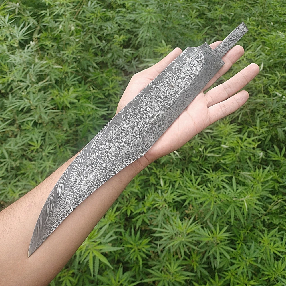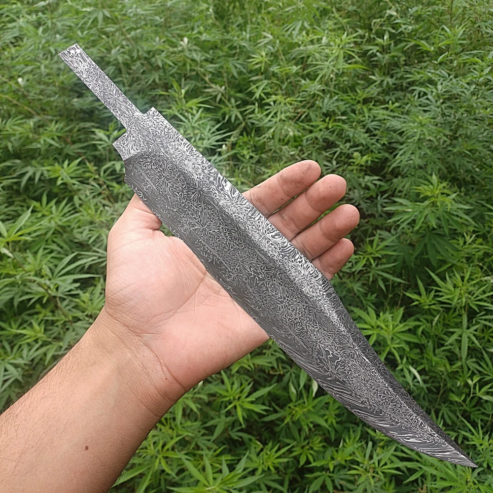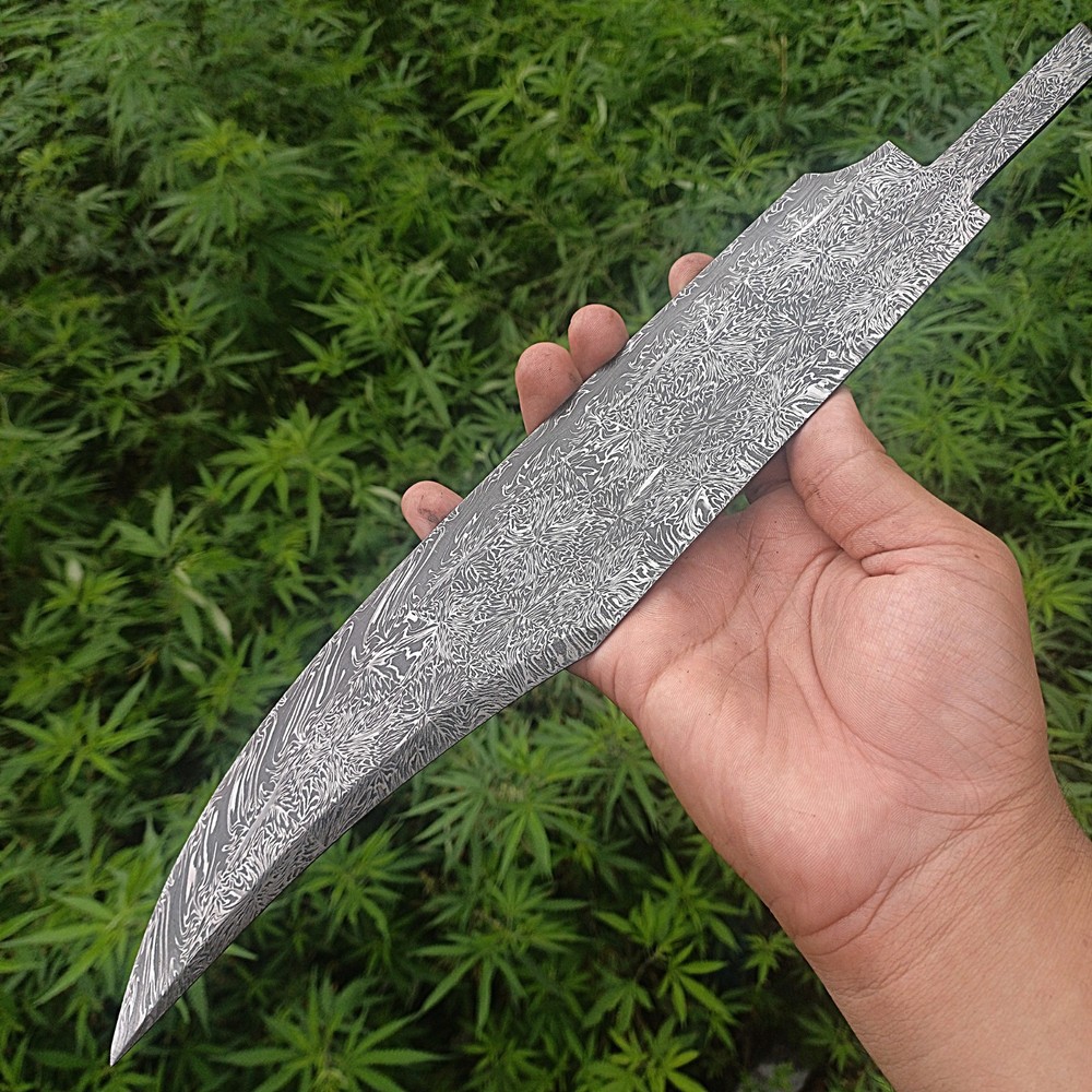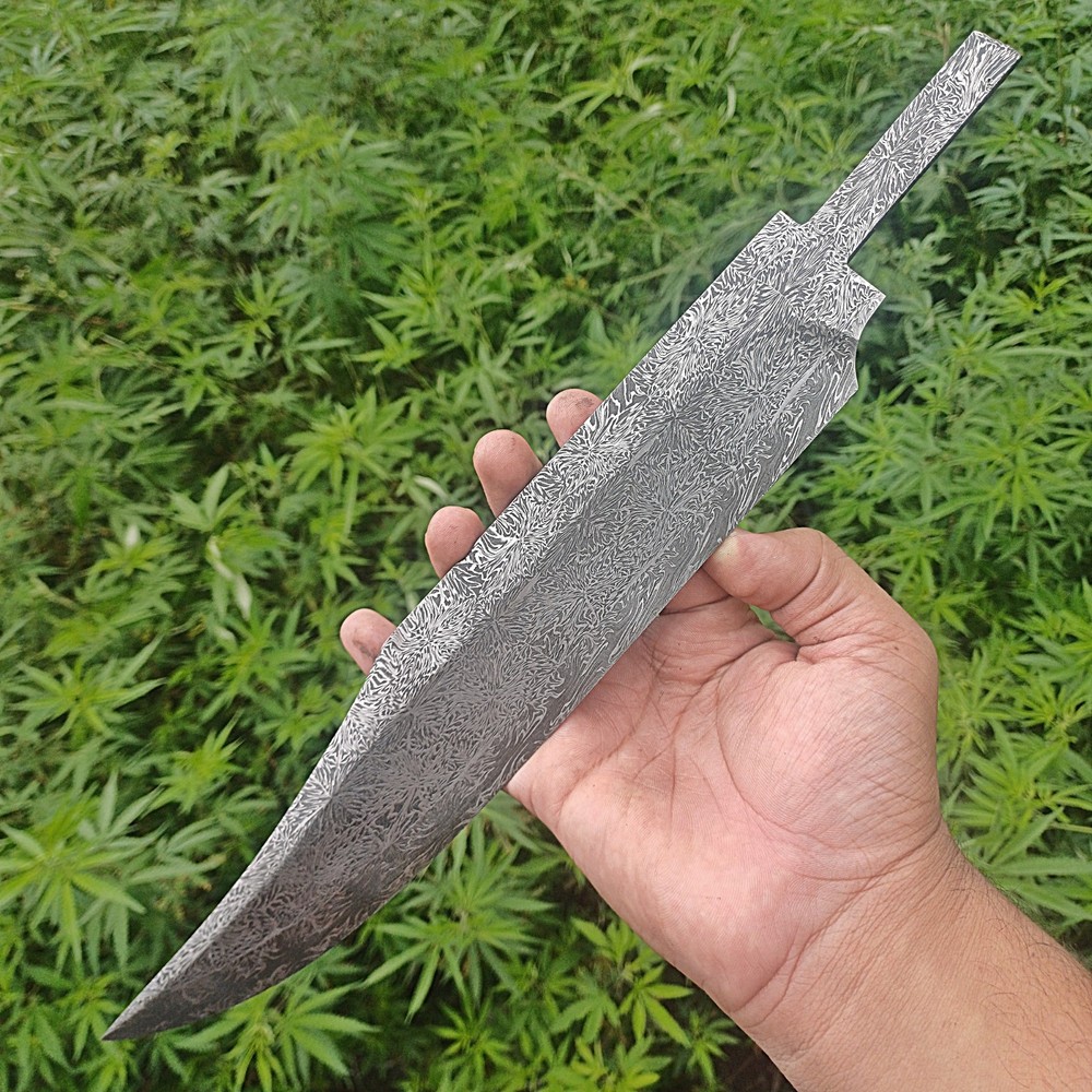 CUSTOM HANDMADE DAMASCUS STEEL BLANK BLADE SURVIVAL HUNTING BOWIE KNIFE Genuine Forged Real Damascus Steel Blade. Blade was given Proper heat treatment and tempered to achieve 55-57 HRC hardness. Blade has precise hand grinds on both sides. Damascus Steel Blade is Genuine Forged blade, not a laser print or etching on surface but Real Damascus Steel forged by hammer Machine, Folded minimum 5 times starting from 11 layers of 1095 High Carbon Steel and 15N20 Steel. Overall Length = 14.25 Inches Blade Length = 11.00 Inches Blade Width = 02.00 Inches Handle Length = 02.50 Inches Blade Thickness = 55-57 HRC Blade Hardness = 5 mm Blade Pattern = Firestorm Pattern IMPORTANT NOTE : FOR ALL REMOTE AREA ADDRESSES PLEASE ALLOW US 5 DAYS EXTRA FOR DELIVERY PLUS 10 DOLLARS OR 10 EUROS EXTRA SHIPPING WILL BE CHARGED BECAUSE FOR REMOTE AREA FIRST WE WILL SEND SHIPMENT TO BUYERS COUNTRY THIRD PARTY ADDRESS AND THAT PARTY WILL USE LOCAL SHIPPING SERVE OF USPS , DHL OR UPS TO SHIP THE ORDER TO CONSIGNEE WE WILL HAVE TO PAY EXTRA 1O DOLLARS FOR TWO TIMES SHIPPING. OTHER WISE REMOTE AREA CHARGES FROM PAKISTAN ARE 35 $ EXTRA THAN NORMAL DHL SHIPPING COST WHICH ARE NOT AFFORDABLE FOR BOTH OF US.
