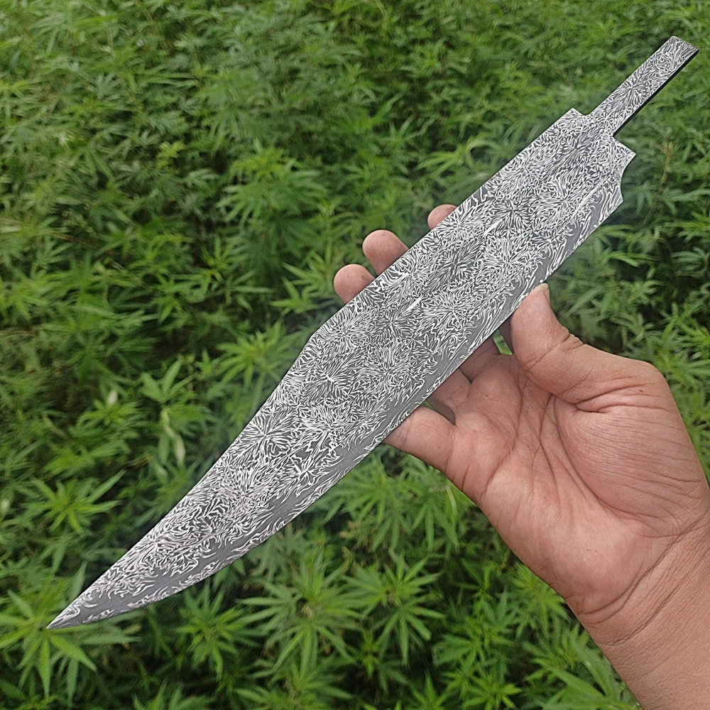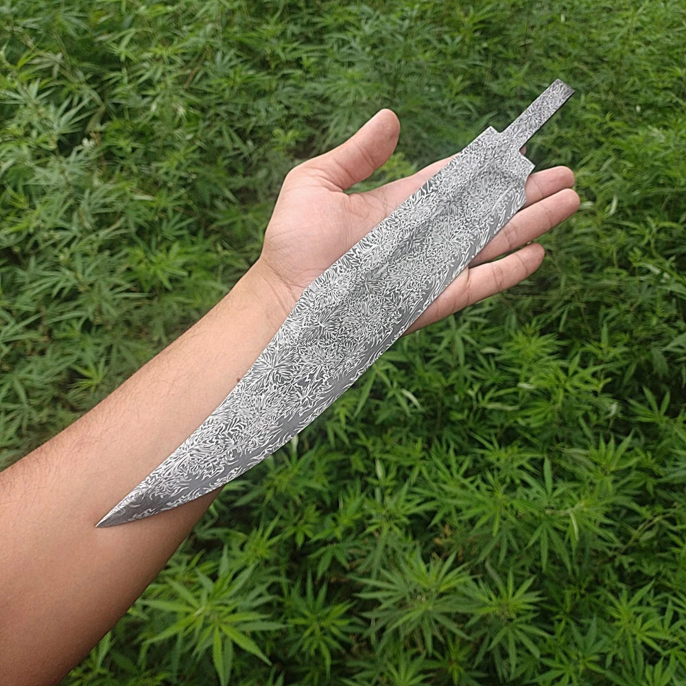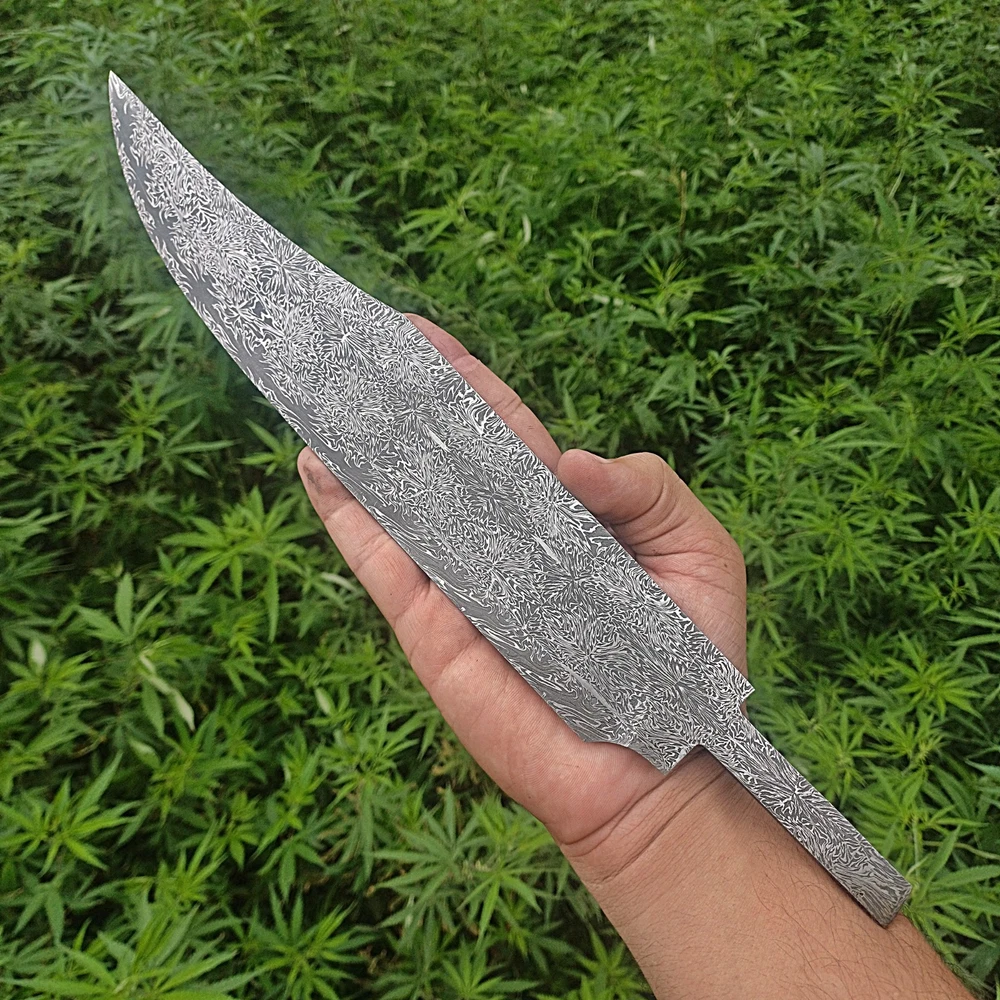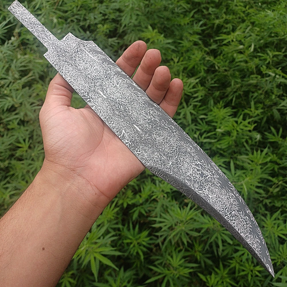 CUSTOM HANDMADE DAMASCUS STEEL BLANK BLADE SURVIVAL HUNTING BOWIE KNIFE Genuine Forged Real Damascus Steel Blade. Blade was given Proper heat treatment and tempered to achieve 55-57 HRC hardness. Blade has precise hand grinds on both sides. Damascus Steel Blade is Genuine Forged blade, not a laser print or etching on surface but Real Damascus Steel forged by hammer Machine, Folded minimum 5 times starting from 11 layers of 1095 High Carbon Steel and 15N20 Steel. Overall Length = 14.25 Inches Blade Length = 11.00 Inches Blade Width = 02.00 Inches Handle Length = 02.50 Inches Blade Thickness = 55-57 HRC Blade Hardness = 5 mm Blade Pattern = Firestorm Pattern IMPORTANT NOTE : FOR ALL REMOTE AREA ADDRESSES PLEASE ALLOW US 5 DAYS EXTRA FOR DELIVERY PLUS 10 DOLLARS OR 10 EUROS EXTRA SHIPPING WILL BE CHARGED BECAUSE FOR REMOTE AREA FIRST WE WILL SEND SHIPMENT TO BUYERS COUNTRY THIRD PARTY ADDRESS AND THAT PARTY WILL USE LOCAL SHIPPING SERVE OF USPS , DHL OR UPS TO SHIP THE ORDER TO CONSIGNEE WE WILL HAVE TO PAY EXTRA 1O DOLLARS FOR TWO TIMES SHIPPING. OTHER WISE REMOTE AREA CHARGES FROM PAKISTAN ARE 35 $ EXTRA THAN NORMAL DHL SHIPPING COST WHICH ARE NOT AFFORDABLE FOR BOTH OF US.