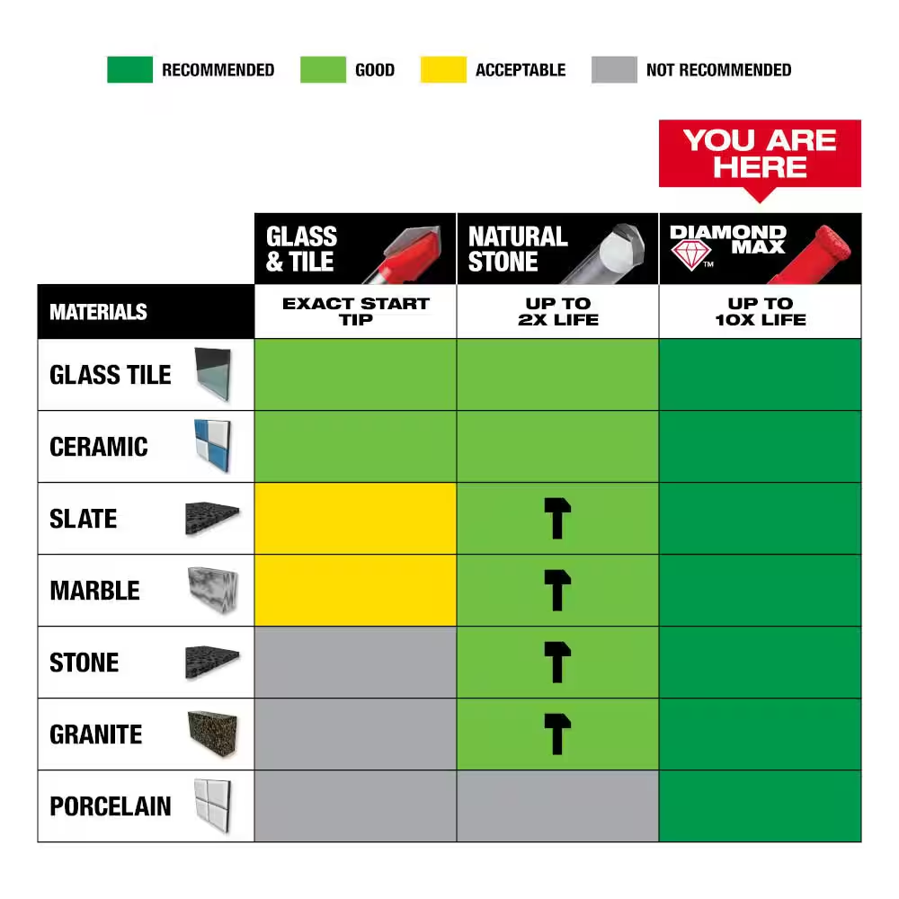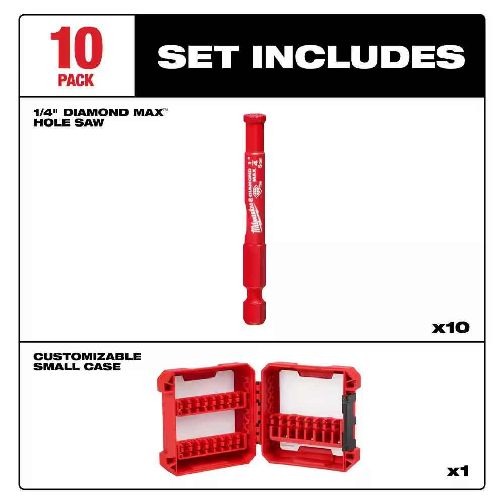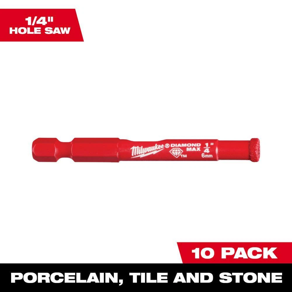 Fast Shipping On All Items 30 Days Money Guarantee Customer Support Excellent Service 100% Satisfaction Satisfaction Guaranteed 1/4 In. Diamond Max Hole Saw (10-Pack) Specification Arbor Size 0.25 in Arbor included No Bit Material Diamond Drill Bit Type Hole Saw Drill Bit Type(s) Included Hole Saw Individual/Set Individual Material Cut Multi-Purpose Min Chuck Size Required 1/4 In. Pilot Bit Included No Returnable 90-Day Teeth Per Inch N/A Tools Product Type Power Tool Bit Diameter 1/4 in Bit Length (in) 1.50 in Drilling Depth (in) 1.50 Hole Saw Diameter (in) 1/4" 1.5 inches. Item Description Unmatched cuts in porcelain Maximum diamond durability and retention Fastest cutting in porcelain Cut tile, stone and glass with this Milwaukee 1/4 in. Diamond Max Hole Saw 10-pack. They deliver up to 10 times longer life as you cut. With higher grade diamonds for maximum heat and fracture resistance, Diamond Max Hole Saws provide best-in-class performance. Diamond Max features the lowest cost-per-hole on the market. Improved continuous brazed edges offer clean, superior joint strength, and better diamond retention when cutting hard, abrasive materials. The one-piece hole saw comes with a 1/4 in. quick-change hex shank and has a large slug ejection slot. The kit includes a small case for 1/4 in. hex bits, designed for use in Packout, giving universal bit storage for all 1/4 in. hex shank bits. Diamond Max: Greater durability and toughness delivers up to 10 times longer life Higher grade diamonds and improved braze: Provide best-in-class performance Maximum heat and fracture resistance Large slug ejection slot: Offers easy plug removal Improved braze provides superior diamond retention Optimized for porcelain, tile and stone Case is designed for use in Packout Universal bit storage: Fits all 1/4 in. hex shank bits For use in drills Set includes: (10) 1/4 in. Diamond Max Hole Saws Need help with a home project? Let us do it for you - 1 800 HOME DEPOT or visit Home Depot.com/services About us We offer the best prices around on high quality products. Our E-store includes media such as books, movies, music and games while offering electronics, toys, sporting apparel, clothing, tools, general home, garden items and more. Shipping We are always working hard to ensure your package arrives as soon as possible. Please understand that some factors like weather, high postal traffic, and the performance of shipping companies are outside of our control. We offer free shipping to the lower 48 states and ship within 2-3 business days of payment, usually sooner. We do not accept P.O. Boxes. Please provide a physical address. For shipping outside of the continental USA, we only use eBay's Global Shipping Program.The item is shipped to KY and then sent to the rest of the world. International customers are responsible for all duties and taxes. Continue to check out to calculate costs for shipping the item to your country. Messages regarding eBay's Global Shipping Program MUST be directed at eBay EXCLUSIVELY. Returns We offer a 30-Day Return Policy on items in which you are not completely satisfied with. You have the option of a full-refund or an exchange of the item. No returns are available on items shipped outside of the USA Satisfaction We try over very best to make sure every customer is completely satisfied. If there's a problem, message us! We're happy to help. Payment Options Shop With Confidence