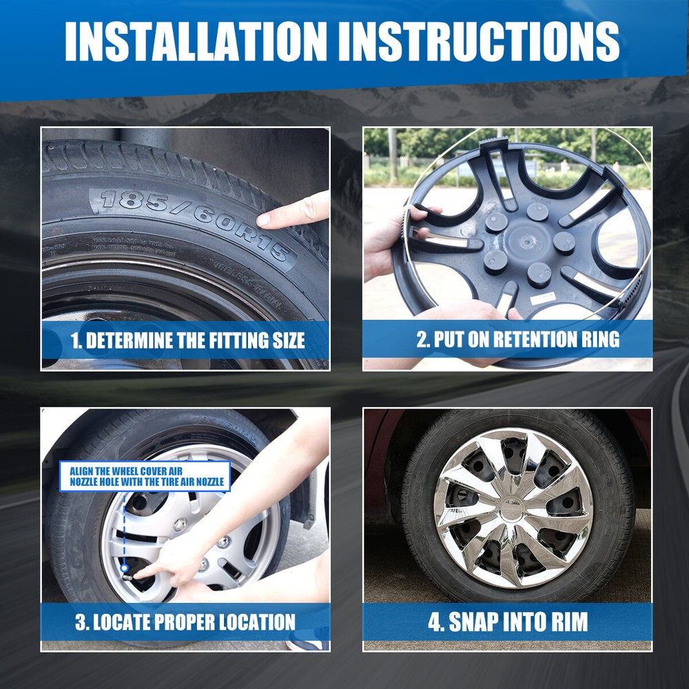 Feature: 👍 Please ensure to check your tire/wheel size before purchase! designed for (p14) 14" stock steel wheels and will not fit over aluminum alloy wheels. 👍 Designed from oem replica style wheels– for replacement with fast & easy snap-on installation - made from premium abs material – lab & road tested for performance and ultimate durability. 👍 Adjustable retention rings assures firm grip gives support to the hubcaps making sure they stay in place. locate the curve on the retention ring and match to the tire air valve to install. 👍 Installation instructions available - please refer to the images available as well as detailed instructions below for assistance. 👍 Wolfx wheel covers fit most models of vehicle brands including acura, chevrolet, dodge, ford, honda, hyundai, kia, mazda, mitsubishi, nissan, subaru, toyota, volkswagen and more. Specification: Quantity: 4 PCS Material: ABS Color: Glossy & Chrome Lacquer Wheel Size: 14 inch Finish: Glossy Placement on Vehicle:Front/Left/Rear/Right Package Includes: 4* Wheel Cover Hubcaps