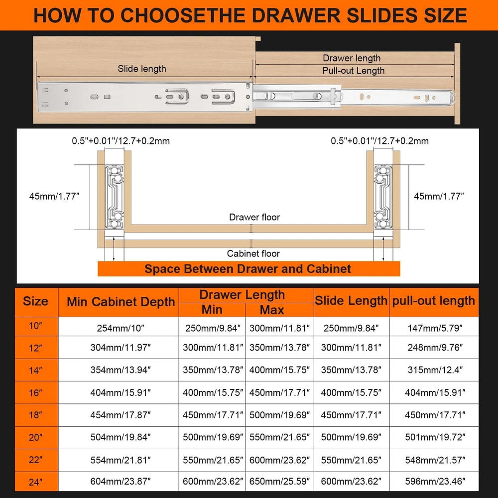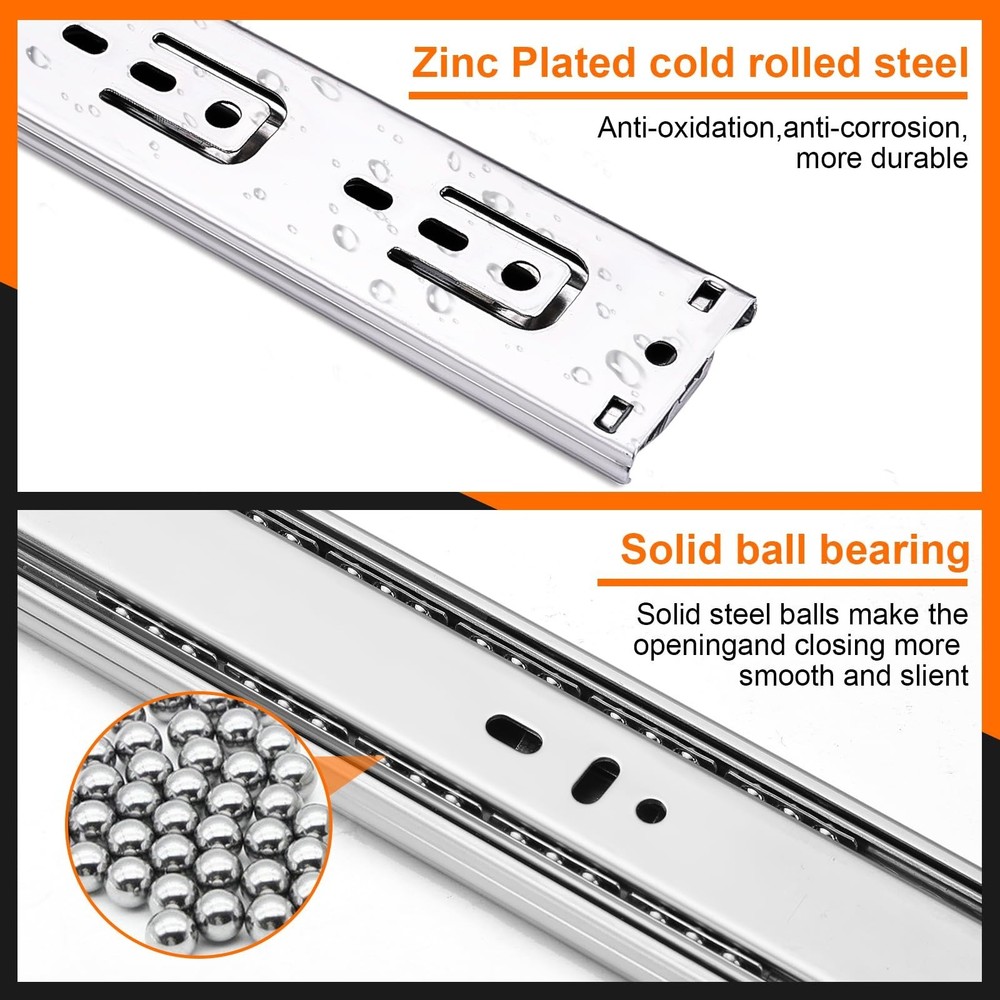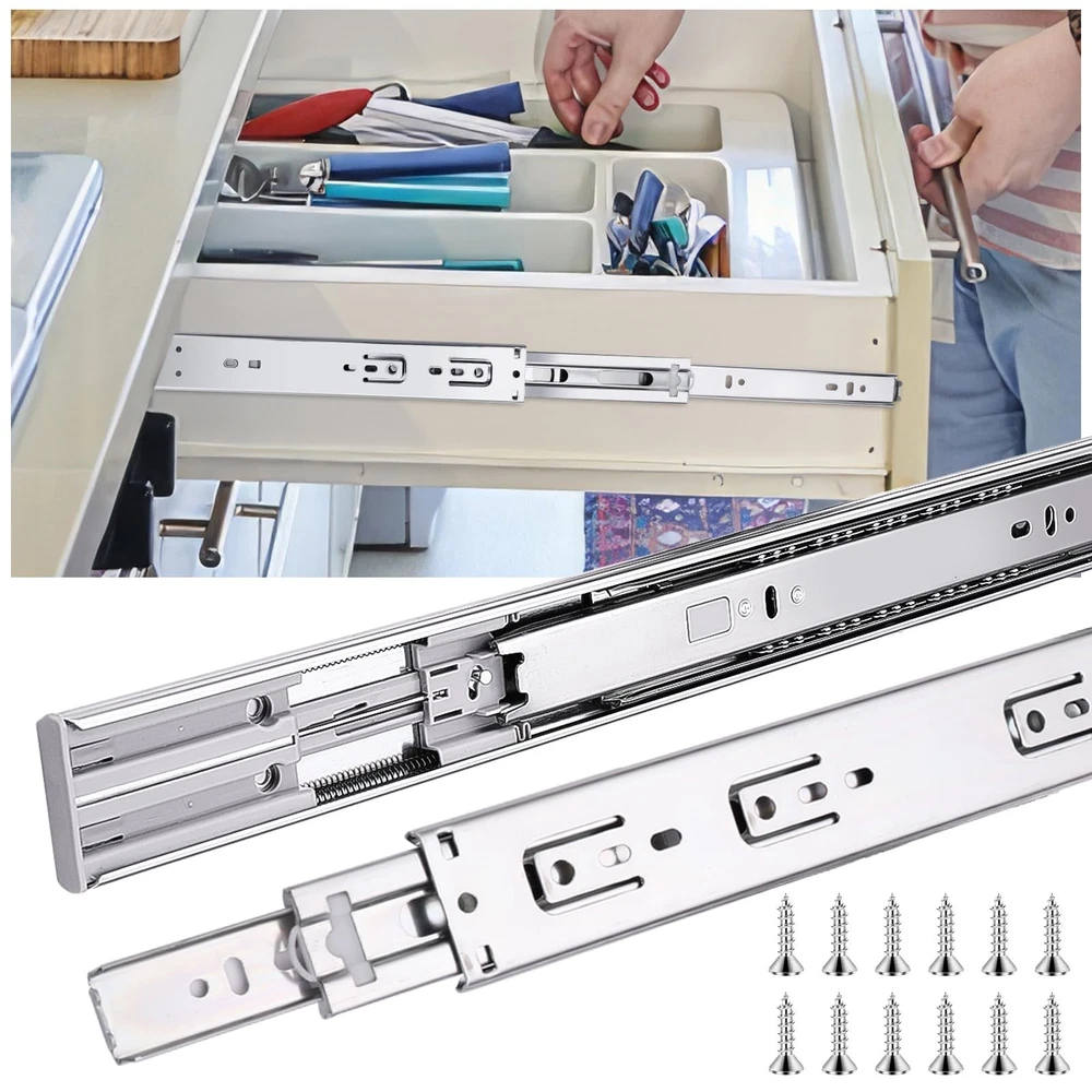 14 inch Drawer Slides 6 Pairs (12pcs) Soft Self Close 3 fold Full Extension Ball Bearing Cabinet Drawer Glides Side Mount for Dresser, Cabinet, Kitchen 100 LB Capacity 14" Silver Product Details Size: 14inch-350mm Brand: JI2OOYI MPN: 14inch-6-S UPC: Does not apply EAN: Does not apply Color: Silver Material: Alloy Steel Brand: JI2OOYI Product Dimensions: 14"L x 1.77"W x 0.47"Th Finish Type: steel Mounting Type: Side Mount Weight Limit: 100 Pounds Drawer Type: soft close drawer slides Manufacturer: JI2OOYI Number of Items: 12 Part Number: 14inch-6-S Item Weight: 11.42 pounds Product Dimensions: 14 x 1.77 x 0.47 inches Country of Origin: China Item model number: 14inch-6-S Size: 14inch-350mm Finish: steel Item Package Quantity: 6 Maximum Weight Capacity: 100 Pounds Included Components: 6 pairs of drawer slides,mounting screws Batteries Included?: No Batteries Required?: No Date First Available: November 1, 2022 [6 pairs Soft Close Drawer Slides]:You will get 6 pairs(12pcs) soft self close drawer slides ,14 inch. And each drawer slides match with 12pcs screws. JI2OOYI self close drawer slides designed with ultra smooth soft-close function. Continuous bearings ensure smooth and quiet performance that offer less noise at closing and opening. [Guide for Choosing Size of Drawer Slides]:Side installation.The length of slides can't be longer than the cabinet case depth. Face frame cabinets will require a rear mounting bracket, whereas for faceless cabinets the slides are mounted directly on the side.To determine which size of slides are good for your drawer, please measure the length of the drawer without the frame board. And if the length is not even, please choose 1 inch shorter. [High-Grade Material]:All of the drawer slides which made by JI2OOYI are made from high-grade cold rolled steel that is electrom zinc plated.Rust resistant for your lifetime use.Side mounted Steel ball-bearing action.100 LB capacity. [3-Fold full extension & Detachable]:The 3-fold full extension allows for the entire drawer to be accessed.Three-stage stretching can pull out the drawer completely.Make full use of your drawer space.There is a plastic buckle on the back of the slide rail, by pressing it,the 3rdtrack(the narrowest section) can be separated.Easy to take down and clean.At the same time,double anti-drop function would prevent drawer separate from cabinets. [Application range]: JI2OOYI drawer slides are available in 10inch, 12inch,14inch,16inch,18inch,20inch,22inch.Various choices for drawers in your kitchen,bathroom,bedroom,office with different depth.It also can apply to ,keyboard drawers,wardrobe drawers,wooden or steel drawer,cabinet drawers,toolbox drawers that with demand for big load-bearing capacity.