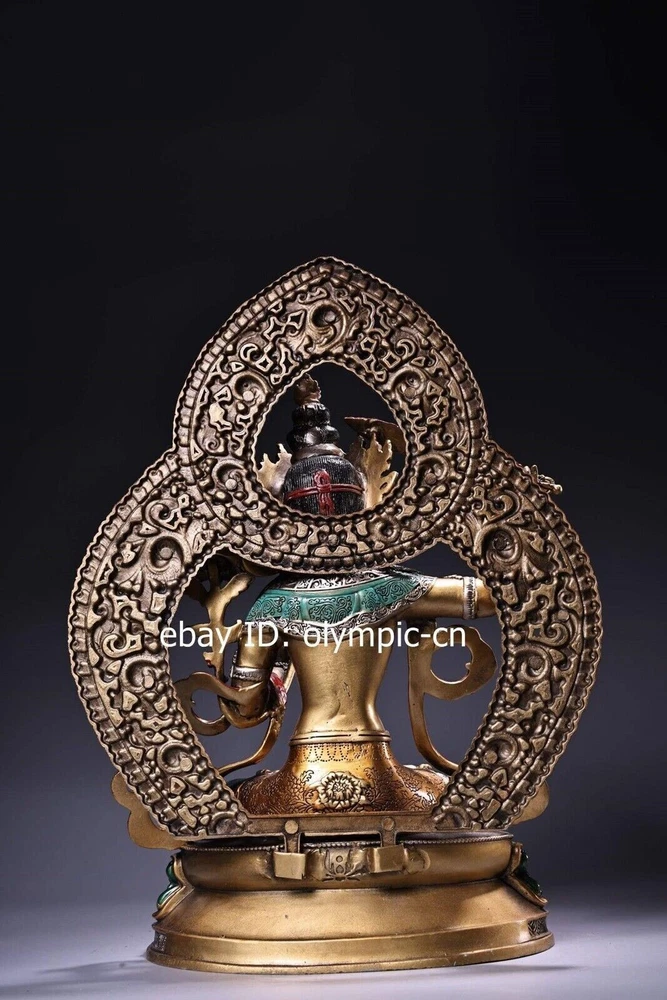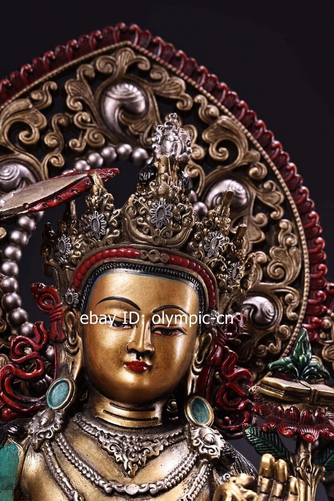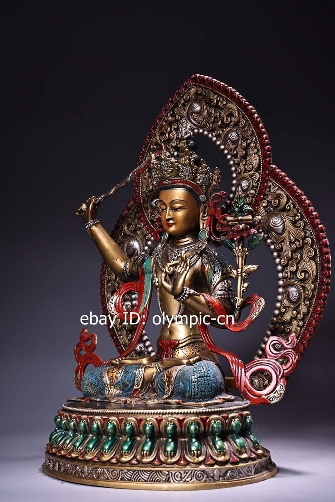14'' Nepal bronze colored drawing handicraft buddhism Manjusri Bodhisattva product size: Height 36 c m. Long 25 cm . Breadt 15 c m 1 inch=2.54cm 1pound=0.4536kg Weight: Abo ut 4 kg ---without included the weight of packing materials Condition:Very Good.