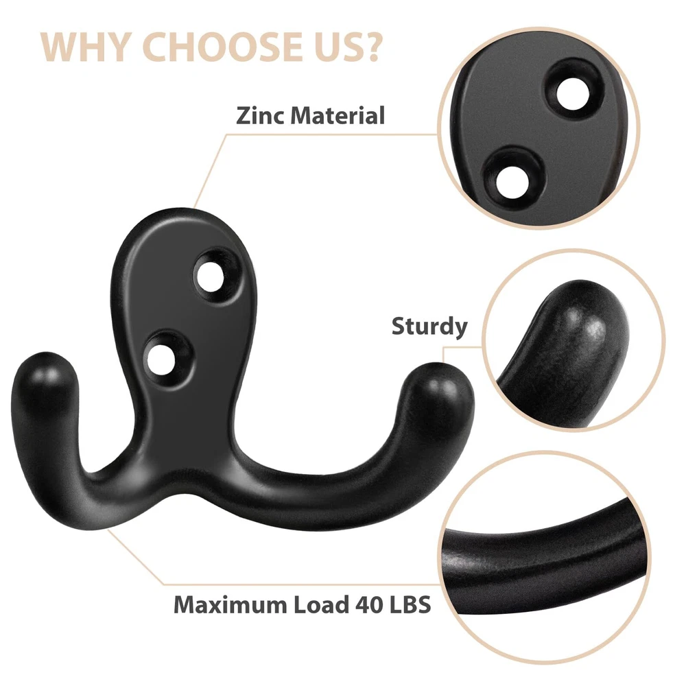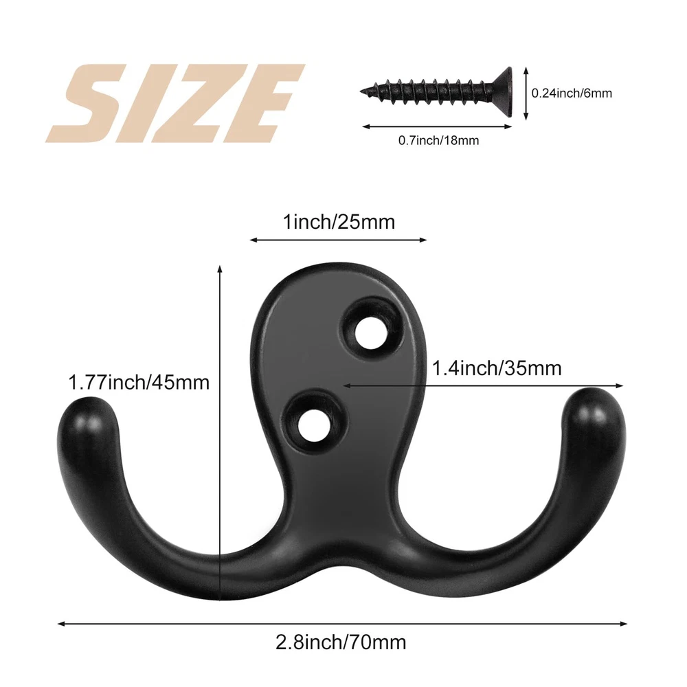 【Metal Wall Hooks Strong & Sturdy】Keep everything organized & within reach! The heavy duty double prong metal hooks are made of good quality zinc die cast material, the screws are made of iron, it can easily hold up to 40 lbs of weight, very strong sturdy and beautiful, hooks easy storage and long-term use, meet your storage needs. 【Super Cost-effective Set】14 x Black coat hooks, 28 x screws, double hooks design beautiful rustic, suitable for most decoration. closet hooks can help you organize clutter quickly, meet your different hanging needs. 【Wide Application & Space Saver】Wall hooks for hanging purse, jackets, robe, towel, coat, bag, hat, cup, key as well as Christmas socks and Christmas wreath etc. Perfect for use in bedroom, closet, bathroom, living room, entryway, and make them easy to find, helps you to save space and keep everything in order. 【Size & Specification】The hat hooks dimension is 2.8 x 1.77 inch, easy for installation, screws are 18 mm long and 6 mm in screw head diameter. 【Easy to Use】The towel hooks adopt drilling installation way, you can use the screws to mount hooks directly to closets or walls or doors.