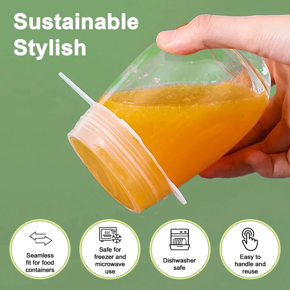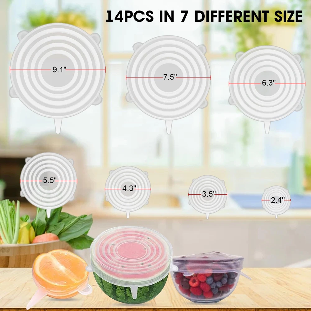 FLEXIBLE and STRETCHABLE: We offer you 14 pcs premium reusable silicone food covers with 7 different diameter sizes: 2.4inch/6cm, 3.5inch/9cm, 4.3inch/11cm, 5.5inch/14cm, 6.3inch/16cm, 7.5inch/19cm and 9.1inch/23cm. The silicone lid can double-stretch for easy food storage. Make sure the lid and container are completely dry before use so that they fit tightly to the container. Choose a lid 1-2 inches smaller than your container for the best seal SAFETY& HEALTH: These silicone bowl covers for food storage are made of food-grade silicone and are free from harmful chemicals, ensure your food stays safe and the health of the family. The stretch lids have a soft texture and will not tear or warp, you can use them to cover most foods and put them in the refrigerator, microwave, and dishwasher SAVE SPACES & EASY to CLEAN: Our stackable silicone food covers keep food fresh, prevent spilling and spattering, as well as help you easily organize your kitchen to store more food. The unique silicone material makes the lids easy to clean, such as rinse them with warm, soapy water or throw them into the dishwasher GOOD SEALING, NOT LEAKAGE: The silicone bowl cover can form a sealing vacuum environment on glass, plastic, or metal containers. It keeps fruits, vegetables, beverages, and other foods fresh and prevents them from overflowing and adoring. The silicone stretch lids have good air tightness, when you use them in a microwave oven, please open the lid partially so that steam can escape HIGH TEMPERATURE and REUSABLE: Silicone lids for food storage can accept low-temperature storage and high-temperature disinfection (-140 °F up to 464 °F). Suitable for refrigerators, microwave ovens, dishwashers, and picnics. Using this reusable silicone food cover replaces expensive plastic wrap, reducing plastic waste and helping you save money