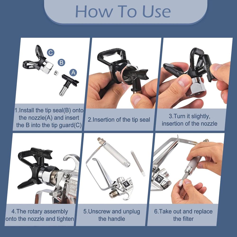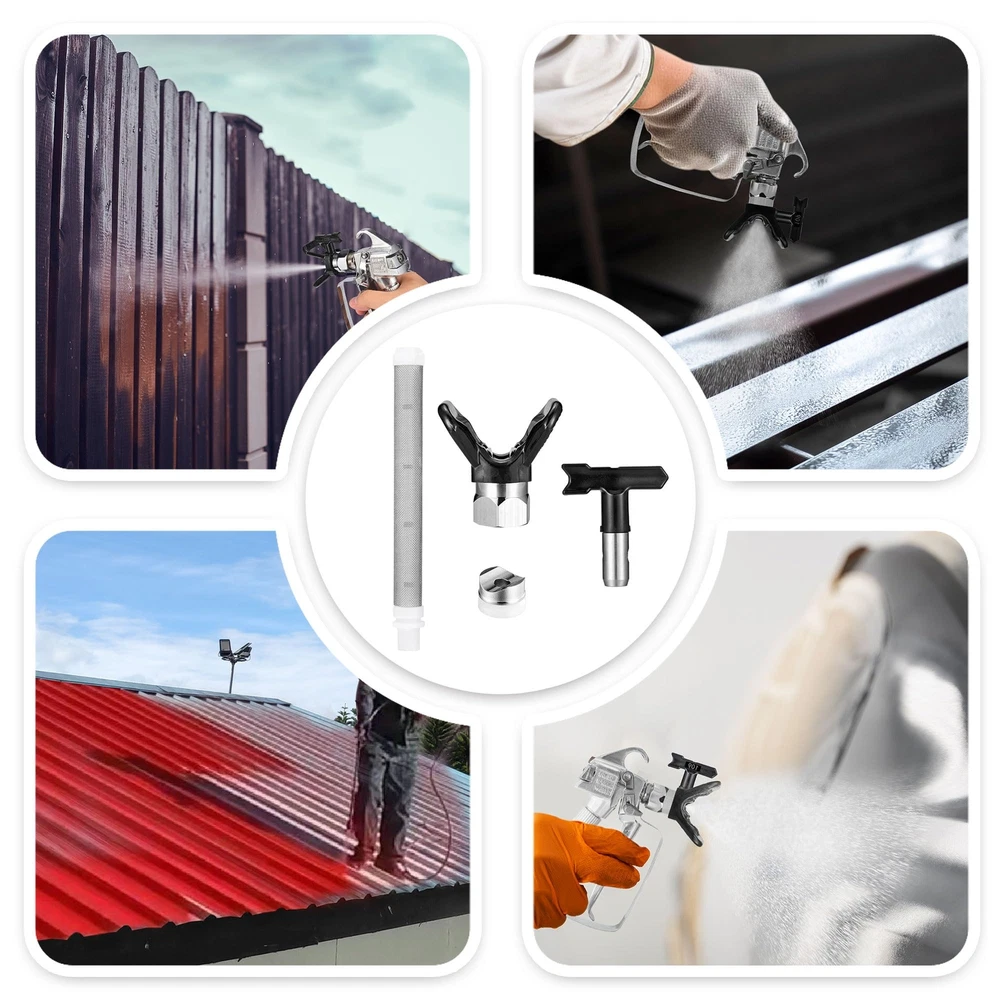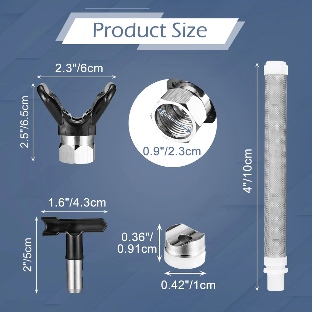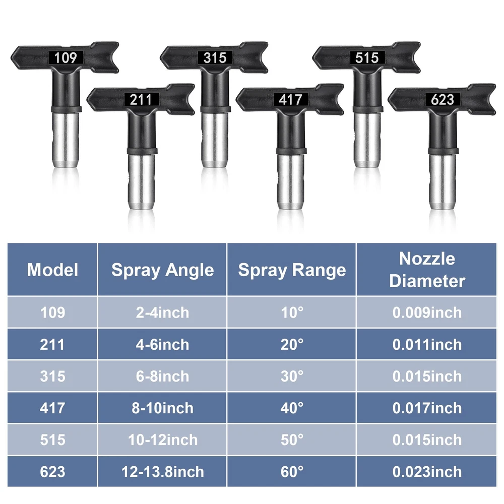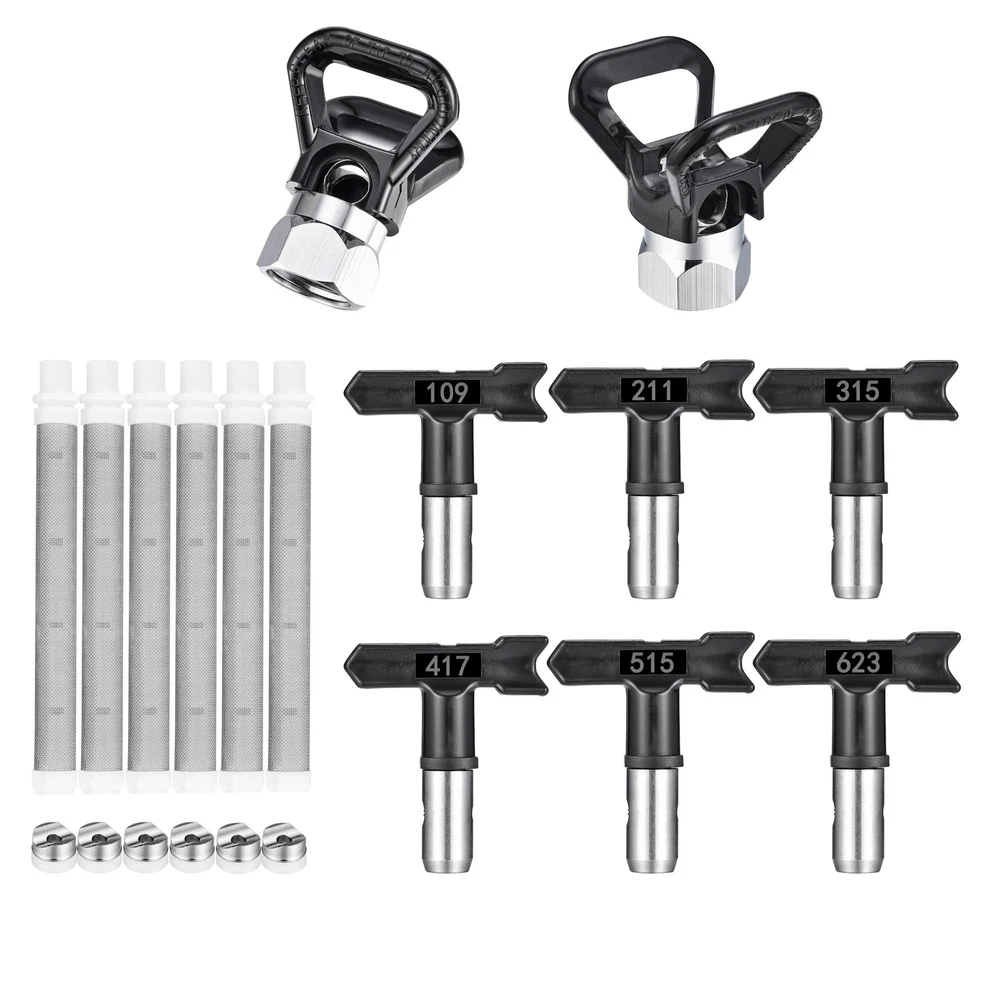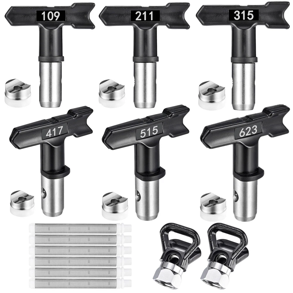 Airless Sprayer Tips Set: Package includes 6 x airless spray paint nozzles, 6 x paint spray filters and 2 x nozzle tip guards. Each nozzle comes with a nozzle seal and the nozzles fit most airless sprayers. Compatibility: These paint sprayer tips are with most airless paint sprayers, paint sprayer tips models: 109, 211, 315, 417, 515, 623 corresponding nozzle diameters are 0.009'', 0.011'', 0.015'', 0.017'', 0.023'', and the spray range is 2 to 14 inches. Good Quality: The paint sprayer tip and nozzle tip guard are made of hard metal and plastic, sturdy and not easily deformed. The total length of the sprayer filter is about 3.94'' / 10 cm, the mesh is uniform, easy to clean, just rotate the nozzle to clean. Easy to Install: Airless sprayer nozzles are easy to use and require no additional tools; install the tip seal onto the nozzle, then insert the tip seal into the guard base and rotate to complete the installation. Widely Application: There are a variety of spray tips models to choose from to meet your different needs. The airless paint spray nozzles are suitable for paint, furniture, fencing, home decoration, industrial fine paint and more, it is a practical and useful tool.