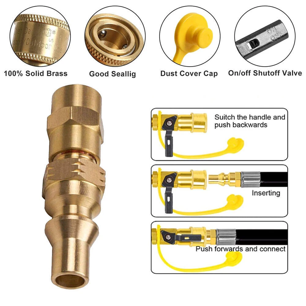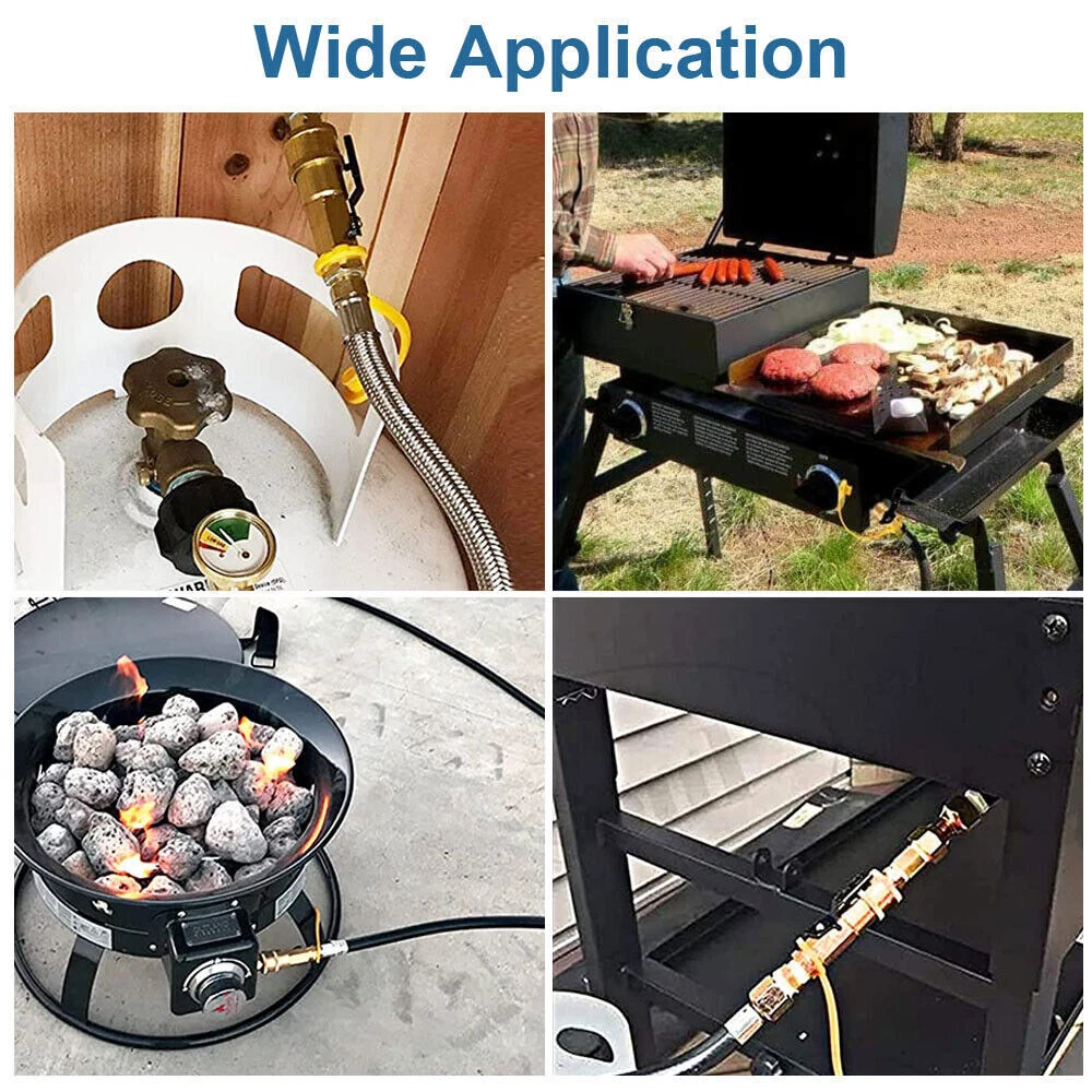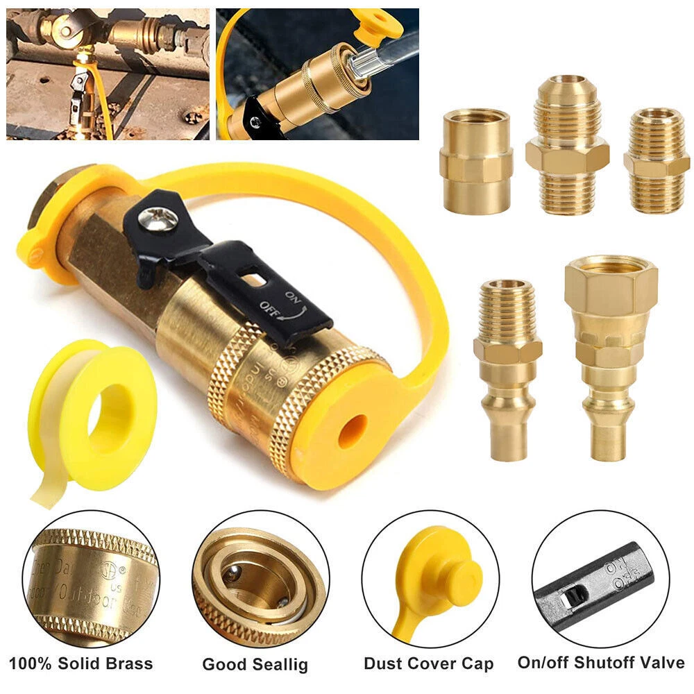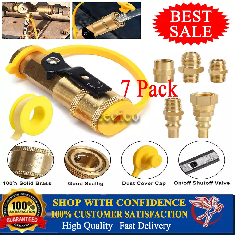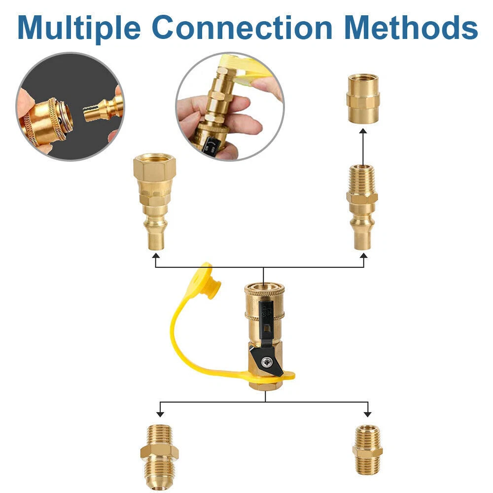 7Pcs RV Quick-connect Fittings BBQ Grill Adapter 1/4" NPT Propane Hose Adapter RV Propane Quick Connect Fitting Adapter Kit. This assembly kit includes a 1/4" Female NPT x Female Quick Connect with shutoff valve, full flow plug 1/4" Quick Key Connect Plug x 3/8" Female Flare adapter, 1/4" Male NPT x 1/4’’ Male Quick Connect, 1/4" Female NPT x 1/4’’ Female Quick Connect, 1/4" Male NPT x 3/8" Male Flare Fitting, 3/8" Flare x 1/4" NPT Male Pipe Half-Union Fitting,1 Teflon Seal Tape. PLEASE NOTE: THE KIT WORKS WITH LOW PRESSURE SYSTEM ONLY! Shut-off Valve for Convenient Use. Save time by turning your gas flow ON or OFF for a single quick connect appliance without having to open or close your whole RV propane source. Quickly and easily add a convenient connect/disconnect method. Let you use a propane supply on a RV camper or trailer that has built-in quick connect propane connection. Easy to Install & Enjoy the DIY. You can use them separately or in combination. Just connect the quick coupler to your RV gas source and quick connect propane appliance, and the pipe fitting connect two pipes going in the same direction to extend pipe length. The Teflon thread sealing tape provided to wrap on the thread, tighten by adjustable wrench. PREMIUM QUALITY. These propane quick connect fittings are made of solid brass, which are weather resistant, high temperature resistant, anti- corrosion and not easy to break. Thick solid brass construction fittings provides secure, airtight connection. Wide range of applications: Gas Grill Hooks for BBQ, Portable Heater Hooks, Camping, Hunting, Fishing Hooks, Vehicles, Fish Stoves, Smokers, Torch Hooks. Connected to gas tank and electrical appliances. Specification: Set quantity: 7 pieces Size: 1/4" RV Propane Quick Connect Material: Made of 100% brass, especially durable and strong for long-term use Type: Low Voltage Adapter, High Voltage Quick Connect Applicable to: gas appliances Gas Type: LPG, Natural Gas, Propane, Butane Working Temperature: 50 to120℃ (-60 to 250F) Flow Capacity: 80000 BTU/HR Item Type: RV Propane quick connect fittings With Shut Off: Yes For use with low-pressure propane system Package List: 1pcs 1/4" female NPT x female quick connect with shutoff valve 1pcs 1/4" quick key connect plug x 3/8" female flare adapter 1pcs 1/4" male NPT x male quick connect full flow plug 1pcs 1/4’’ x 1/4" NPT hex nipple coupling 1pcs 1/4’’ x 1/4" brass pipe coupler 1pcs 3/8 Inch Male Flare x 1/4 Inch NPT Male Pipe 1pcs Teflon seal tapes NOTE: Low Pressure Use Only! It is NOT intended to be connected directly to a high pressure propane tank and will leak if this is how you try to use it.