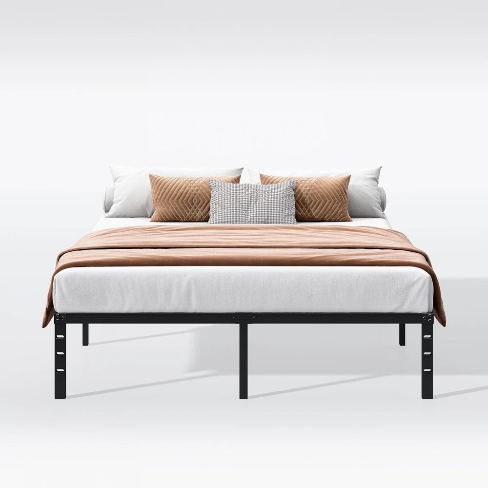 About this item MINIMALIST STYLE:Bed frame features a sleek, classic design that's well-structured so adults can easily move it anywhere.Queen bed frames sturdy, simple and beautiful, easy to install, allowing you to maximize the space in your small bedroom. STURDY CONSTRUCTION:Queen bed frame is made of high-quality metal material, and the reinforced legs prevent the structure from twisting. The sturdy platform bed frame black color scheme is more stylish in the room style, with strong bearing capacity and can support higher weights. NOISE REDUCTION DESIGN :The metal bed frame is sturdy, with metal tube support to avoid any noise of activity. EASY ASSEMBLY: Metal platform bed frame all the required hardware and tools are available, easy to assemble and disassemble, just follow the instructions and the installation is complete. Note: Queen size bed frame does not come with a mattress. UNDER-BED STORAGE: 14 inch heavy duty frame bed,can store a variety of items, you don't need to worry about things piling up and cluttering the space.Queen bed frame no box spring required abundant storage space will give you a clean and tidy room.
