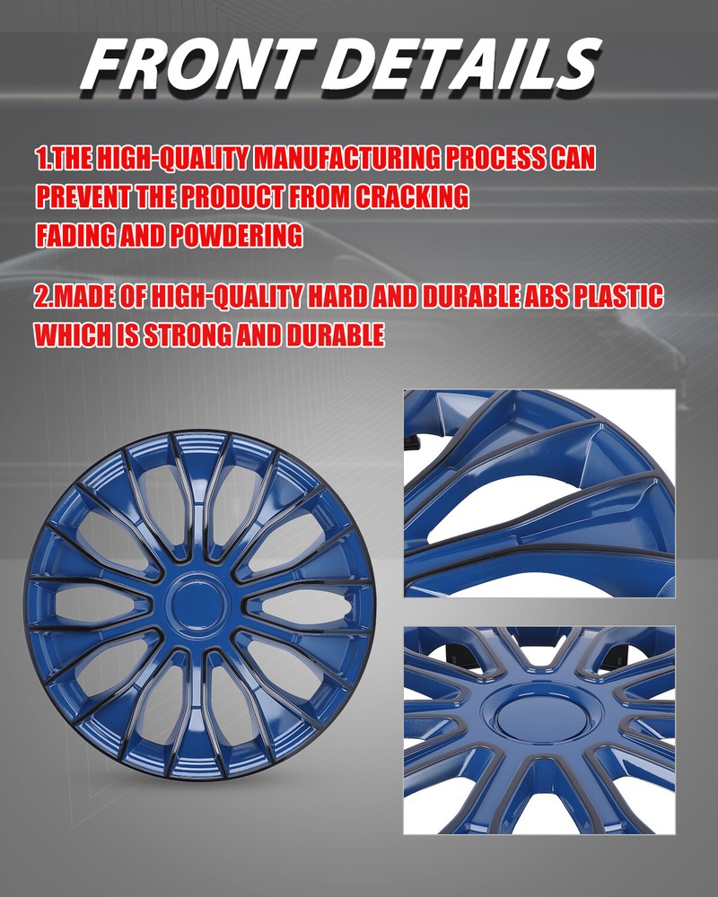 Store Categories Other Car Refrigerator Front Bumper Rear Bumper Fender Flares Inner Fenders Side Steps Running Board A-Pillar Light Mount Brackets Headlights Taillights Fog Lights LED Headlights LED Taillights LED Fog Lights Jeep Chevrolet Ford Toyota Dodge GMC Wheel Covers Features ✔ PERFECT FIT: This wheel hub cap is specifically designed to perfectly fit for 14-inch wheels, ensuring a seamless match and enhanced aesthetics. It complements the overall design of the vehicle, elevating its visual appeal. ✔ HIGH-QUALITY MATERIAL: Constructed from high-quality materials, this wheel hub cap guarantees durability and longevity. It withstands various road conditions and environmental factors encountered during daily driving, maintaining its pristine condition. ✔ EASY INSTALLATION: Installing this wheel hub cap is a breeze and requires no specialized tools or modifications. It comes with a user-friendly system, allowing for a hassle-free installation process by following the provided instructions. ✔ PROTECTIVE FUNCTION: Besides its aesthetic appeal, this wheel hub cap serves as a protective barrier for the wheels. It prevents scratches and potential damage caused by stones, debris, or other objects, safeguarding the wheel's surface. ✔ AFTER-SALES SERVICE: If There Is a Loss of Product Parts, or Any Parts of The Problem, We Can Provide After-Sales Service, Please Contact Us on The Order Page. ️ Wheel Covers Specification ✔ Type: Hub caps ✔ Number in Pack: 4 ✔ Color: Black Lacquer & Blue Lacquer ✔ Material: ABS ✔ Compatible Wheel Diameter: 14 in ✔ Finish: Glossy ✔ Installation Type: Snap-On ✔ Model: Universal Hubcap for Iron Wheels Wheel Covers Package ✔ 1 Set of 4 Hub caps and 4 retention rings Payment Delivery details Terms of sales About us Contact us Payment We accept PayPal, credit card , Apple Pay & Google Pay etc. Delivery details All items will be shipped within 1-3 business days after payment received, we will try our best to ship out as soon as we can, hope for your understanding. Please double confirm your address and contact information, which will help the delivery faster and more accurately. Note :buyers who purchase international products need to pay import tariffs!!! Terms of sales Professional installation is highly recommended. Any problem of the item please feel free to contact us first , please D o Not leave negative feedback before that, or simply return it within 60 Days in original condition. We will resolve it for you ASAP. About us Any questions please do not hesitate to contact us directly by eBay message . We will reply you within 24 hours asap, thanks for your understanding. Contact us Should you have any problem or require any further information please feel free to contact us . If you are satisfied with our product and service, please kindly leave us a positive feedback. Popular Categories