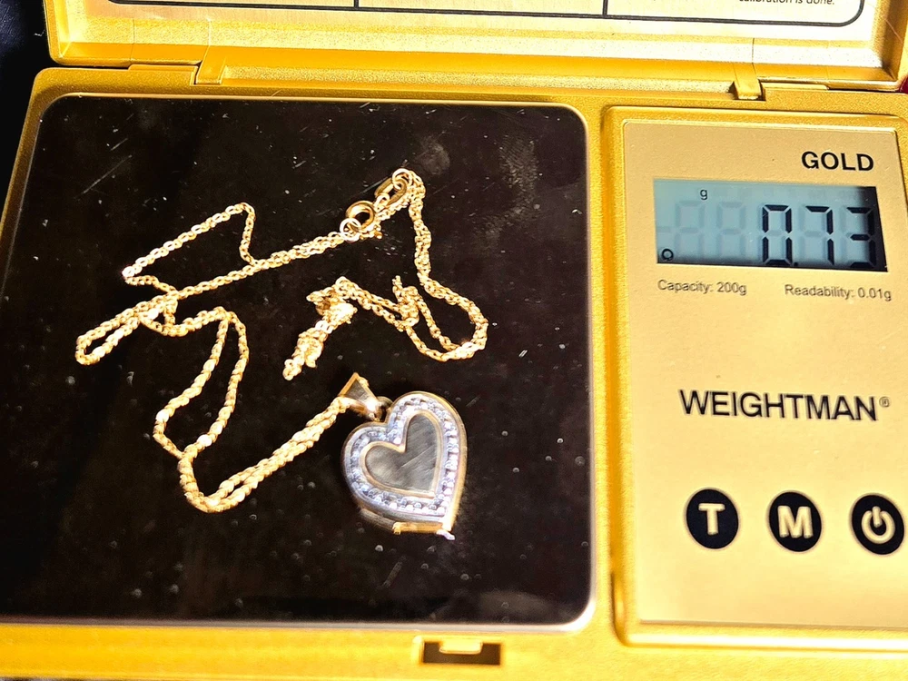 This locket is solid 14k not gold filled or plated. The chain is super dainty and it is solid 10 k. please refer to pics for stamps, weight is .73 g.