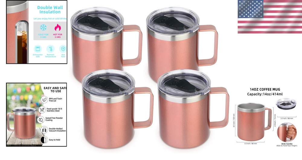 14 oz Leakproof Travel Coffee Mugs in Rose Gold - 4 Pack for Hot & Cold Drinks ‹ › ‹ › ‹ › ‹ › ‹ › ‹ › ‹ › ‹ › ‹ › 14 oz Leakproof Travel Coffee Mugs - Rose Gold 4 Pack Elevate your beverage experience with our stunning collection of leakproof travel coffee mugs, designed not just for utility but also for elegance. Perfect for both hot and cold drinks, these mugs are your ideal companions for every journey, whether at home, in the office, or on an outdoor adventure. Features: Upgraded Cup Lid: Enhanced with a sleek black sliding piece for superior dirt resistance and a thickened silicone ring to prevent overflow, even when inverted. Design: Crafted from high-quality 18/8 stainless steel, these mugs are durable, rust-resistant, and effortlessly stylish with a logo-free design ideal for personalization. Vacuum Insulation Technology: Designed with double-layer vacuum insulation to keep your beverages hot for more than 3 hours and cold for over 9 hours. Multipurpose Use: Each 14 oz mug is perfect for daily use—at home, in the office, or during outdoor adventures such as beach outings and camping excursions. Gift-Ready: A wonderful surprise for birthdays, Mother's Day, Father's Day, and Christmas—perfect for celebrating special moments with loved ones. 100% Satisfaction Guarantee: We take pride in our products. Should you encounter any issues, our dedicated customer service is here to provide you with a satisfactory solution. Why Choose Our Travel Coffee Mugs? With their exquisite rose gold finish and unmatched functionality, these travel coffee mugs stand out not only for their beauty but for their resilience. Whether you're enjoying your morning coffee at your desk or sipping beverages on a scenic hike, these mugs promise to deliver both style and performance. Invest in your hydration journey and indulge in every sip. Don’t miss your chance to own this exquisite set—drink freely and live fully with our stunning travel coffee mugs. Order your 4 pack today! Shipping Free & Fast Shipping - We offer free shipping to most of the USA with a normal delivery time of 3-7 days. However, due to the current situation, additional delivery time (up to 3 weeks) may be required for some items. Alternative Carriers - We may use alternative carriers (e.g. USPS, FedEx, UPS, etc.) to ensure your package arrives safely and on time. Due to the use of multiple carriers, we are unable to provide a tracking number automatically. Handling Time - Orders are processed and shipped within 1-2 business days of receiving cleared payment. Shipping Restrictions - Shipping to Alaska, Hawaii, Puerto Rico, Guam, and other US territories may incur shipping charges or delivery restrictions. Please contact us before ordering, or your order can be refunded/cancelled. State Restrictions - There may be restrictions based on your state of purchase. For example, certain items may not be shipped to California due to state regulations. Contact for Tracking Updates - If you require tracking updates or have any concerns about the delivery of your order, please feel free to contact us, and we will be happy to assist you. Return 30-Day Hassle-Free Returns - We want you to be completely satisfied with your purchase. If you are not, you can return the item within 30 days of receiving it for a full refund or exchange. Easy Return Process - To start a return, simply contact us and we will provide you with a prepaid return shipping label and detailed instructions. Restocking Fee - There are no restocking fees for returns. However, the buyer is responsible for return shipping costs if the return is not due to a seller's error. Refund Processing Time - Refunds will be processed within 5 business days of receiving the returned item in its condition. Payment We accept all major credit cards, PayPal, and Apple Pay for your convenience. Your payment information is secure and encrypted to ensure a safe and seamless transaction. Please complete your payment within 3 days of purchase to avoid any delays in shipping. Feedback Your feedback is extremely important to us. We strive to provide the best products and customer service possible. If you are satisfied with your purchase, please take a moment to leave us a positive review. If you have any concerns or issues with your order, please contact us before leaving negative feedback. We are committed to resolving any problems and ensuring your satisfaction. Contact Us If you have any questions or concerns, please feel free to out to our customer support team. You can contact us through the eBay messaging system. We are available Monday to Friday, 9:00 am to 5:00 pm EST, and we will do our best to respond to your inquiry within 24 hours. Buy it now and enjoy a pleasant shopping experience! Unit Quantity: 14 Material: Silicone,Stainless Steel Features: Insulated,Leakproof,Double Wall,Vacuum Insulation,Durable,Easy to Clean,Logo Free,Powder Coated,Heat Preservation Theme: Daily Department: Adults Type: Coffee Mug Color: Rose Gold Beverage Type: Hot Capacity: 14 oz Number of Items in Set: Four-Piece Lid Type: Slide Lock Keeps Cold For: 9 hrs Keeps Hot For: 3 hrs Item Weight: 2.77 lb Unit Type: lb Care Instructions: Dishwasher Safe