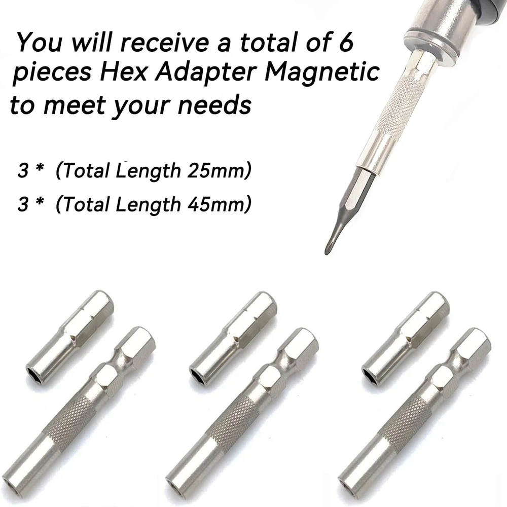 1/4 to 4mm Bit Adapter, Hex Screw Driver Bit Adapter Magnetic,6.35mm Outside To System 4mm Inside Micro Bit Drill Extension Socket Shank for Precision Bits Set Screwdriver Converter (6) Item Length 25 Millimeters Material Alloy Steel Drive System Hex Finish Type Polished About this item The High Hardness Alloy Steel Standard 6.35mm 1/4" Outside To System 4mm Inside Micro Bit Hex Socket Shank, 3 Pieces 1/4 to 4mm Hex Adapter Magnetic(Total Length 25mm) and 3 Pieces 1/4 to 4mm Drill Extension Bit holderer for Micro Bits(Total Length 45mm) The 1/4 inch to 4mm bit adapter made of premium quality modified tool steel with high hardness, Extra hard with natural finish for durability and strength The 1/4 to 4mm hex Micro Bit Socket Shank Converter for Manual Electric Tool Adaptor holderer Precision Bits Set Screwdriver Converter Fits 1/4" 6.35mm Handle The 1/4 inch to 4mm bit adapter with strong magnetic can holder the micro bits tightly.which could help you work more efficiently Package include: 3 Pieces 1/4 to 4mm Hex Adapter Magnetic(Total Length 25mm) and 3 Pieces 1/4 to 4mm Drill Extension Bit holderer for Micro Bits(Total Length 45mm).You will receive a total of 6 pieces to meet your usage needs.Please Check The Size You Need Before Buying