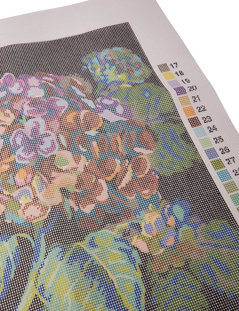 Create a stunning and vibrant work of needlecraft art with the Hydrangea Bloom Needlepoint Kit! This beautiful design is printed on 12 mesh needlepoint canvas to make needlecrafting easy and fun! When you've finished stitching your design, hang it in a frame or stitch it into a decorative pillow! Needlepoint kit includes printed size 12 mesh canvas, thread, needle, and easy instructions. Completed needlepoint craft measures 14'' x 14''. Hydrangea Bloom needlepoint kit includes 12 mesh canvas printed in full color, thread, needle, and easy instructions. Completed floral needlepoint craft measures 14'' x 14''. Create a stunning and vibrant work of needlecraft art with the Hydrangea Bloom needlepoint kit! Brightly printed mesh needlepoint canvas and easy to instructions make stitching this blooming hydrangea flower easy and fun! Finish your hydrangea floral needlepoint with a frame or stitch it into a decorative pillow!