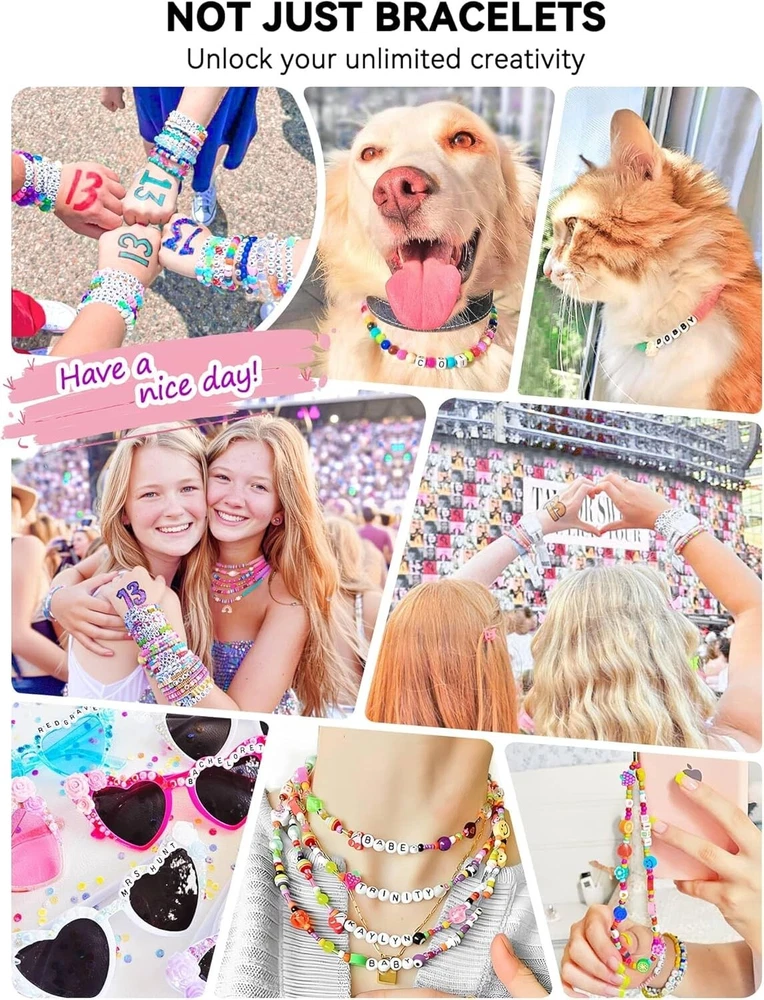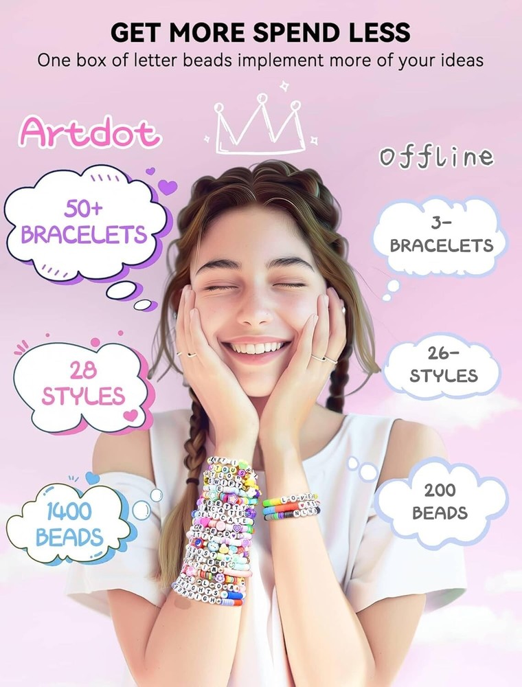 ARTDOT 1400 PCS Letter Beads, 28 Styles Friendship Bracelets Assorted Alphabet Preppy Jewelry Making Kit with Case About this item SHARE FRIENDSHIP BRACELETS - Making friendship bracelets with concert-inspired song titles or lyrics allows fans to express adoration for TS, and share friendship bracelets with other fans to bond with fellow enthusiasts. ALPHABETICALLY SORTED BEADS - The pre-sorted beads mean you don't need to spend time searching for the beads you need inside a pile of alphabet beads, thus ensuring a smoother crafting process filled with enjoyment. PERSONALIZED GIFT - Whether gifting this beads set directly or crafting it into jewelry beforehand, it’s a great gift that they can wear unique pieces with names or song lyrics to show off their love. WIDE RANGE OF COMBINATIONS - Explore endless creativity with our letter beads set, which includes 26 alphabet beads, heart beads, and smiley faces beads that can easily pair with clay beads, glass beads, pony beads, etc.