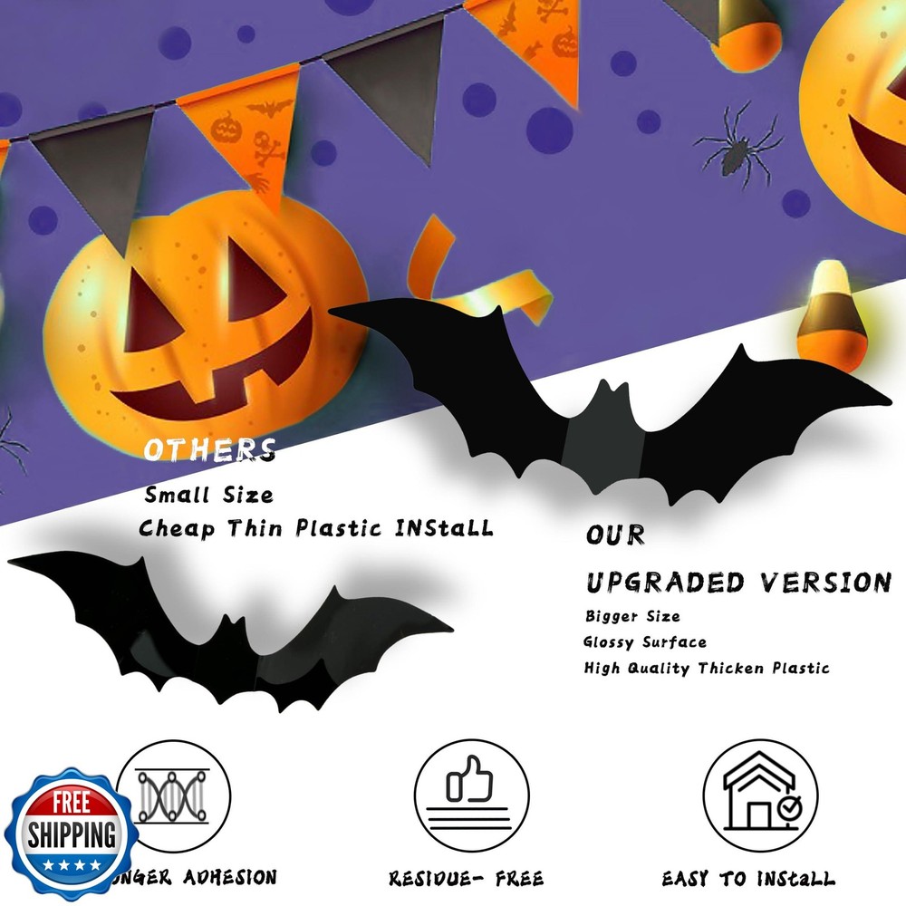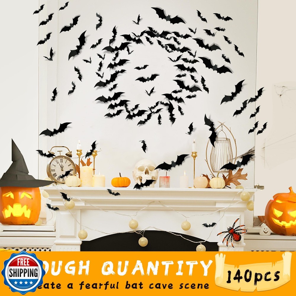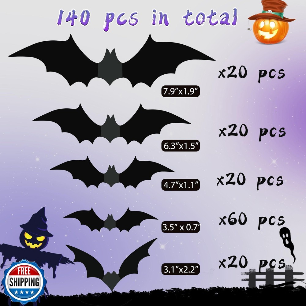 Halloween Party Supplies Hallween Decorations Bats Wall Decor 140PCS Realistic PVC 3D Black Scary Bat Sticker for Creepy Home Decor Halloween Party Decorations DIY Wall Decal Bathroom Indoor Halloween Decor Features Halloween Decorations: 140PCS Bats wall decor Halloween decor for your Halloween party decoration supplies. Fluttering Halloween bats stickers will set a scene indoor or outdoor during October, wow your guests and trick-or-treaters with these amazing Halloween bat decor! Bat Wall Decor: Halloween bats Decorations are black, enough quatity Halloween bats for party is a great choice for Halloween, Eve party, ghost festival and other occasions, bring some horror atmosphere to the Halloween party. Reusable Halloween Bats Decor: These 3D bats Halloween stickers decor made of waterproof PVC, removable and reusable. Fit any SMOOTH & DRY surface like cabinets, bookshelf, walls, doors and windows (REMEMBER to CLEAN the dust before using). Do not stick to the vents. Easy to Use: Hallween Bats stickers halloween decor Home decor comes with adhesive strips which is upgraded version of glue, good viscosity. Bats is flat packed, first DIY them into different wing angles then tape and stick. Arrange them as you like! Great project to do with kids, they will enjoy it! Size Upgraded Package: Halloween Decorative Bats Set of 140 scary bats in 5 different sizes. 20pcs 7.9"x 1.9", 20pcs 6.3"x 1.5", 20pcs 4.7"x 1.1", 60pcs 3.5"x 0.7", 20pcs 3.1"x 2.2" . Create your "bat cave" "halloween wreath"with these scary 3D felt bats for wall, all over the wall or window! How to Remove the Adhesive: Soapy water with Dawn dish soap will works for you. Or heat it with a hair dryer and take it off easily. lf there is sticky residue on the wall, it can bewiped with alcohol. Shipping Free & Fast Shipping: We offer free shipping to most of the USA with a normal delivery time of 3-7 days. However, due to the current situation, additional delivery time (up to 3 weeks) may be required for some items. Alternative Carriers: We may use alternative carriers (e.g., USPS, FedEx, UPS) to ensure your package arrives safely and on time. Due to the use of multiple carriers, we are unable to provide a tracking number automatically. Handling Time: Orders are processed and shipped within 1-2 business days of receiving cleared payment. Shipping Restrictions: Shipping to Alaska, Hawaii, Puerto Rico, Guam, and other US territories may incur shipping charges or delivery restrictions. Please contact us before ordering, or your order can be refunded/cancelled. State Restrictions: Certain items may not be shipped to California due to state regulations. Contact for Tracking Updates: If you require tracking updates or have any concerns about the delivery of your order, please feel free to contact us, and we will be happy to assist you. Return Policy 30-Day Hassle-Free Returns: If you are not completely satisfied with your purchase, you can return the item for free within 30 days of receiving it for a full refund or exchange. Easy Return Process: Contact us, and we will provide you with a prepaid return shipping label and detailed instructions. No Restocking Fee: There are no restocking fees for returns. However, the buyer is responsible for return shipping costs if the return is not due to a seller"s error. Refund Processing: Refunds will be processed within 1 business day of receiving the returned item in its original condition. Feedback Your feedback is extremely important to us. We strive to provide the best products and customer service possible. If you are satisfied with your purchase, please take a moment to leave us a positive review. If you have any concerns or issues with your order, please contact us before leaving negative feedback. We are committed to resolving any problems and ensuring your satisfaction. Contact Us If you have any questions or concerns, please feel free to reach out to our customer support team. You can contact us through the eBay messaging system. We are available Monday to Friday, 9:00 am to 5:00 pm EST, and we will do our best to respond to your inquiry within 24 hours. Thank you for supporting our small family business!