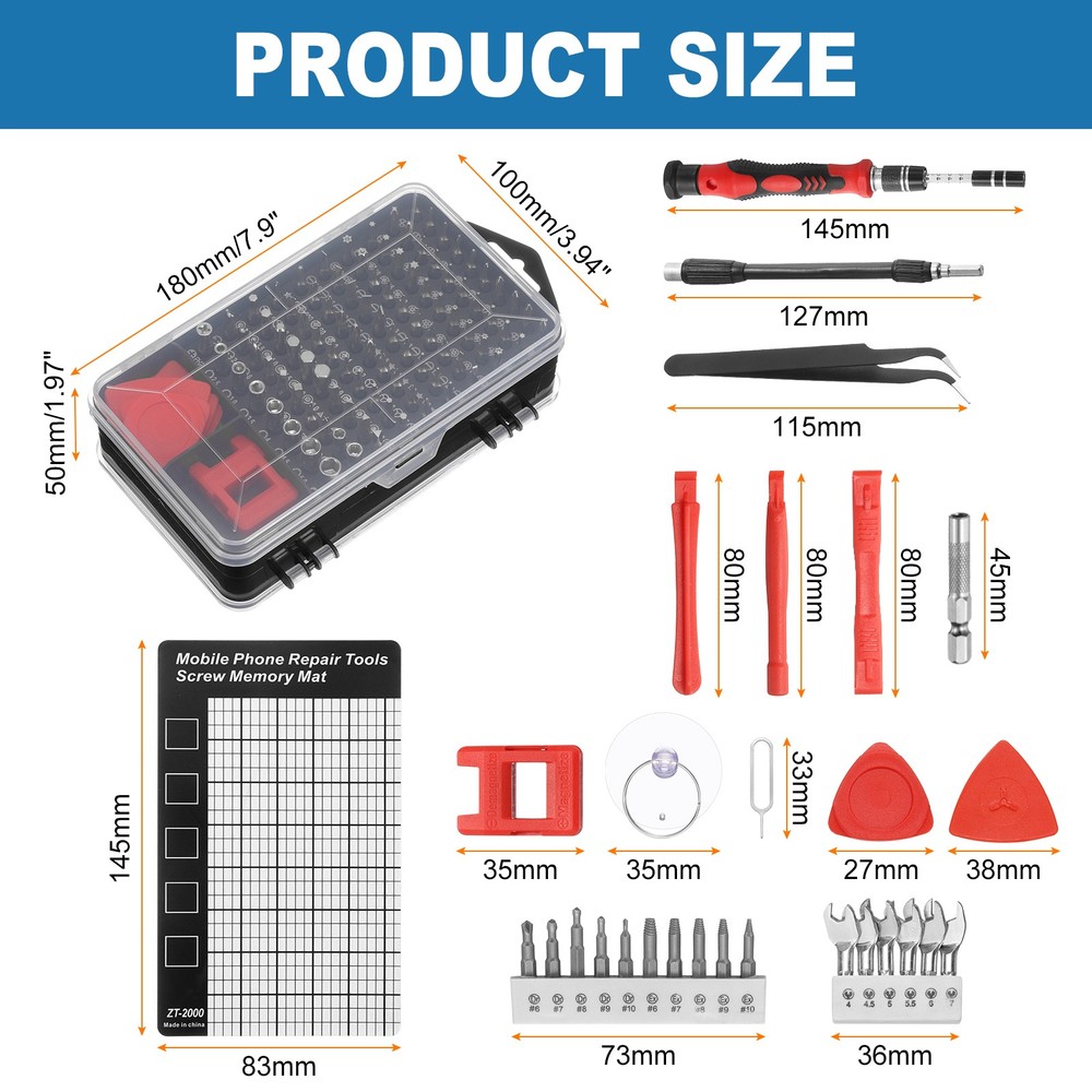 Document The precision drill bits are made of chrome vanadium steel, which is hard, corrosion-resistant, wear-resistant, sturdy and durable, and can be used for a long time.The screwdriver handle is made of granular grip and rubber, ergonomic handle, non-slip and wear-resistant, telescopic design, rotatable top, comfortable grip; the universal extension soft rod can be used to remove screws in narrow places.The magnetizer tool helps to enhance the magnetism of the screwdriver bits, making it easier to adsorb and fix screws, or weaken the magnetism to avoid potential damage or interference when handling items that are easily affected by magnetic field such as sensitive electronic devices.All screwdriver bits are neatly stored in rubber drill bit holders and are labeled with type and size for quick identification. The repair tools are packed in a box, so there is no need to worry about anything getting lost. It is easy to carry and can be easily placed in various places such as home, office, vehicle or drawer, which helps keep the workplace clean and organized, while also ensuring that the tools are easy to find and readily available.The 140-in-1 mini screwdriver set is magnetic and easy to remove and install small screws. It is suitable for repairing electronic products and high-precision instruments such as mobile phones, tablets, laptops, PCs, game consoles, cameras, precision instruments, watches, glasses, etc., and is used to repair various parts of electronic devices. 140 in 1 Magnetic Precision Screwdriver Set Electronics Repair Tools Kit, Red The precision drill bits are made of chrome vanadium steel, which is hard, corrosion-resistant, wear-resistant, sturdy and durable, and can be used for a long time. The screwdriver handle is made of granular grip and rubber, ergonomic handle, non-slip and wear-resistant, telescopic design, rotatable top, comfortable grip; the universal extension soft rod can be used to remove screws in narrow places. The magnetizer tool helps to enhance the magnetism of the screwdriver bits, making it easier to adsorb and fix screws, or weaken the magnetism to avoid potential damage or interference when handling items that are easily affected by magnetic field such as sensitive electronic devices. All screwdriver bits are neatly stored in rubber drill bit holders and are labeled with type and size for quick identification. The repair tools are packed in a box, so there is no need to worry about anything getting lost. It is easy to carry and can be easily placed in various places such as home, office, vehicle or drawer, which helps keep the workplace clean and organized, while also ensuring that the tools are easy to find and readily available. The 140-in-1 mini screwdriver set is magnetic and easy to remove and install small screws. It is suitable for repairing electronic products and high-precision instruments such as mobile phones, tablets, laptops, PCs, game consoles, cameras, precision instruments, watches, glasses, etc., and is used to repair various parts of electronic devices. Hot Item Payment 1.We accept eBay payment . 2.Payment must be received within 7 business days of auction closing. Shipping 1.We ship to your eBay or Paypal address. Please make sure your eBay and Paypal address is correct before you pay. 2.Items will be shipped within 1-3 business day when we received payment. 3.Delivery time depends on destination and other factors. Description Policy 140 in 1 Magnetic Precision Screwdriver Set Electronics Repair Tools Kit, Red The precision drill bits are made of chrome vanadium steel, which is hard, corrosion-resistant, wear-resistant, sturdy and durable, and can be used for a long time. The screwdriver handle is made of granular grip and rubber, ergonomic handle, non-slip and wear-resistant, telescopic design, rotatable top, comfortable grip; the universal extension soft rod can be used to remove screws in narrow places. The magnetizer tool helps to enhance the magnetism of the screwdriver bits, making it easier to adsorb and fix screws, or weaken the magnetism to avoid potential damage or interference when handling items that are easily affected by magnetic field such as sensitive electronic devices. All screwdriver bits are neatly stored in rubber drill bit holders and are labeled with type and size for quick identification. The repair tools are packed in a box, so there is no need to worry about anything getting lost. It is easy to carry and can be easily placed in various places such as home, office, vehicle or drawer, which helps keep the workplace clean and organized, while also ensuring that the tools are easy to find and readily available. The 140-in-1 mini screwdriver set is magnetic and easy to remove and install small screws. It is suitable for repairing electronic products and high-precision instruments such as mobile phones, tablets, laptops, PCs, game consoles, cameras, precision instruments, watches, glasses, etc., and is used to repair various parts of electronic devices. Hot Item Payment 1.We accept eBay payment . 2.Payment must be received within 7 business days of auction closing. Shipping 1.We ship to your eBay or Paypal address. Please make sure your eBay and Paypal address is correct before you pay. 2.Items will be shipped within 1-3 business day when we received payment. 3.Delivery time depends on destination and other factors.