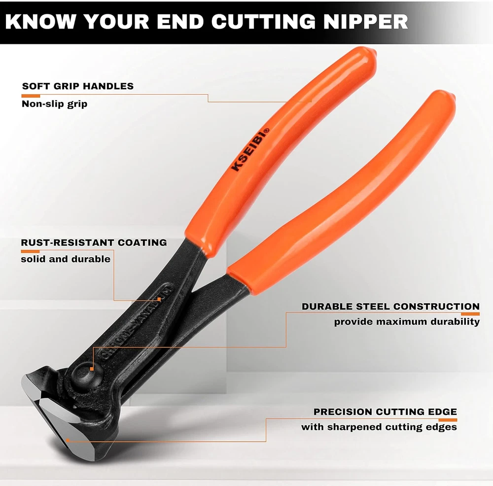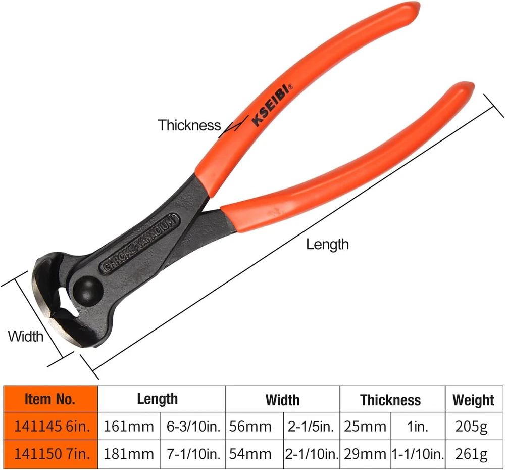 141150 End Cutting Pliers 7 Inch Grip Handle Black Finish Chrome Vanadium Steel KSEIBI 141150 End Cutting Pliers 7 Inch Grip Handle Black Finish Chrome Vanadium Steel Carpenter Pincer, Nippers Tool, Cat Paw, Nail Remover, Rivet Cutting Pliers, Steel Wire Cutter Construction Tool Product Description: The KSEIBI 141150 End Cutting Pliers are a versatile and durable tool designed for carpenters, contractors, and DIY enthusiasts. Made from high-quality chrome vanadium steel, these 7-inch pliers are perfect for cutting steel wires, nails, rivets, and other materials with ease. Featuring an ergonomic grip handle with a black finish, they offer excellent comfort and precision for both light and heavy-duty tasks. This tool is an essential addition to your toolkit for efficient and reliable cutting. Features: Durable Construction: Made from premium chrome vanadium steel, ensuring high strength and long-lasting performance in demanding tasks. Ergonomic Handle: Designed with a comfortable, non-slip grip handle for increased control and comfort during use. Versatile Cutting Capabilities: Ideal for cutting steel wires, nails, rivets, and other materials, making it a multi-purpose tool for various tasks. Compact Size: The 7-inch size provides a balance between portability and cutting power, perfect for both detailed and heavy-duty jobs. Black Finish: The sleek black finish on the handle offers enhanced durability, resistance to corrosion, and a modern aesthetic. Multi-Functionality: Works effectively as a cat paw, nail remover, and rivet cutter, making it suitable for a range of applications. Precision Cutting: The precision-engineered cutting edges ensure clean, accurate cuts, reducing effort and enhancing efficiency. Construction-Grade Tool: A must-have for carpenters, contractors, and anyone needing reliable cutting tools for construction or DIY projects. Part Number 1411 Batteries Required? No Color Orange Material Alloy Steel, Carbon Steel, Plastic Grip Type Ergonomic Specific Uses For Product Cutting, Twisting, Pulling, Nail Remover, Rivet Cutting Item Weight 0.32 Kilograms Handle Material Plastic,Pvc Handle,Steel Batteries Included? No Package Dimensions 9.72 x 3.7 x 1.1 inches Size 7-inch Shipping Fast shipping is very important for us. Our standard USA shipping service is FREE. Your order will be shipped within 1-2 business days upon full payment received. Your order will be delivered within 1-3 business days after the handling time. We only ship to the confirmed address. We reserve the right to cancel any order for any reason at any time. We are not responsible for undeliverable addresses. Returns and payment We offer a 30 days return policy from checkout winning date. FeedBack Your feedback very important to us, after you get your package and you are satisfied with our service please leave us positive feedback If you have any problem with your order / any questions please before leave any type of feedback For any questions, using eBay contact system Please visit our eBay store to check out other items for sale! Thank you for shopping at our store.
