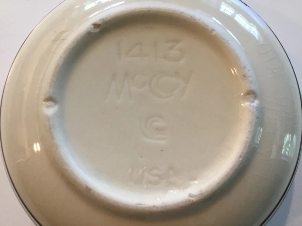 1413 McCoy Bowl USA Beige with two dark brown stripes. Crack on side. The bowl is used and has some scuff marks and scratches with a visible crack on the side. The bowl does not leak. This may be pottery but I am not certain. See photos. Sold “As Is”.