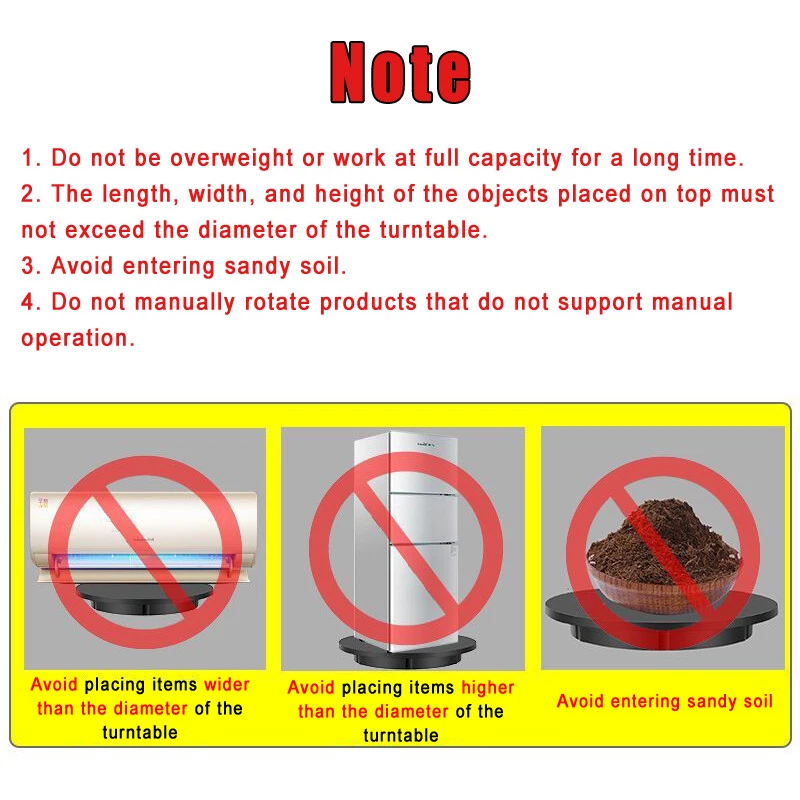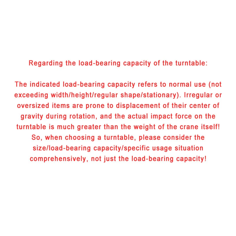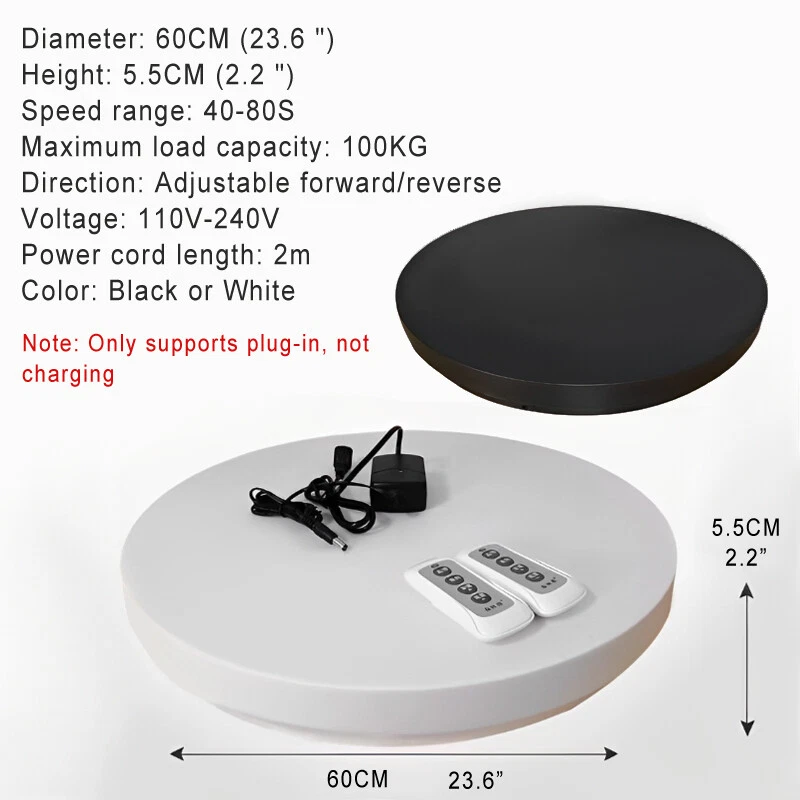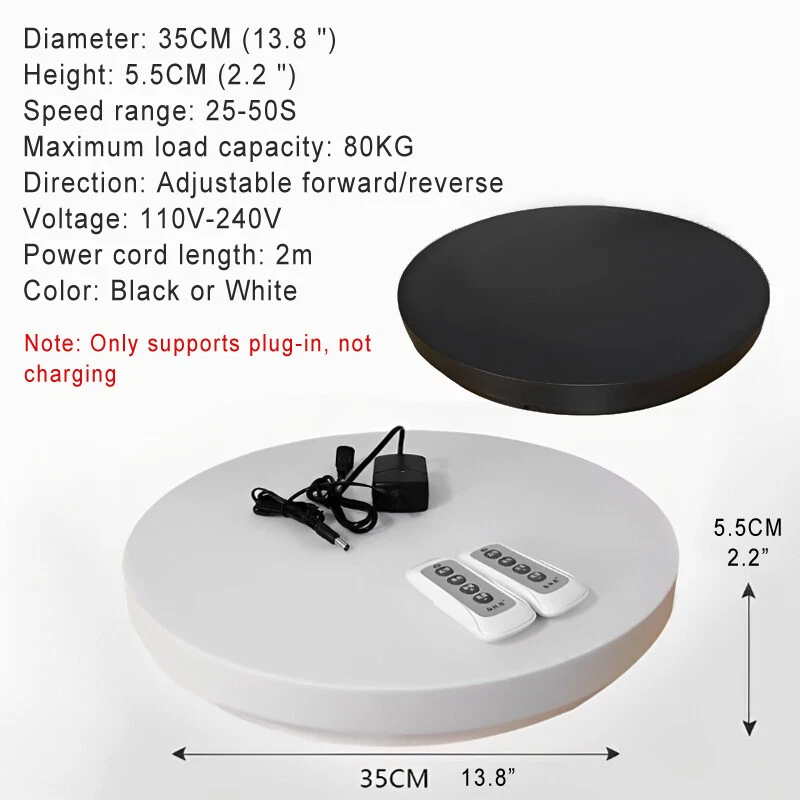 Store Categories Store Categories Lifestyle Home & Garden Tools Sports & Outdoor Electronic Dolls Batteries Accessory Other Product Description Feature: Long endurance Strong bearing capacity Stable and smooth rotation Bidirectional rotation Wide range of applications Remote control Specification: Diameter: 35CM/45CM/60CM Height: 5.5CM (2.2 ") Speed range: 25-50S /40-80S(Seven speed regulation) Maximum load capacity: 80/100KG Direction: Adjustable forward/reverse Voltage: 110V-240V Power cord length: 2m Color: Black or White Package Included 1 x Set of Electric Turntable Note: Only supports plug-in, not charging Regarding the load-bearing capacity of the turntable: The indicated load-bearing capacity refers to normal use (not exceeding width/height/regular shape/stationary). Irregular or oversized items are prone to displacement of their center of gravity during rotation, and the actual impact force on the turntable is much greater than the weight of the crane itself! So, when choosing a turntable, please consider the size/load-bearing capacity/specific usage situation comprehensively, not just the load-bearing capacity! Payment Policy Delivery details Terms of sales About us Contact us Payment Policy 1. We accept PayPal only. 2. All major credit cards are accepted through secure payment processor PayPal. 3. Payment must be received within 7 business days of auction closing. 4. If you have bought multiple items from me, you can send me one payment for all the items instead of paying for them individually. When you click the Pay Now button, eBay will automatically determine if there are other items you have won or purchased from me and will combine them for your review. 5. NOTE: Import duties, taxes and chargers are not included in the item price or shipping charges. These charges are the buyer's responsibility. Please check with your country's customs office to determine what these additional costs will be prior to bidding buying. Delivery details 1. We Ship to Worldwide. 2. Items will be shipped within 7-14 business day on payment received. 3. Item are shipped from Shenzhen using Airmail, reach most of the countries within 10 to 35. 4. Delivery time depends on destination and other factors, it may takes up to 40 business days. 5. We are not responsible for undeliverable address, we reserve the right to charge the shipping fee again for returned items due to wrong address. 6. If you do not receive your item by 30 business days, Please feel free to contact us via ebay mail system, we will try our best to resolve any problems with you. Terms of sales 1. You have 7 day to contact us and 10 days to return it from the date it was received. If this item is in your possession more than 7 days, it is considered used and WE WILL NOT ISSUE YOU A REFUND OR REPLACEMENT.There are NO EXCEPTIONS! 2. All Returned items Must Be in the original packaging and you MUST PROVIDE us with the shipping tracking number, specific reason for the return,and your ebay ID. 3. We will refund YOUR FULL WINNING BID AMOUNT, upon receipt of the item in its original condition and packaging with all components and accessories included, AFTER BOTH Buyer and Seller cancel the transaction form ebay.OR, you may choose to have a replacement. 4. Return shipping is to be paid by the Buyer. About us 1. We strive for our customer satisfaction at best possible. If you have any questions, please feel free to email our service specialists 24 Hours a Day, 7 Days a week. We will reply you ASAP. If no response within 24 Hours, please check the spam in your mail box. 2. We greatly appreciate your POSITIVE feedback. Please do NOT leave negative feedback without asking for help. Our aim is to provide Top Level Customer Service, normally so we will try our best to solve any problem you have. 3. Please DON'T leave negative or neutral feedback if you haven't received item in 30 days, because we have mentioned the shipping time repeatedly. Contact us Our customer-oriented service strives for positive feedbacks with all 5 star selling ratings . Please feel free to contact us via eBay message once you have any question before you giving us negative feedback or open case. Business time: GMT8 (9:00-18:00) from Monday to Friday Copyright © 2023 Dianxiaomi