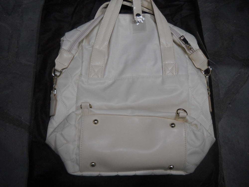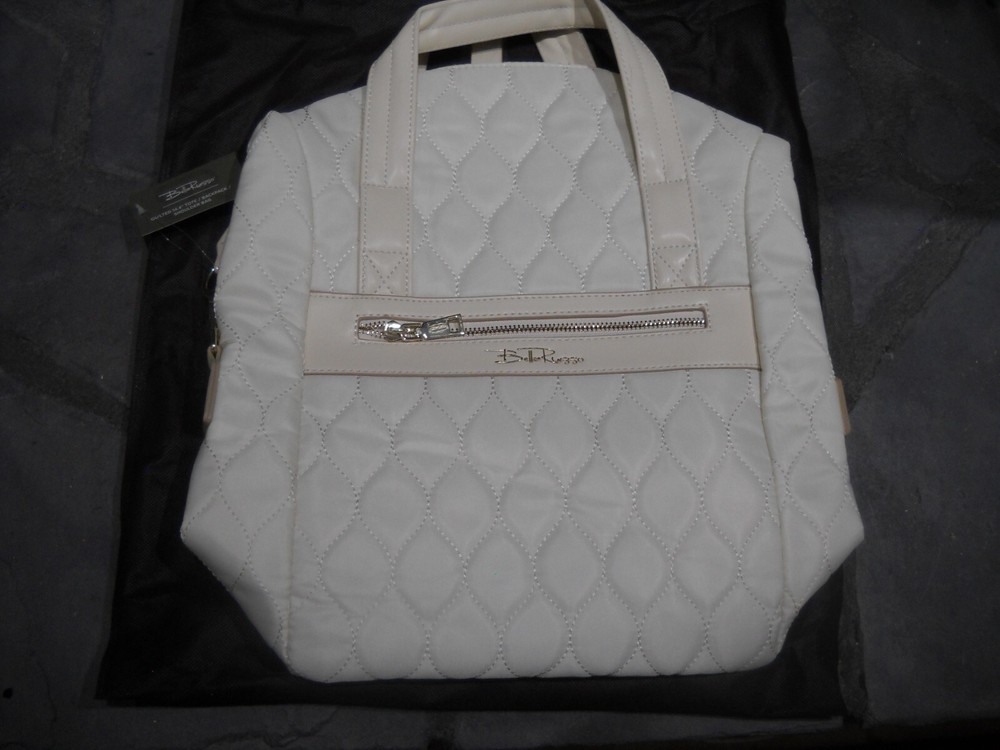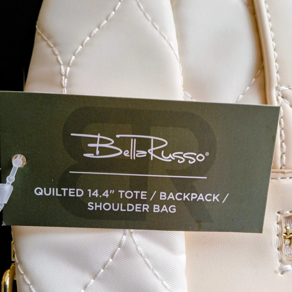 Bella Russo shoulder bag. With a solid ivory color and quilted finish, it's both stylish and functional. The bag has a zip closure and features stitching accents, adding a touch of designer flair. Measuring 13 inches in width, 14 inches in height, and 5 inches in depth, this lightweight bag has plenty of room for all your essentials. The adjustable strap ensures a comfortable fit, while the interior pockets provide ample storage space. Made from a combination of polyester, nylon, and vinyl, this bag is both durable and fashionable.