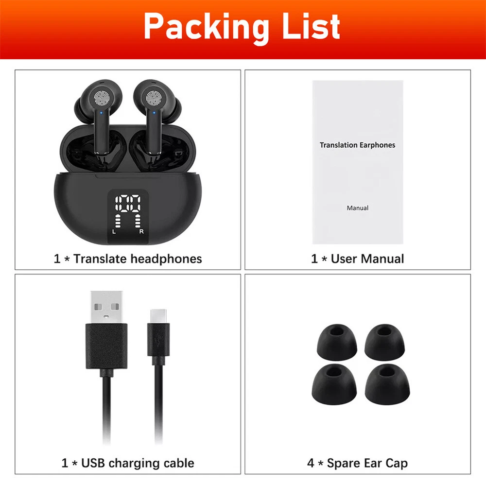 Product Description 144+ Language Translator Earbuds Wireless Bluetooth Two Way Translator Device Features: - These earbuds support two-way real-time translation in 144 languages with up to 97% accuracy, enabling seamless cross-language communication. - Easily pair the earbuds with your mobile phone via Bluetooth for simultaneous interpretation in touch or speaker mode, while also supporting music playback and call functions. - The intuitive touch controls allow you to play music or answer/reject calls conveniently, with advanced noise cancellation ensuring clear conversations and 97% accuracy within just 1 second. - Built-in charging indicator lights help you monitor battery levels, and the USB-compatible charging case ensures your earbuds stay powered on the go. - The lightweight, ergonomic design fits the shape of the human ear, providing long-lasting comfort and an immersive music experience. Specifications: BT Version: BT 5.3 Battery Capacity: 5V/1Ah Li-polymer button battery Charging Case: 5V/1Ah Li-polymer battery Working Time: 4-6Hours Charging Interface: Type-C Packing list: 1 x Translate headphones 1 x User Manual 1 x USB charging cable 4 x Spare Ear Cap Note: 1. Offline translation requires extra payment. If you don't need it, you don't need to spend money to buy it. 144 free online languages. 2. It needs to be used in conjunction with the app. Scan the code to download the app, and the standard version will be shipped for free for one year. TRANSLATOR EARPHONE -SUPPORT 144+LANGAGES: South Africa Dutch language, Albanian language, Amharic, Arabic (Algeria), Arabic (Bahrain), Arabic (Egypt), Arabic (Iraq), Arabic (Israel), Arabic (Jordan), Arabic (Kuwait), Arabic (Lebanon), Arabic (Morocco), Arabic (Oman), Arabic (Qatar) Arabic (Saudi Arabia), Arabic (the State of Palestine), Arabic (Tunisia), Arabic (the United Arab Emirates), Arabic (Yemen), Armenian language, Azerbaijani language, Basque language, Bosnian language, Burmese language, Bengali language (Bangladesh), Bengali language (India), Bulgarian language, Catalan language, Chinese (Simplified), Chinese (Traditional) Chinese (Cantonese), Croatian language, Czech language, Danish language, Dutch language (Belgium), Dutch language (Netherlands), English (Australia), English (Canada), English (Ghana), English (Hong Kong), English (India), English (Ireland), English (Kenya), English (New Zealand), English (Nigeria), English (Philippines), English (Singapore), English (South Africa) English (Tanzania), English (United Kingdom), English (United States), Estonian language, Filipino language, Finnish language, French (Belgium), French (Canada), French (France), French (Switzerland), Galician language, Georgian language, German (Austria), German (Germany), German (Switzerland), Greek, Gujarati language, Hebrew language, Hindi, Hungarian language, Icelandic language Indonesian language, Italian (Italy), Italian (Switzerland),Japanese, Javanese language, Kannada, Kazakh language, Khmer language, Korean, Lao language, Latvian language, Lithuanian language, Macedonian language, Malay language, Malayalam, Marathi language, Mongolian language, Nepali language, Norwegian language, Persian language, Polish language, Portuguese (Brazil), Portuguese (Portugal), Punjabi language Romanian language, Russian, Serbian language, Sinhala language, Slovak language, Slovene language, Spanish (Argentina), Spanish (Bolivia), Spanish (Chile), Spanish (Colombia), Spanish (Costa Rica), Spanish (Dominican Republic), Spanish (Ecuador), Spanish (El Salvador), Spanish (Guatemala) Spanish (Honduras), Spanish (Mexico), Spanish (Nicaragua), Spanish (Panama), Spanish (Paraguay), Spanish (Peru), Spanish (Puerto Rico), Spanish (Spain), Spanish (United States), Spanish (Uruguay), Spanish (Venezuela), Sundanese language, Swahili language (Kenya) Swahili language (Tanzania), Swedish language, Tamil language (India), Tamil language (Malaysia), Tamil language (Singapore), Tamil language (Sri Lanka), Telugu language, Thai, Turkish language, Ukrainian language, Urdu (India), Urdu (Pakistan), Uzbek, Vietnamese language, Zulu language TRANSLATOR EARPHONE -SUPPORT 8 OFFLINE LANGAGES : Supports 8 precise offline usage options for payment: Chinese, English, Japanese, Korean, German, Spanish, Russian, and French