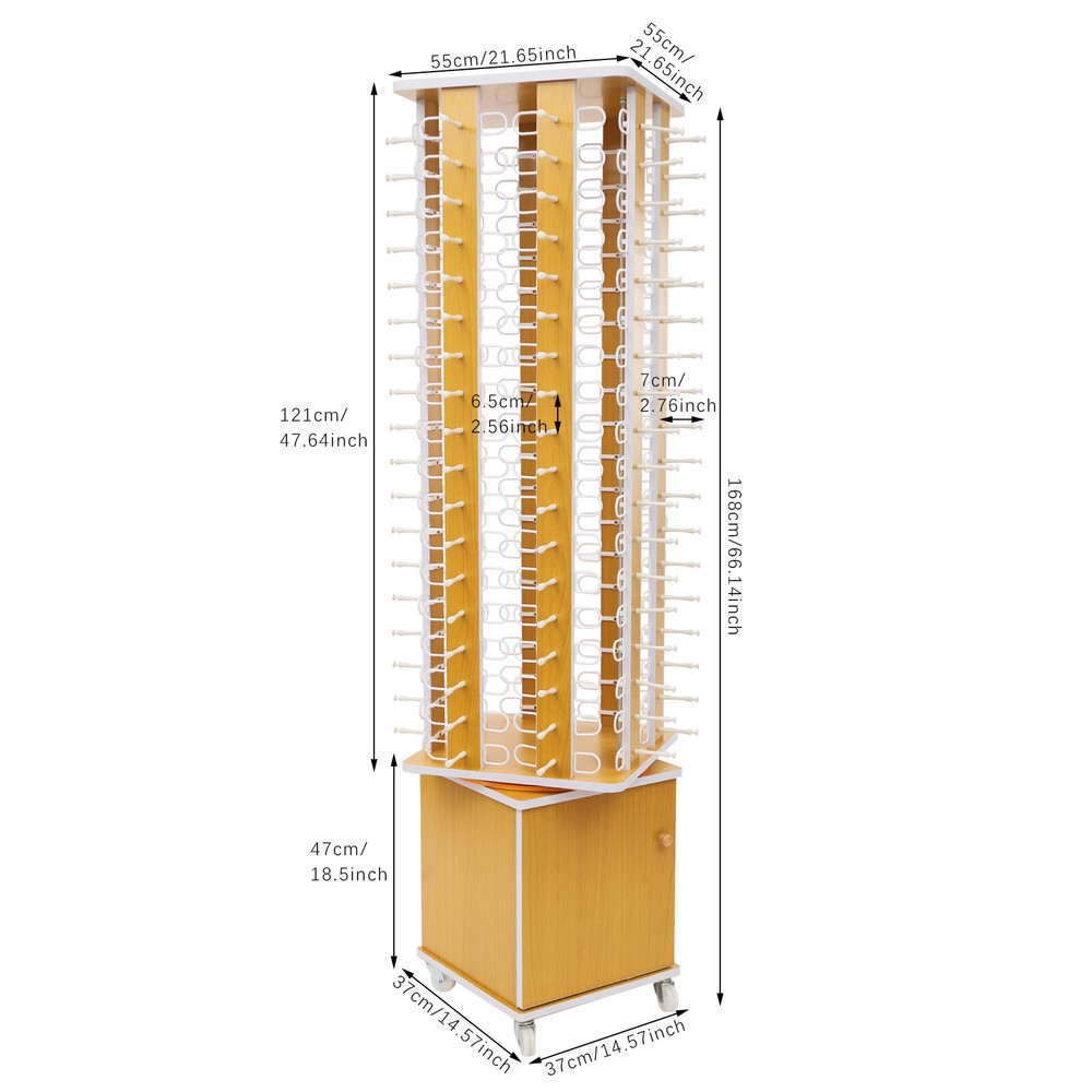144 Pair Sunglasses Display Rack Rotating Floor-standing Eyeglass Holder Description This eyeglass display stand is made of high-quality material and uses fine workmanship to ensure long service life. Its large capacity holds up to 144 pairs of eyeglasses, making it ideal for opticians with a large display or for eyewear enthusiasts who want to collect and store their eyeglasses. This is a fashionable and practical product, which is a wise choice for you. Specifications Color: Yellow Style: Modern Material: MDF Process: Carving Assembly Required: Yes Mounting Type: Freestanding Capacity: 144 Pairs Eyeglasses Number of Wheels: 4 Tier Spacing: 6.5cm/2.56in Each Eyeglass Holder Length: 7.5cm/2.95in Bottom Box Size: 37*37*47cm/14.57*14.57*18.5in Top Surface Size: 55*55cm/21.65*21.65in Product Overall Height: 168cm/66.14in Rack Height: 121cm/47.64in Each Bottom Box: Package Size: 48*48*51cm/18.9*18.9*20.08in Gross Weight: 20kg/44.09lbs Net Weight: 18kg/39.68lbs Each Display Rack: Package Size: 127*12*15cm/50*4.72*5.91in Gross Weight: 8kg/17.64bs Net Weight: 7kg/15.43lbs Package Included 1* Eyeglass Display Rack 1* Bottom Box 1* English Installation Diagram All Accessories for Assembly Key Features High-quality M aterials: It is made of high-quality MDF and adopts a carving process , which is impact-resistant , strong, and not easy to deform to ensure long-term use. Large C apacity: It can hold up to 144 pairs of eyeglasses, allowing you to display a variety of styles of eyeglasses with ease. In addition, the bottom box makes it convenient to store glasses accessories, glasses cleaning solutions, glasses clothes, etc. (not included) Display Assist ant: The 360° rotation design makes this product display your glasses in all directions and allows you to reach without moving the stand. Excellent Stability: The square base, thick material, and groove design at the glasses holder rod ensure good stability, so you don't have to worry about tipping over or glass falling during use. High Space Utilization: It reasonably utilizes vertical space and has a compact footprint, which helps you to store more eyeglasses (not included) without taking up much space. Easy to Install: A full range of accessories, pre-drilled holes, a detailed installation diagram, and simple construction allow you to install and use this product quickly. Simple Cleaning: Thanks to its smooth surface and simple structure, you can easily clean it with a damp rag (not included). Ideal Gift: With a beautiful appearance and practical function you can give it as a great gift to your friends and family during the holidays or Christmas. Buy with Confidence: We stand behind all our guests and look forward to assisting you with your purchase. It is our pleasure to answer your confusion and questions. The end of the story between us is not "we sell and you buy". Details Scientific Spacing: The tier spacing between each glasses holder is 2.56 inches, which not only avoids overcrowding and wear on the lenses but also provides a better display effect. Practical Wheels: They allow you to move this product from one place to another with less effort. Rounded Corners and Edges: The corners are rounded and smooth to reduce collisions and improve safety. Application It is suitable for displaying and storing reading glasses, sunglasses, and other types of glasses. It can be used in eyeglass stores, shopping malls, eyeglass exhibitions, home storage of glasses, personal collections, and other venues. Notes Please carefully check if the size is suitable before placing an order. Please note that this product does not contain any eyeglasses. We send the eyeglass display rack and the bottom box separately to protect the product from damage during transportation. Please wait patiently for all parts to arrive. Please allow the slight color difference caused by the shooting light and 1-3cm error due to manual measurement, and make sure you do not mind before you order. Payment Delivery details Terms of sales About us Contact us Payment We accept ebay payment 。 Fees such as import duties, taxes are not included in the item price or shipping costs. These charges are the buyer's responsibility. Delivery details Shipping: 2-9 working days to: USA Terms of sales We maintain high standards of excellence and strive for hundred percent customer satisfaction. Feedback is very important to us. We hope that you contact us immediately before you give neutral or negative feedback, so that we can address your concerns. It is impossible to address issues if we do not know about them! About us Your satis faction is our ultimate goal. We work hard to earn your trust and future business. Our certified technicians have tested each item before shipping. The unit comes with 1 year limited warranty on all manufacturing defects. a) If you receive a defective item, you may return it or ask for a discount. Please contact us within 14 days after you receive the package. b) What you returned must be intact and in its original packaging as re? u. Customer is responsible for shipping costs of the returned item. c) We will cover the cost of shipping back t with the shipping rate indicated in the registration page. We will send you a new unit or refund the full payment you paid. Thank you. Contact us Business Hour Business Hour: Monday To Friday: 8:30 AM to 5:00 PM (Beijing China time) Due to time zones, our reply to your questions may not be immediately. But within above working time, we will reply your email within 24 hours. If it's non-workdays, please kindly be patient and wait till Monday. Please contact us with ebay message. Please feel free to contact us if you have any questions. Monday To Friday: 8:30 AM to 5:00 PM (Beijing China time) Due to time zones, our reply to your questions may not be immediately. But within above working time, we will reply your email within 24 hours. If it's non-workdays, please kindly be patient and wait till Monday. Please contact us with ebay mess